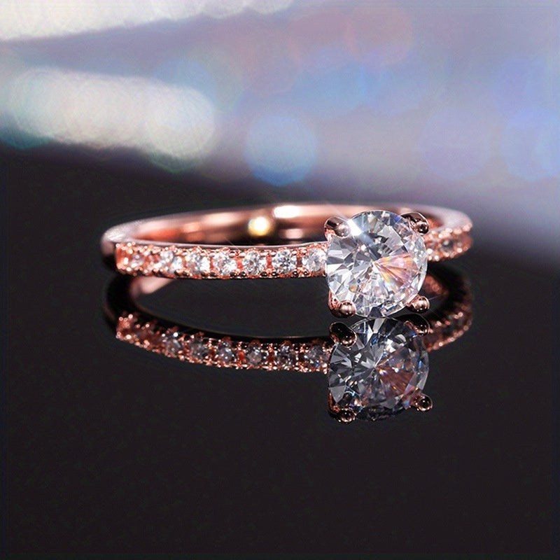 This stunning engagement ring features an artificial diamond set in a rose gold plated band adorned with zircon stones. The perfect proposal ring for a special moment.