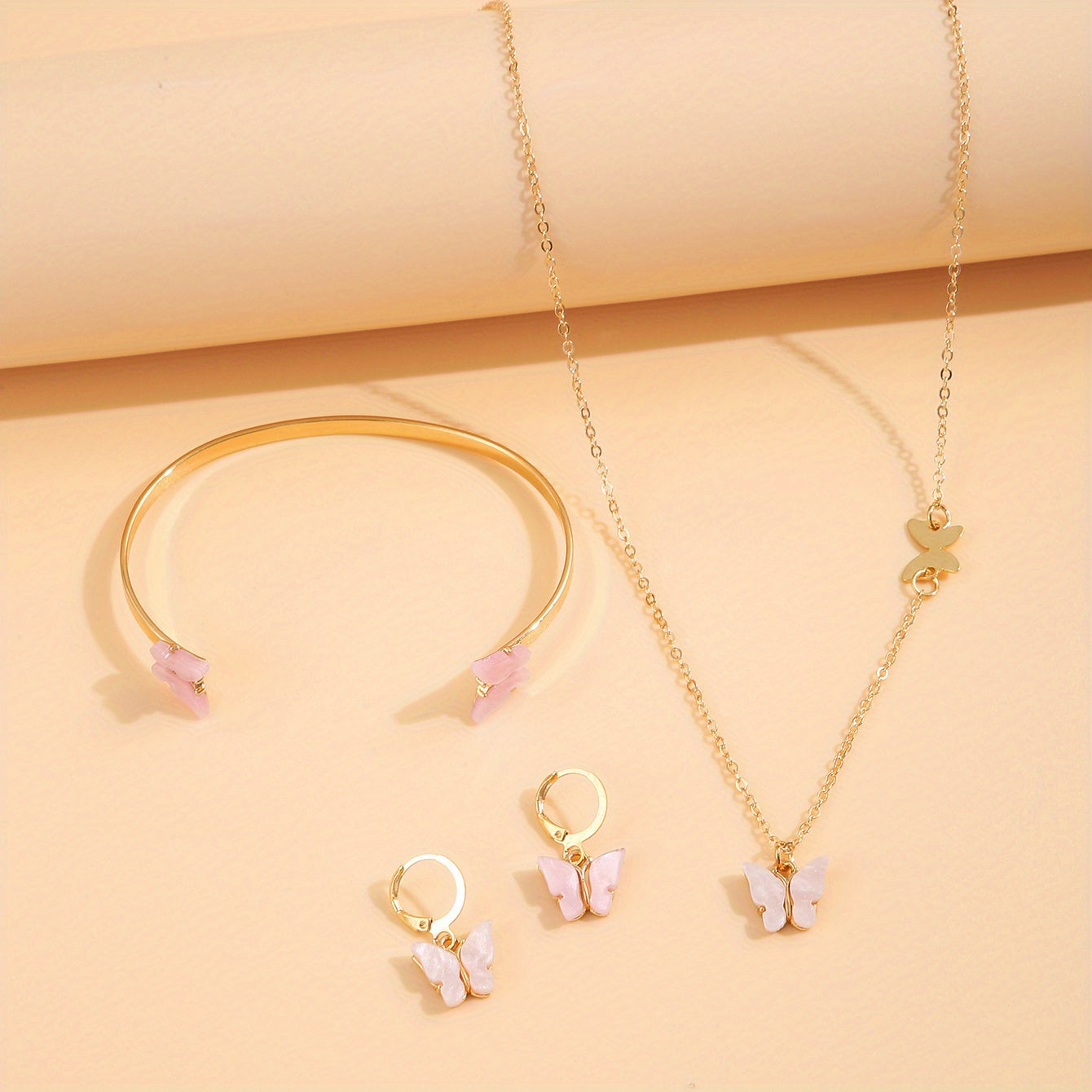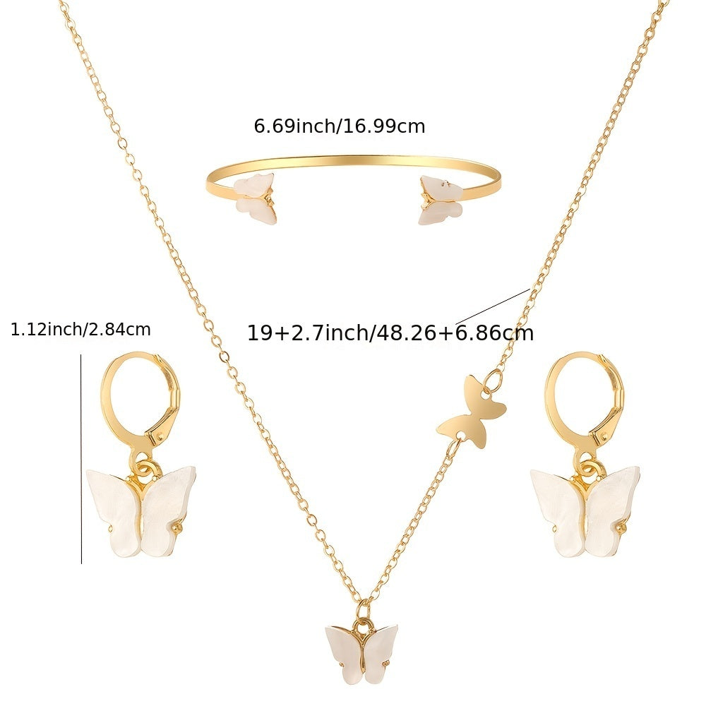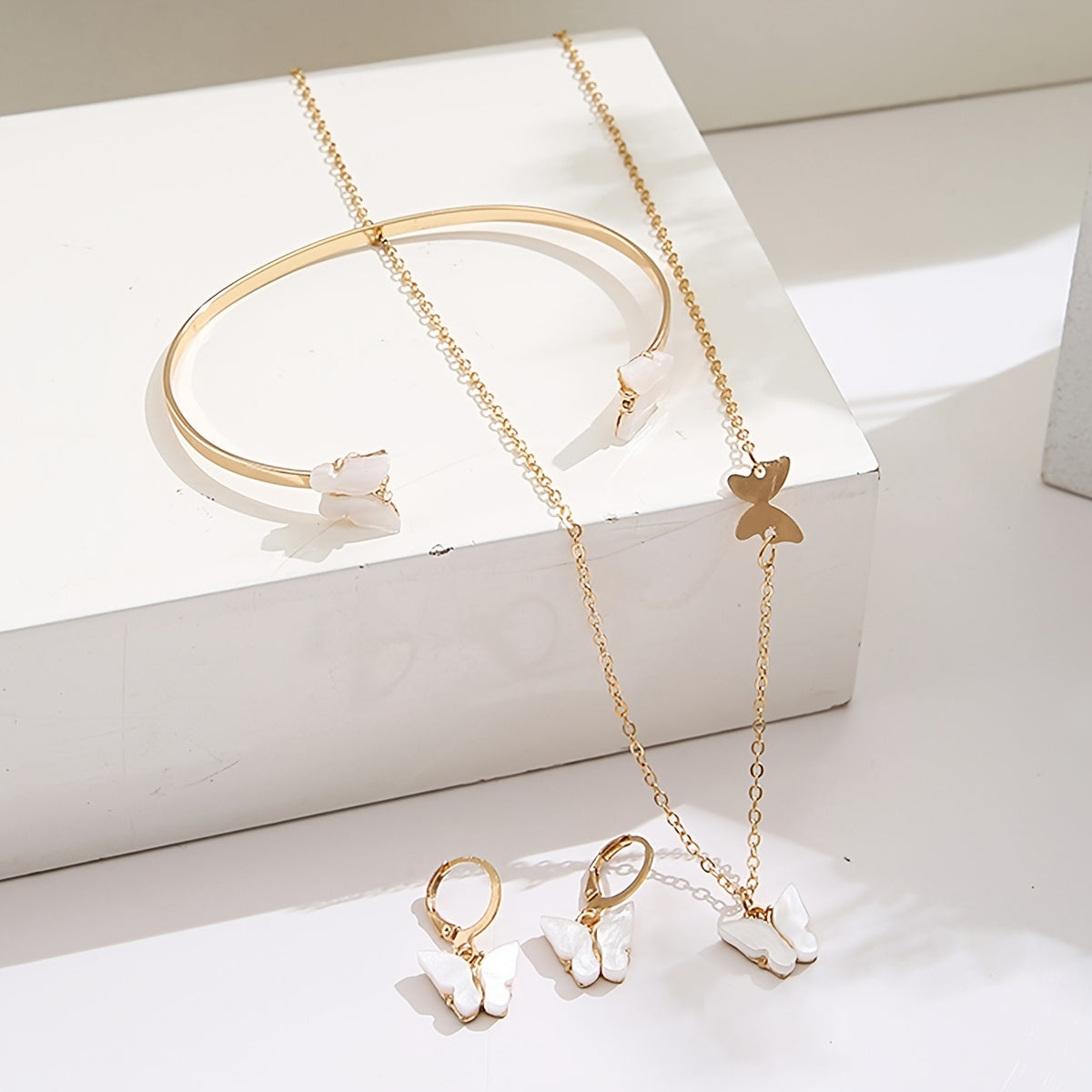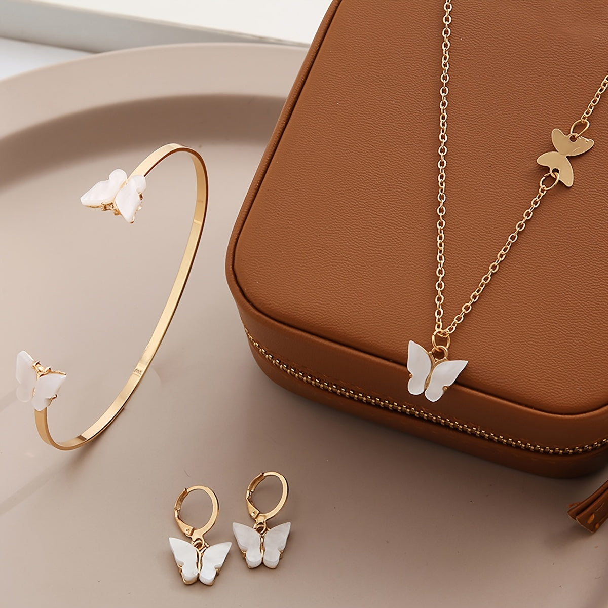 Elegant jewelry set featuring a butterfly theme with pendant necklace, open bangle bracelet, and hoop drop earrings. Ideal for women and girls as a birthday present.
