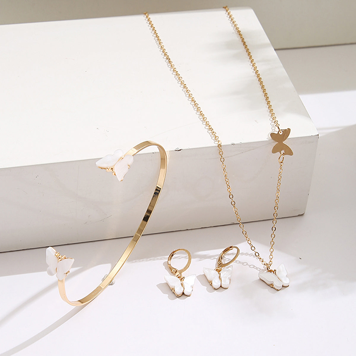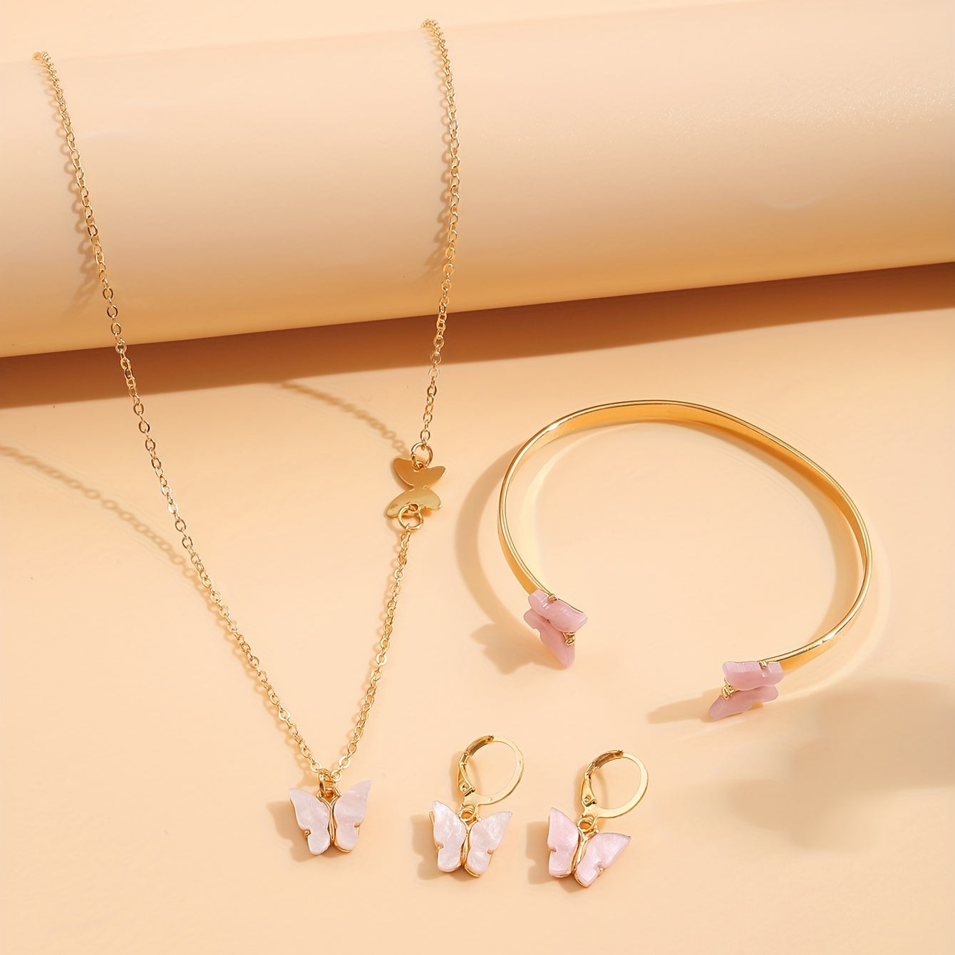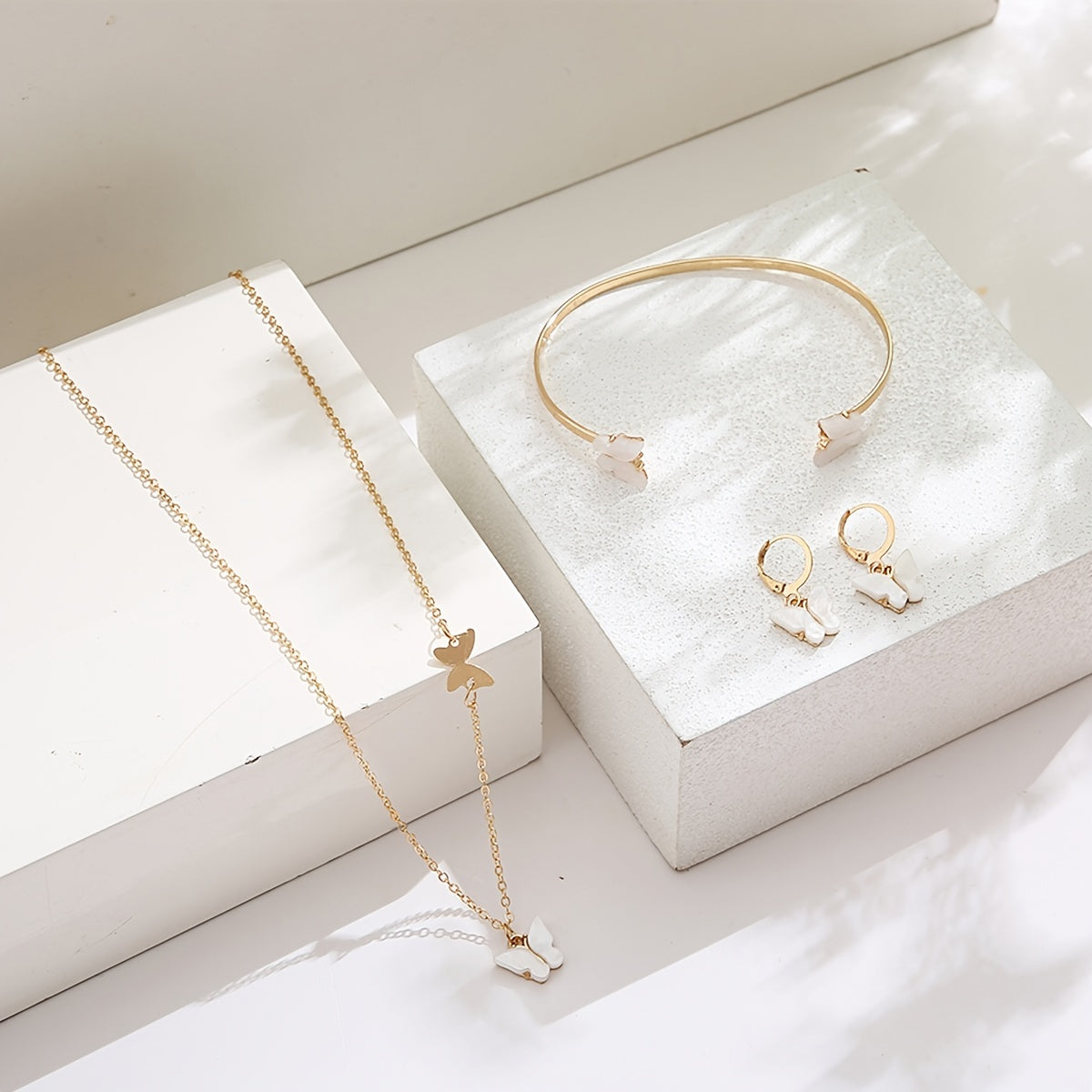 Elegant jewelry set featuring a butterfly theme with pendant necklace, open bangle bracelet, and hoop drop earrings. Ideal for women and girls as a birthday present.