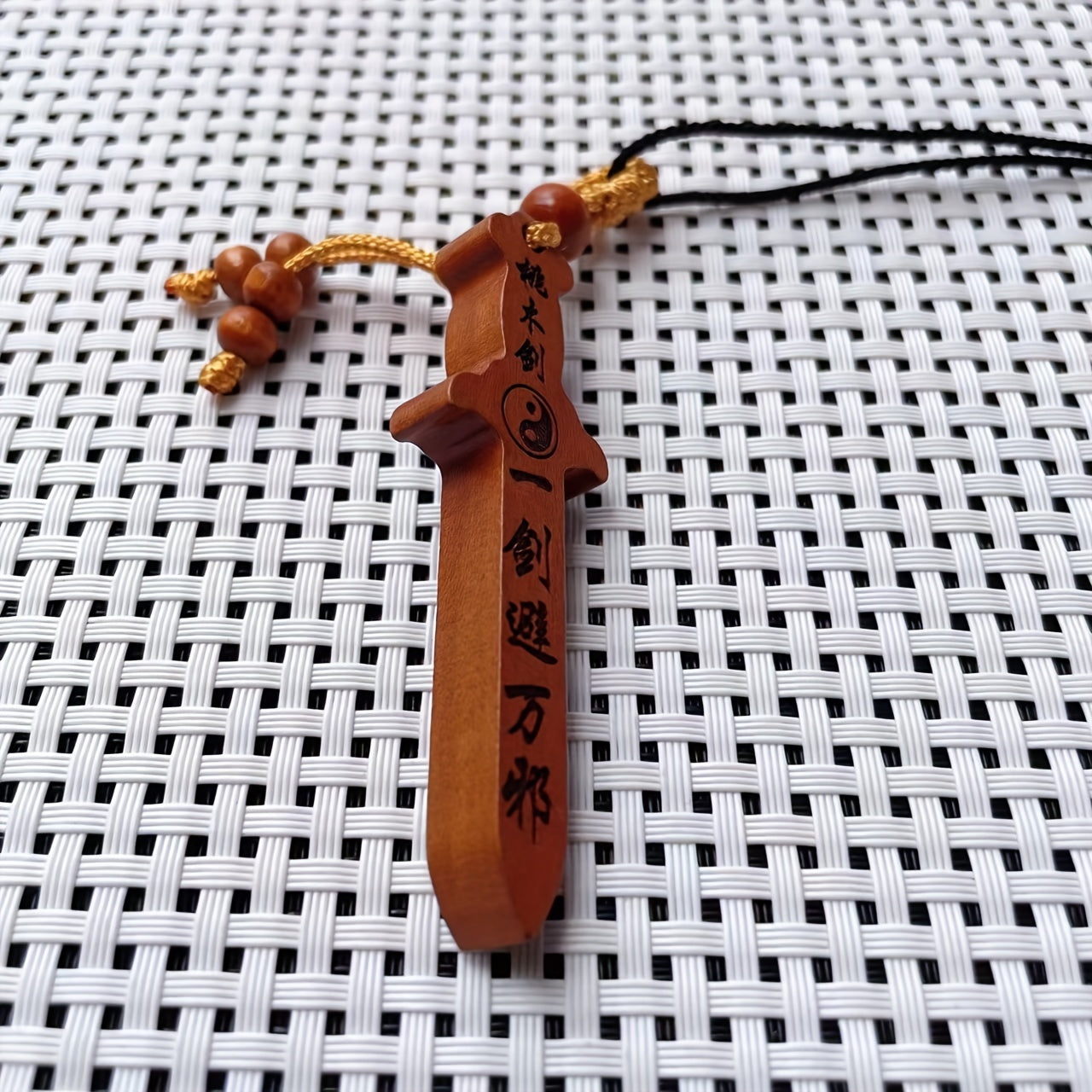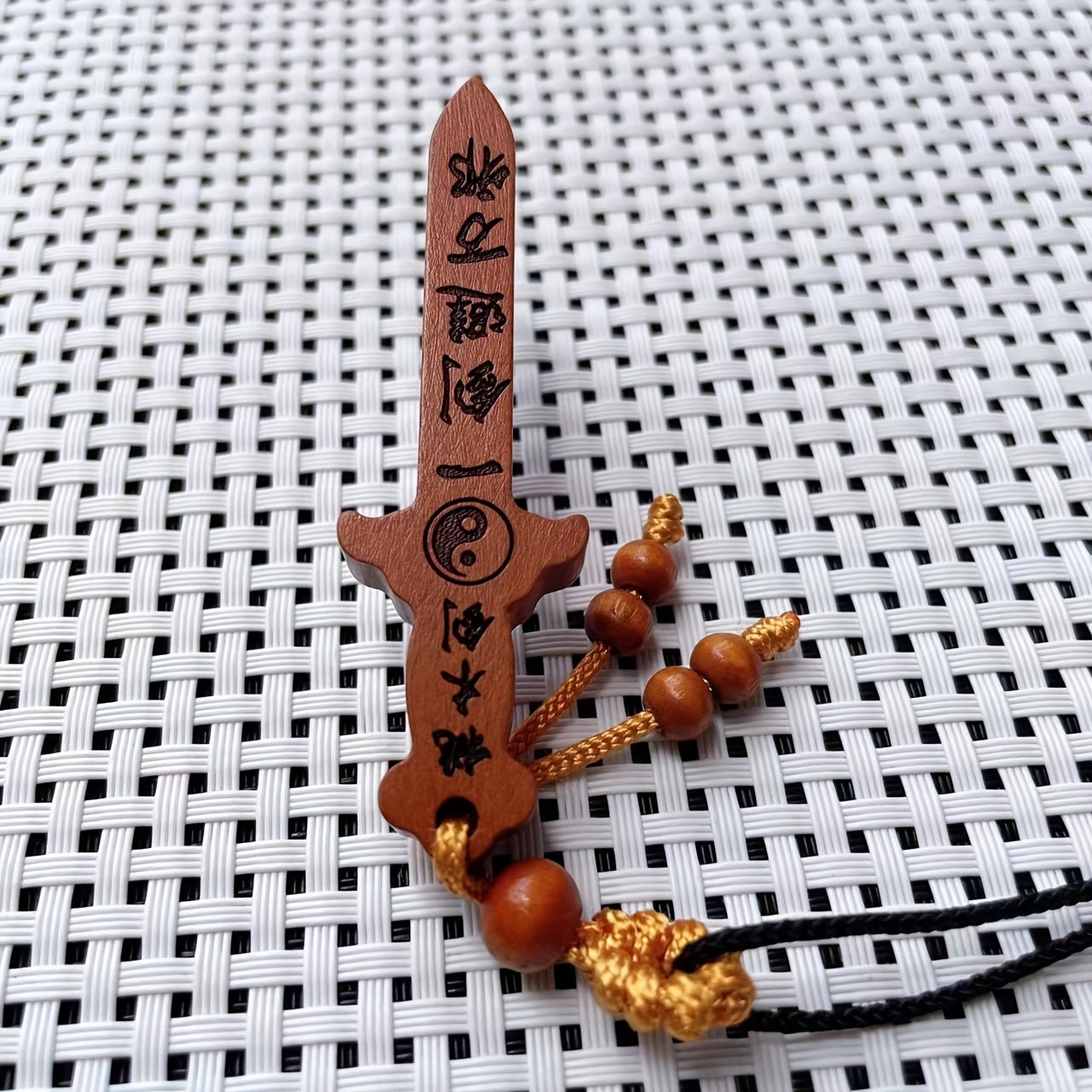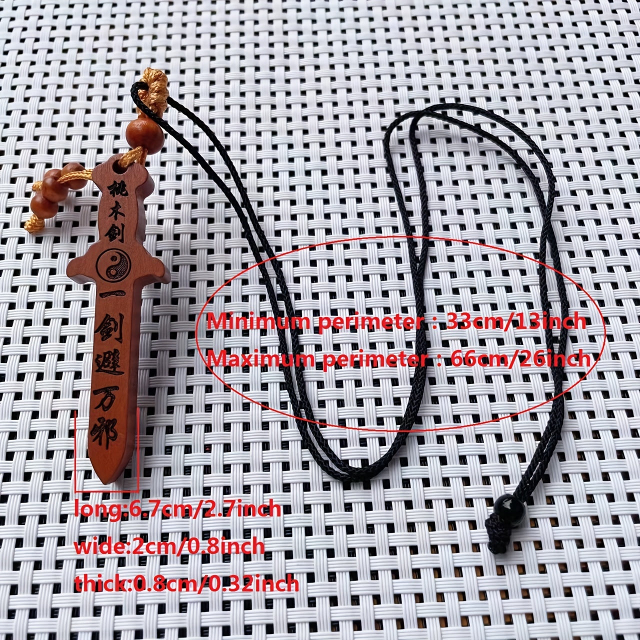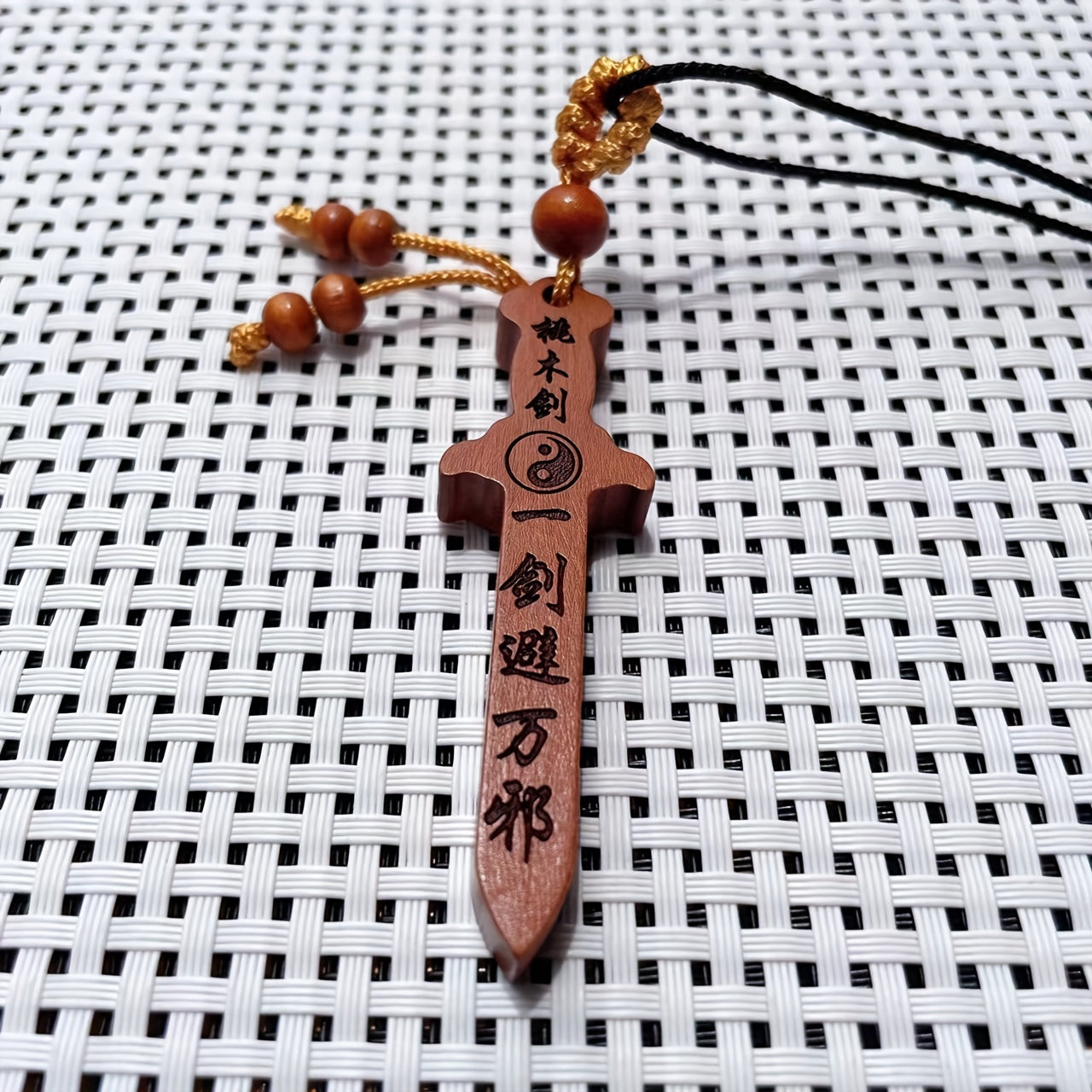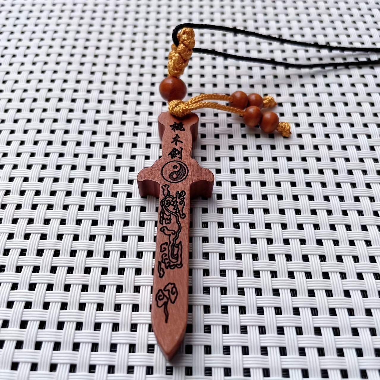 This creative carved peach wooden sword cross pendant necklace is a unique decorative accessory that is perfect for holiday parties or as a gift for men.