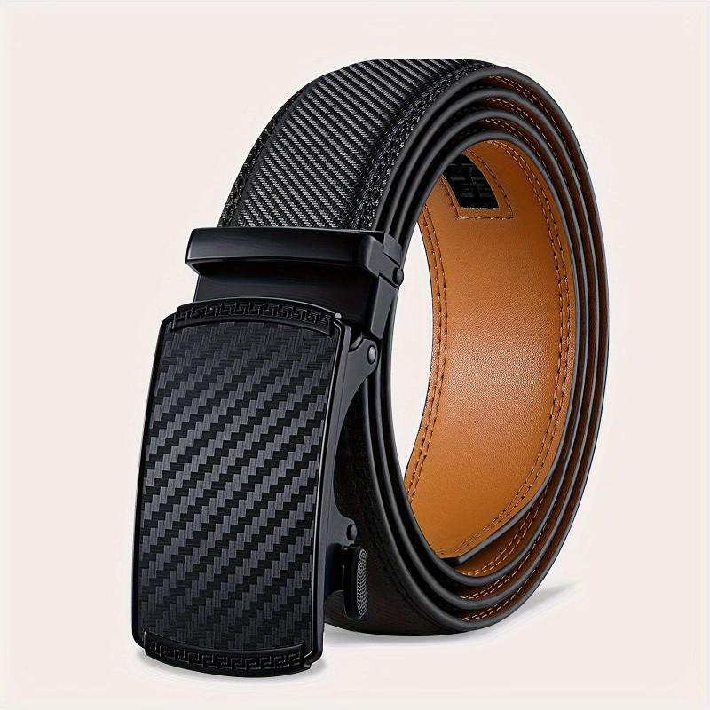 This men's leather belt features an automatic alloy buckle and ratchet slide design for adjustable fit. It is durable and versatile with a width of 35mm.