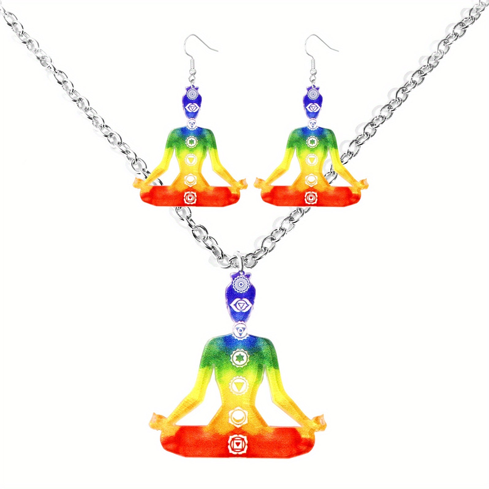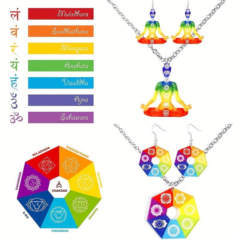 Enhance your meditation and yoga practice with this beautiful seven chakra jewelry set featuring a pendant necklace and drop earrings.