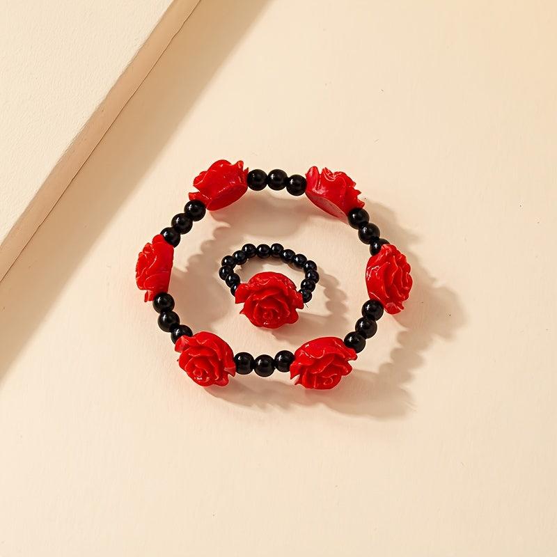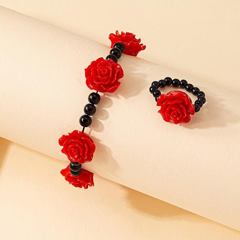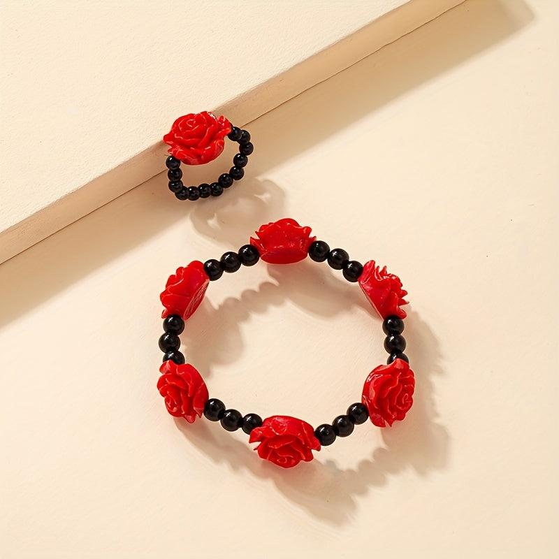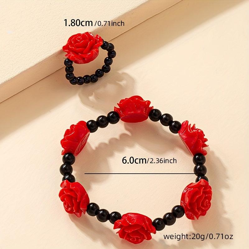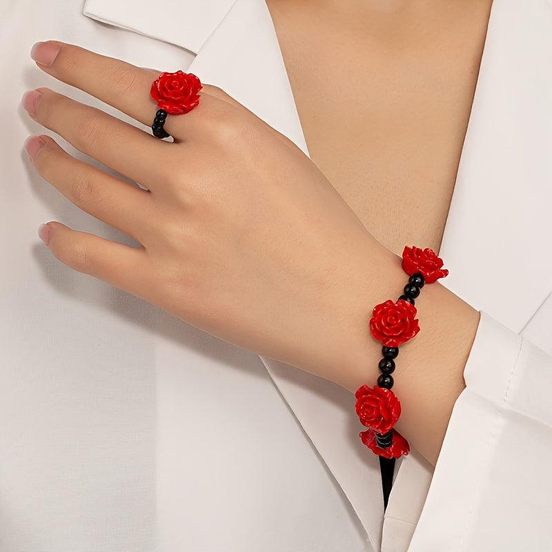 Elevate your everyday look with this stunning Chinese style acrylic rose bracelet and ring set. Perfect for adding a touch of elegance to any outfit.