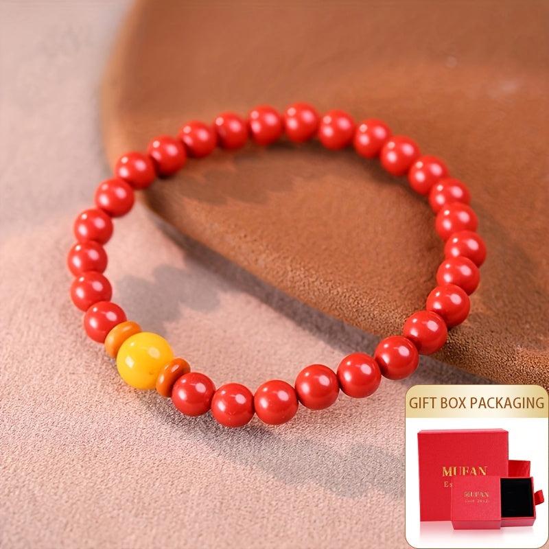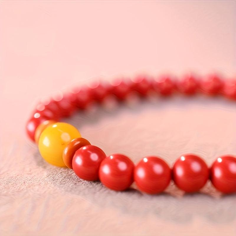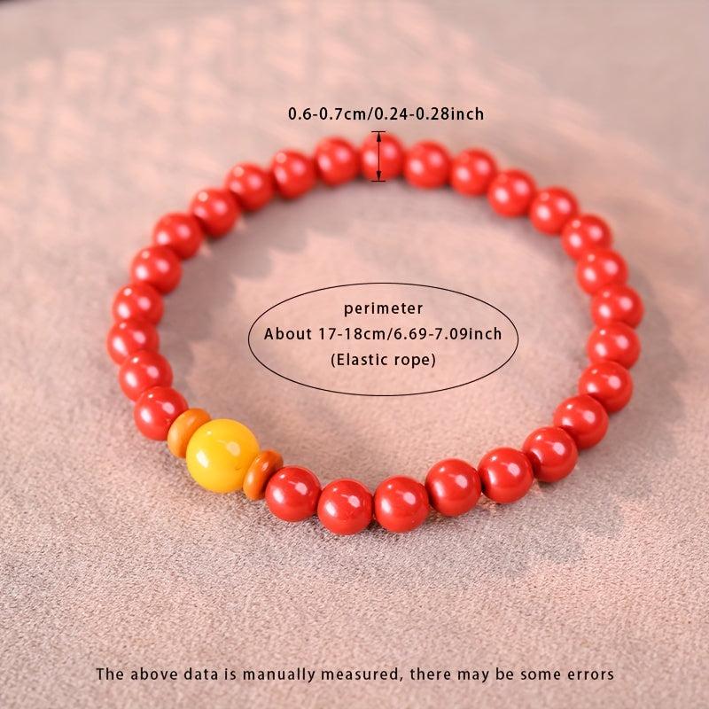 This stunning bracelet features Cinnabar stone beads with yellow amber accents, perfect for daily wear or as a gift for any occasion. The stretch cord ensures a comfortable fit.