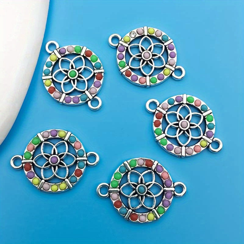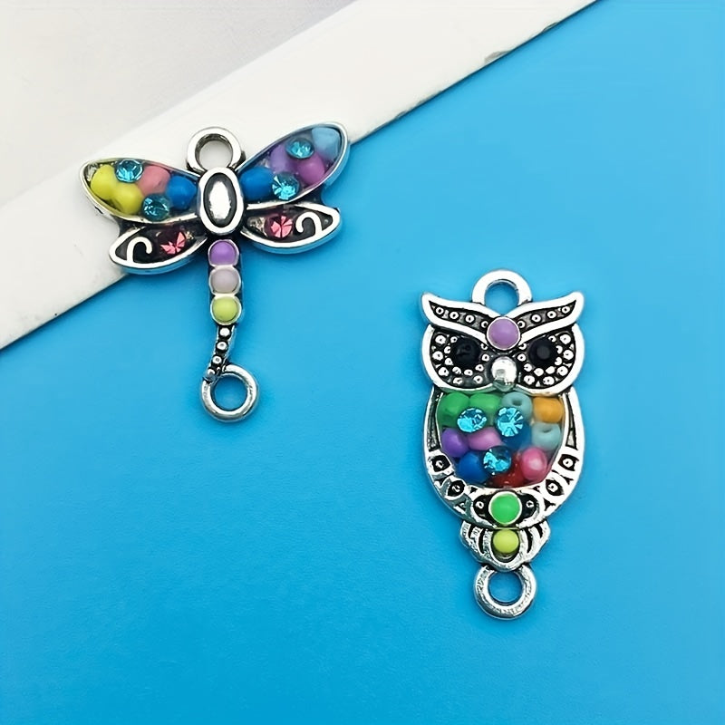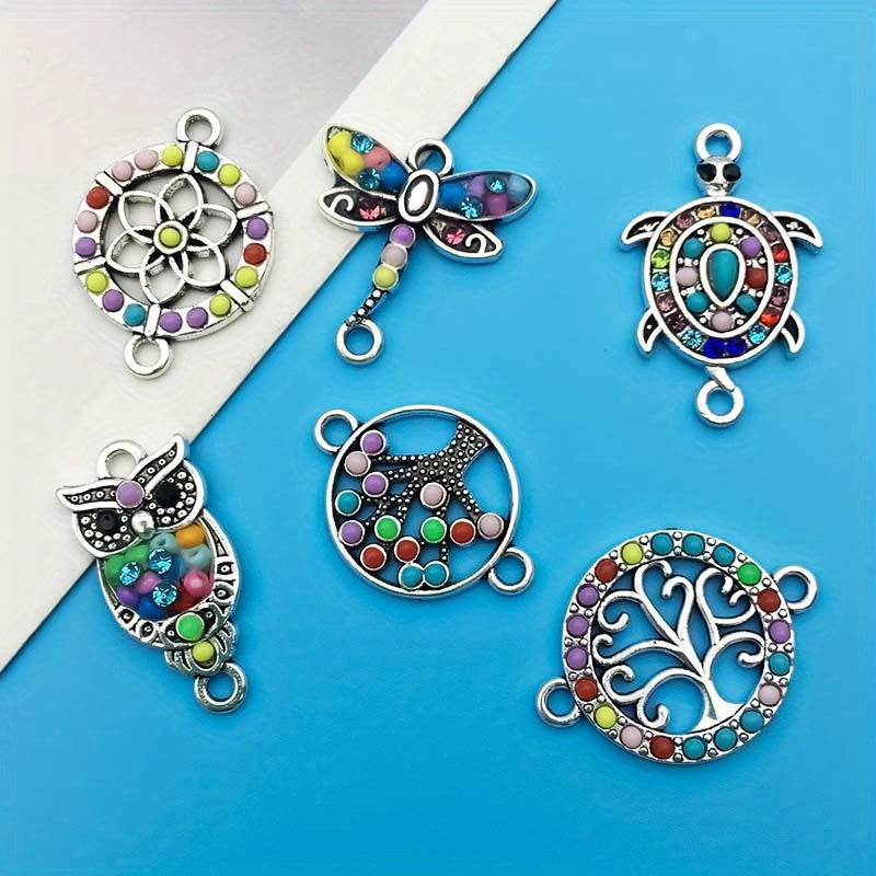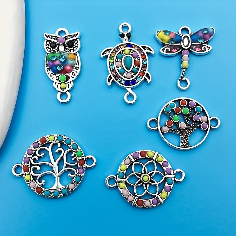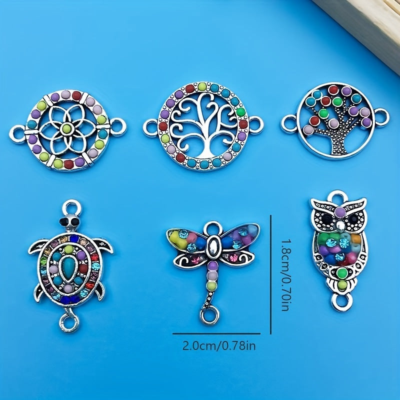 Enhance your DIY jewelry projects with these 6pcs colorful crystal antique silvery tree blossom, turtle, and dragonfly connectors. Perfect for adding a pop of color and style to your creations.