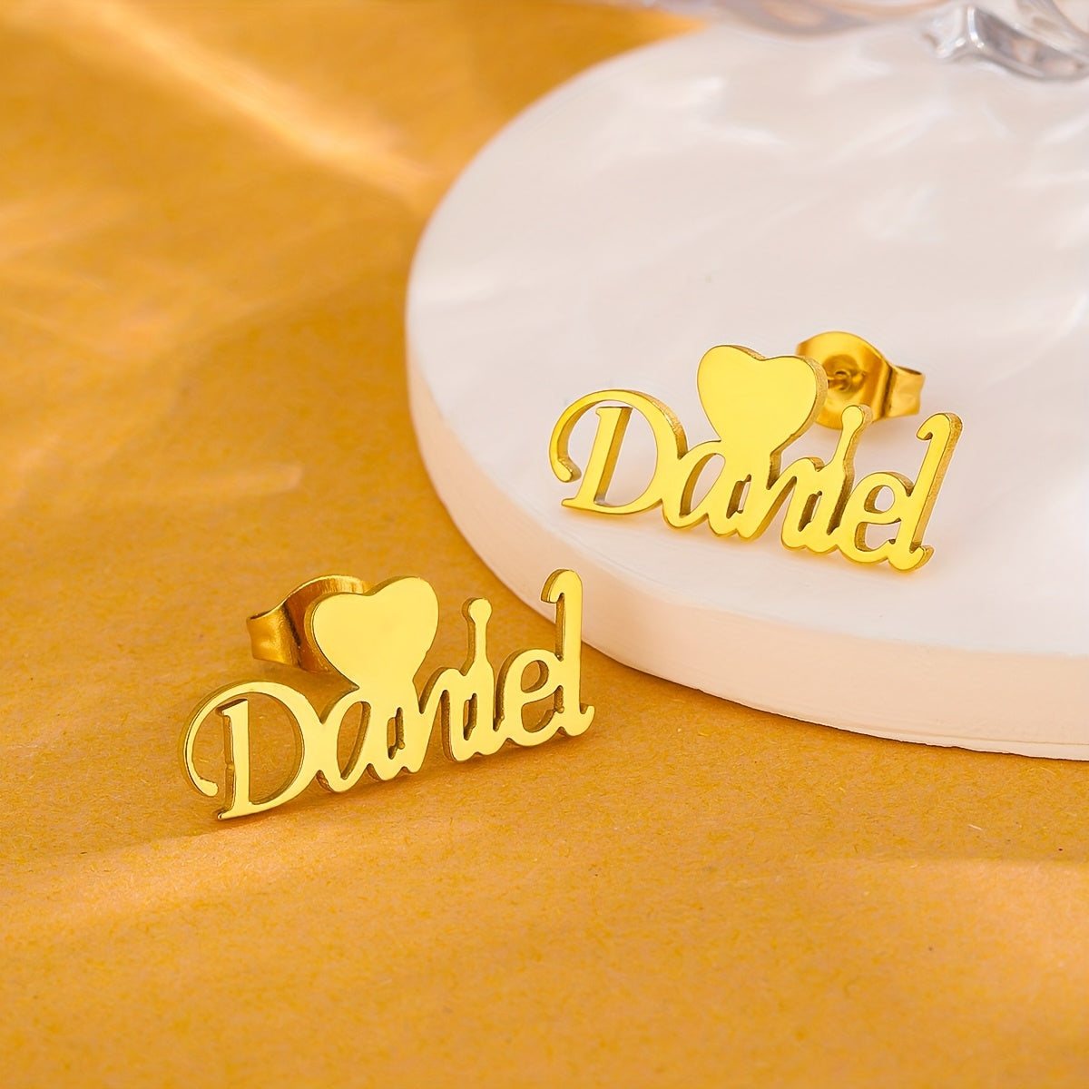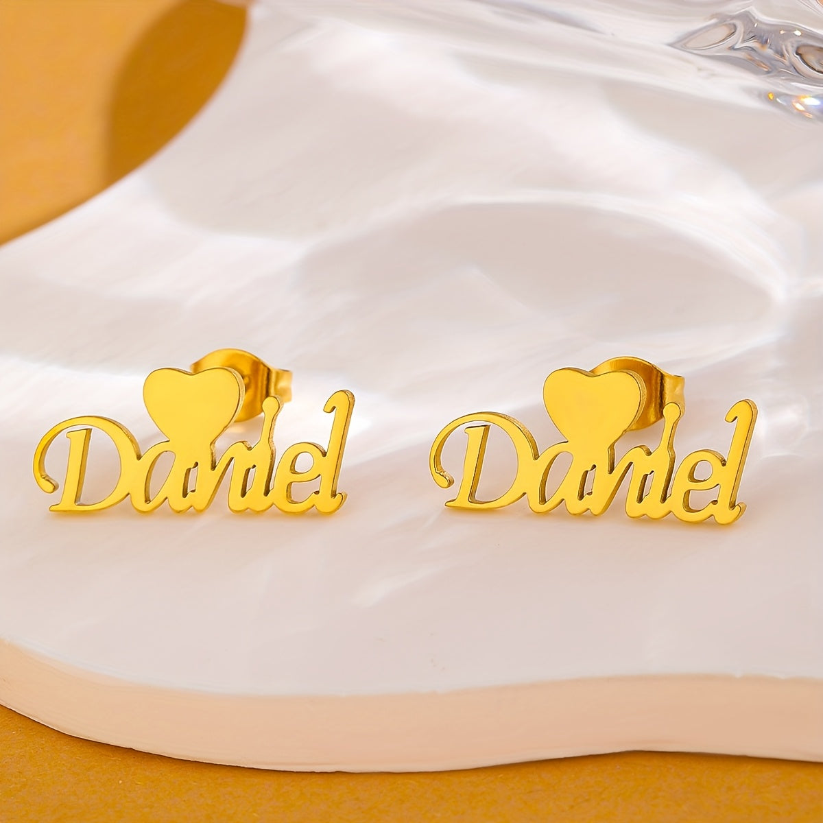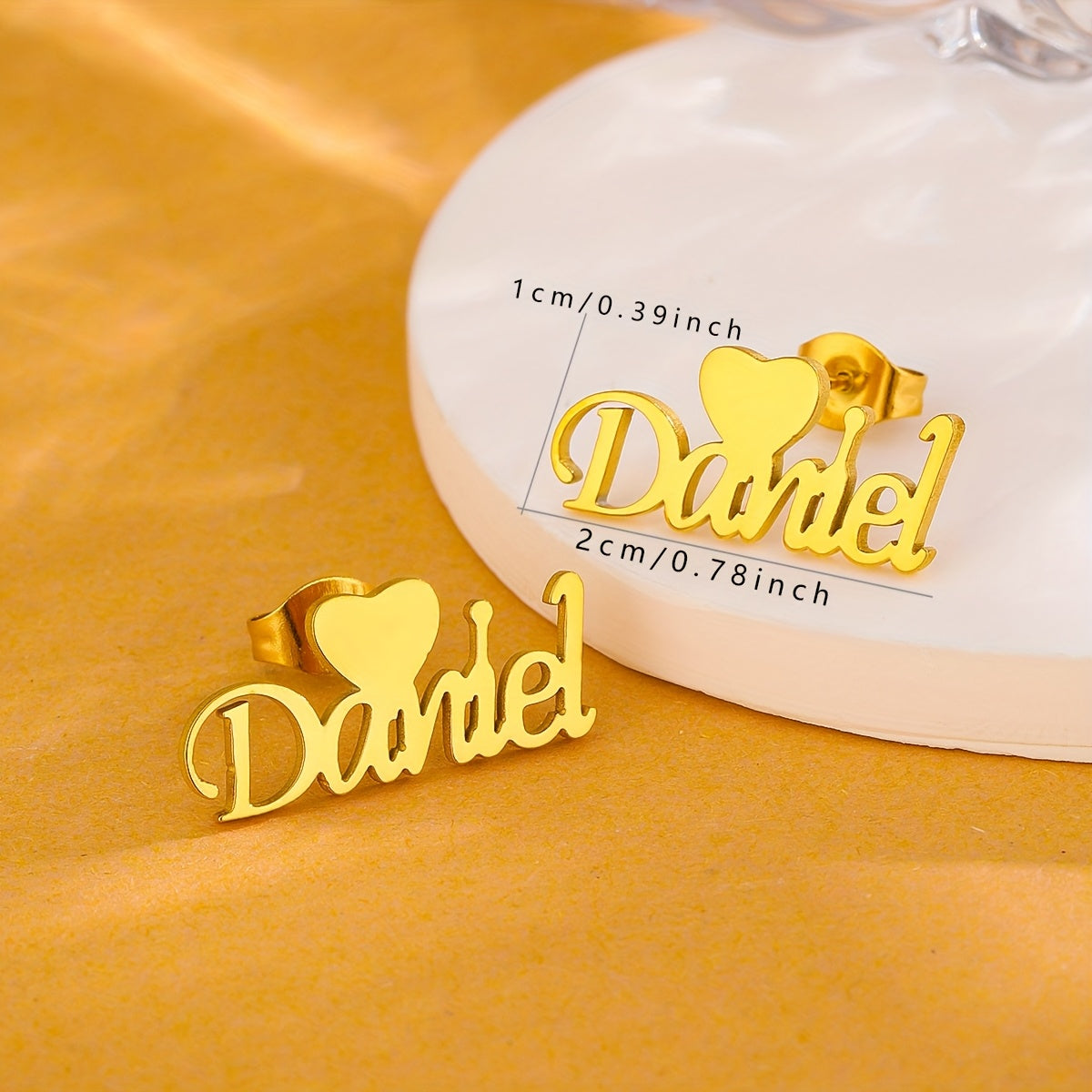Personalize your style with these custom name stud earrings featuring a heart design. Made of stainless steel with a golden finish, these earrings make a great gift for women.