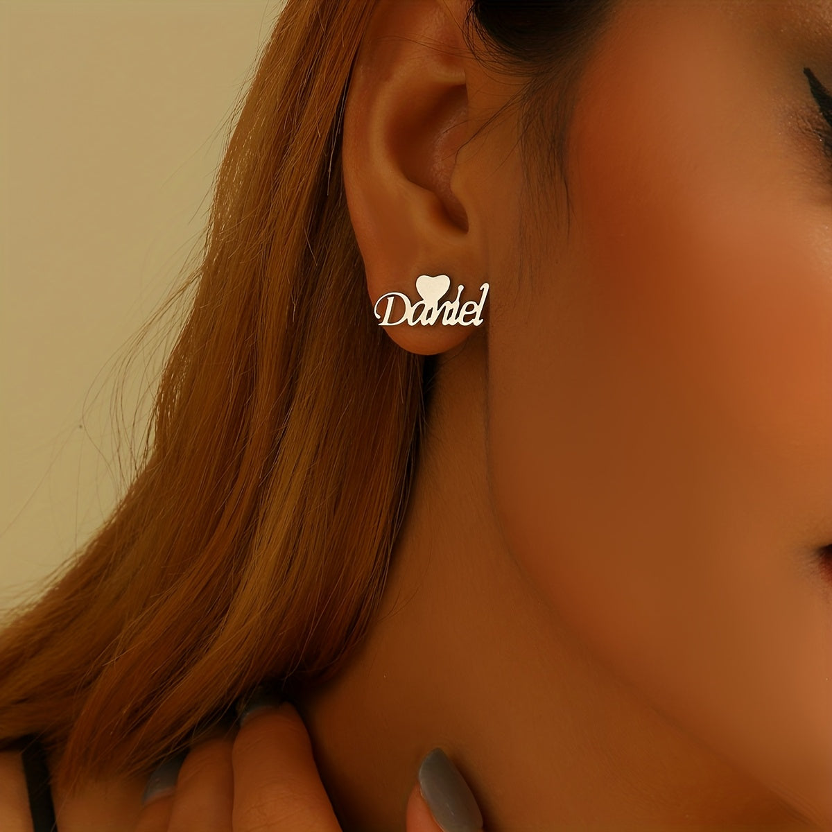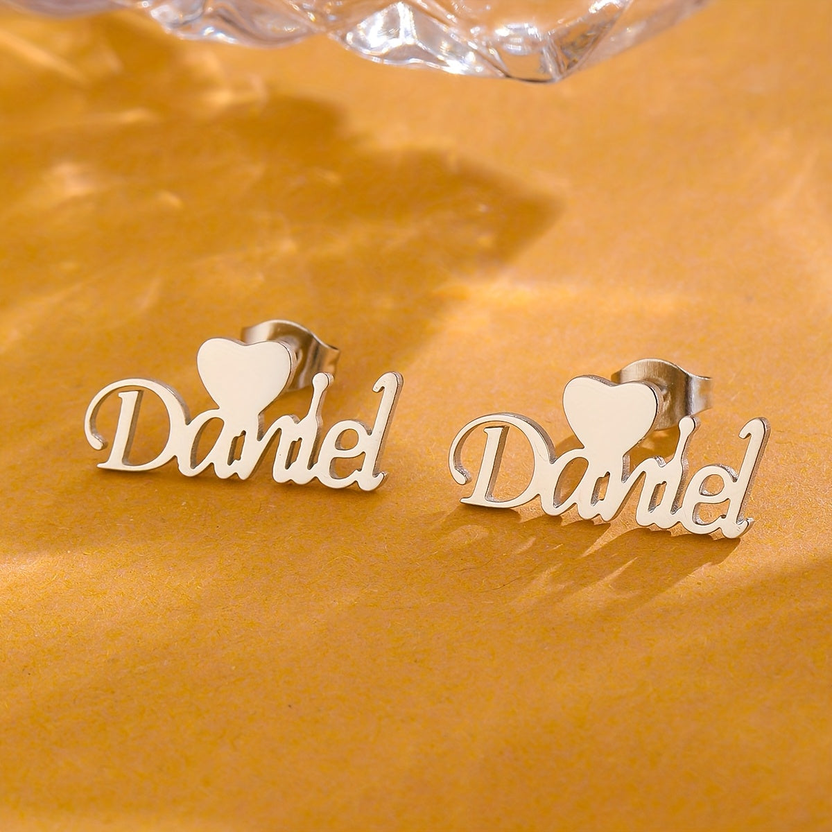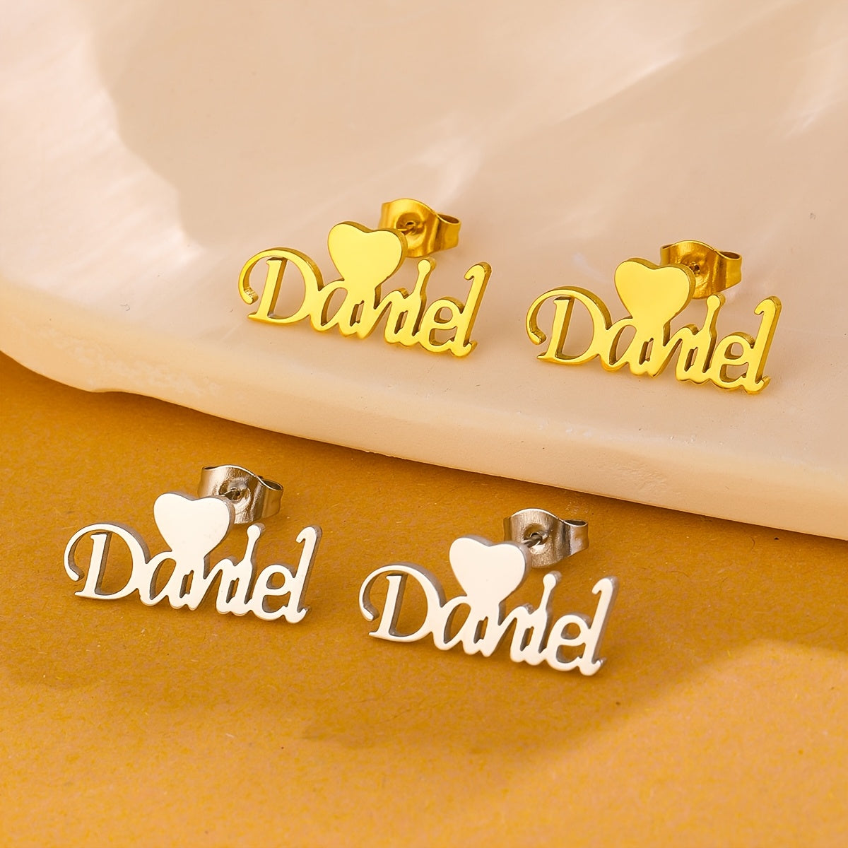 Personalize your style with these custom name stud earrings featuring a heart design. Made of stainless steel with a golden finish, these earrings make a great gift for women.