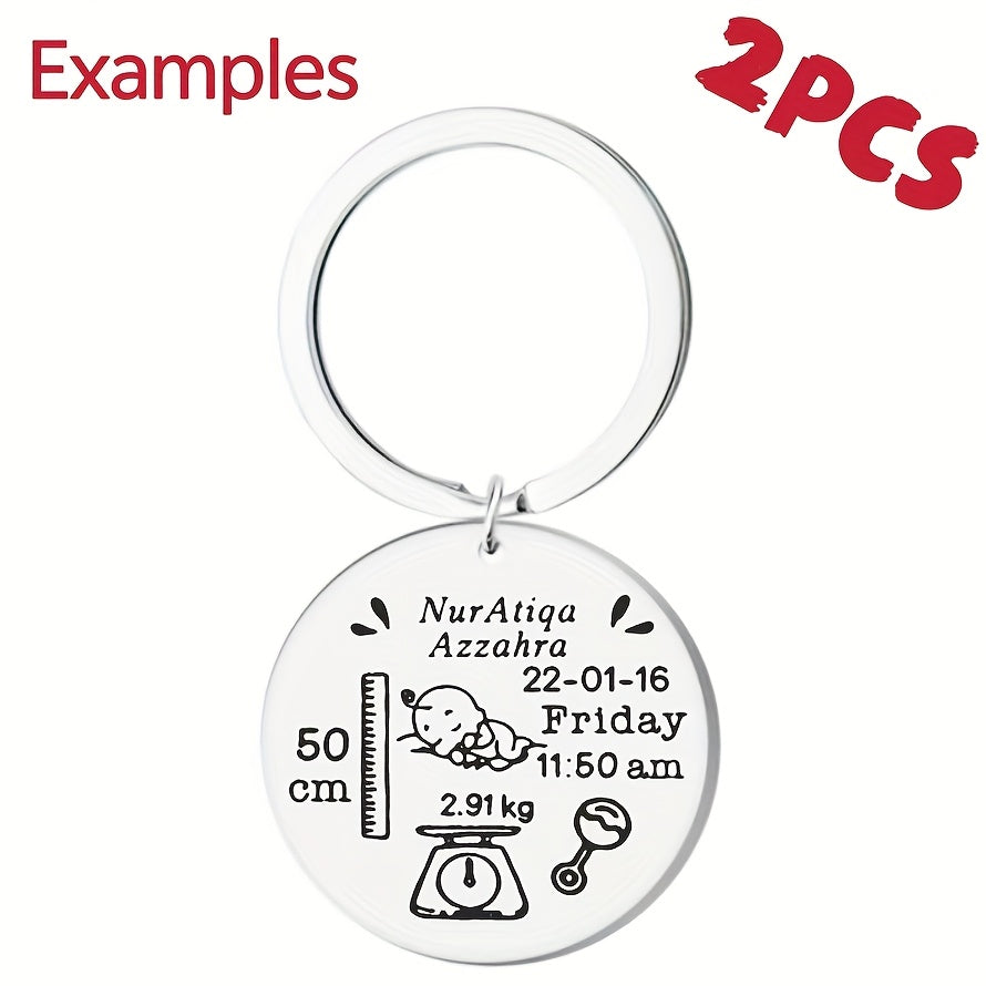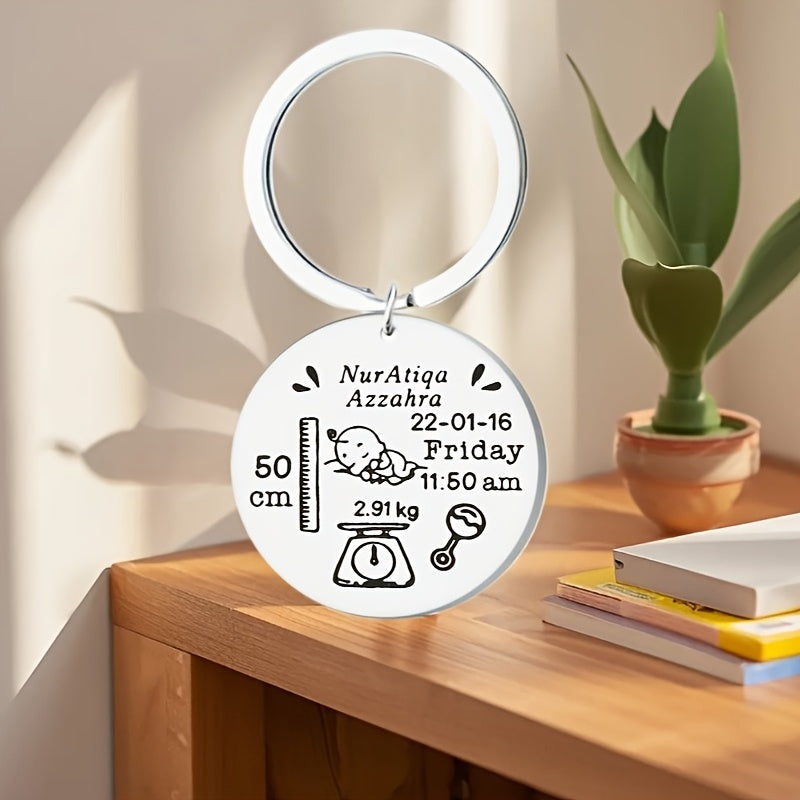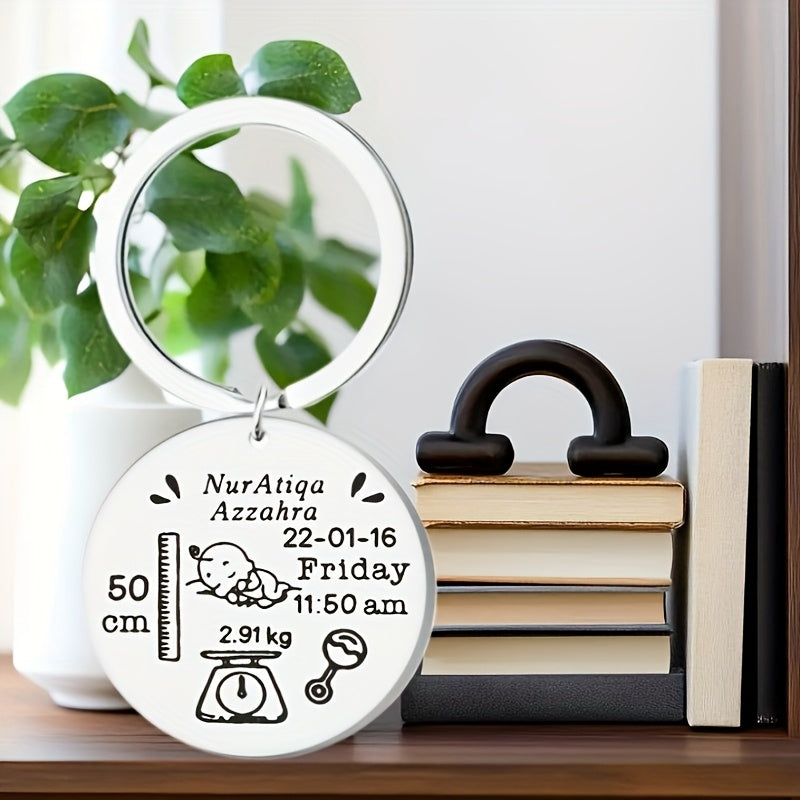 Create a special key chain to commemorate your baby's birth with personalized design. This key chain features custom figures and details of the birth for a one-of-a-kind keepsake.