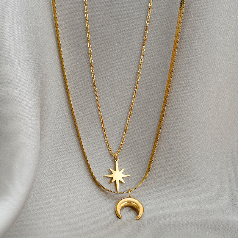 Elegant and feminine double pendant necklace with a plated stainless steel design featuring a double hexagram and moon motif.
