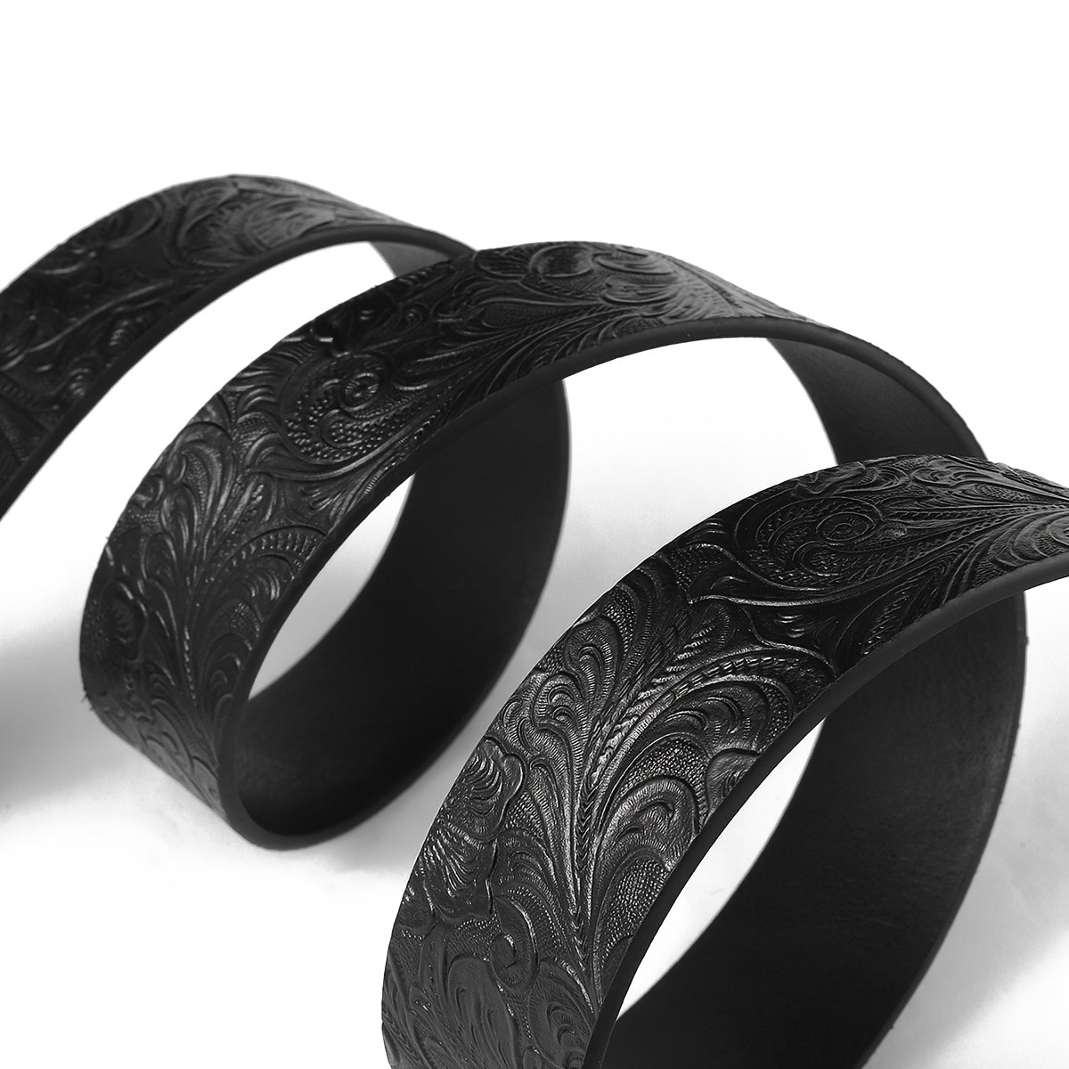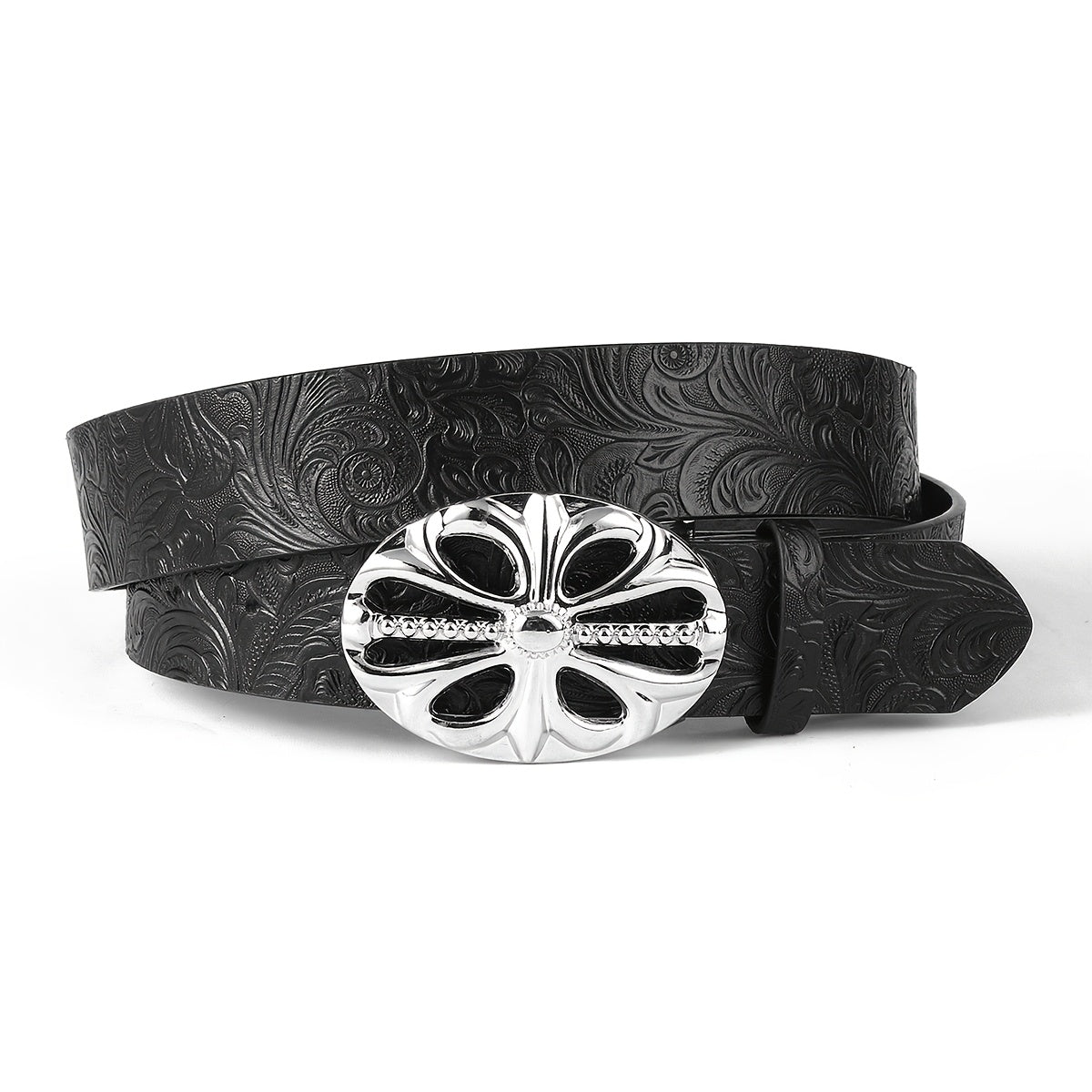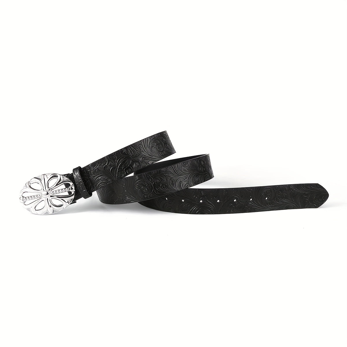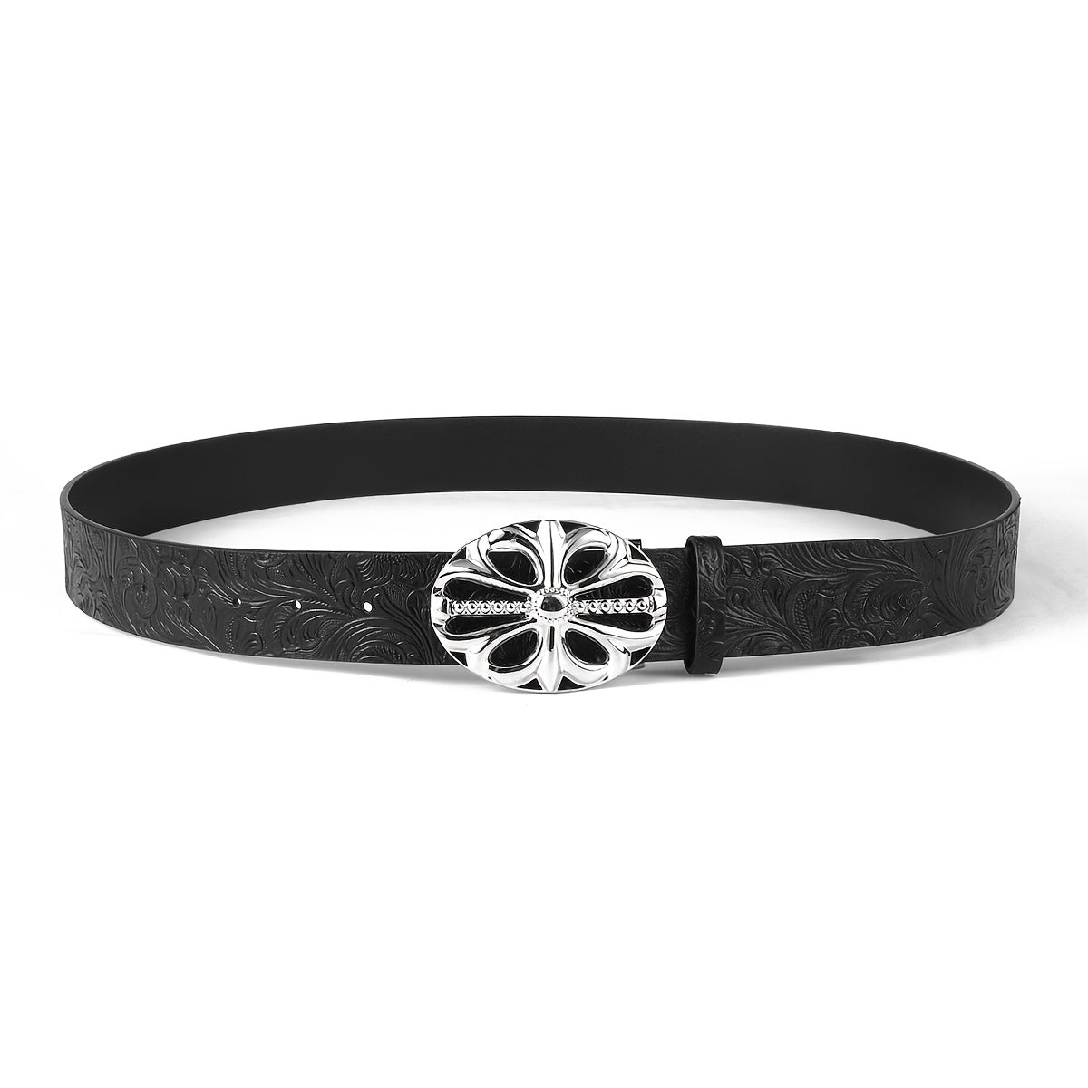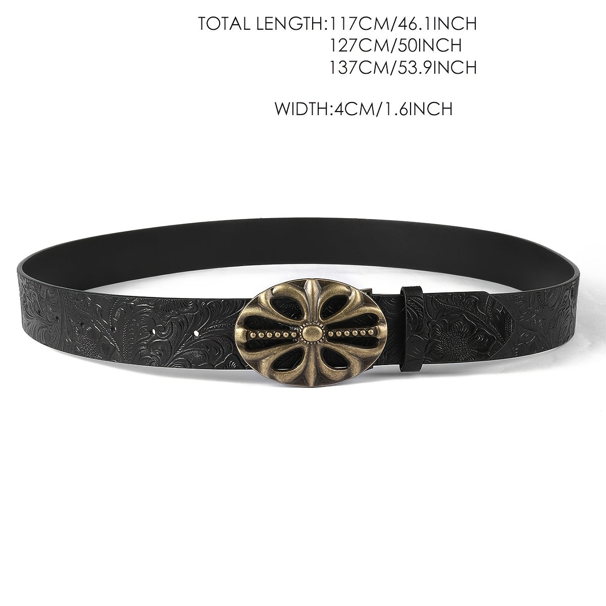 This European and American retro style belt features embossed design, three-dimensional cross carving, cut out plate buckle, and toe decoration.