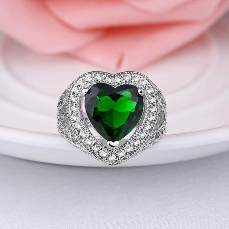 This stunning ring features a green emerald crystal heart in a cocktail style platinum plated setting. Perfect for women and girls.