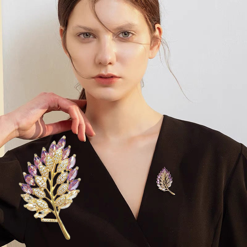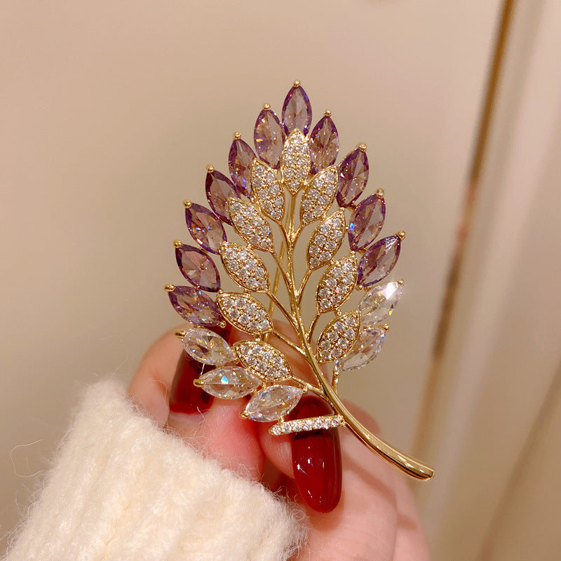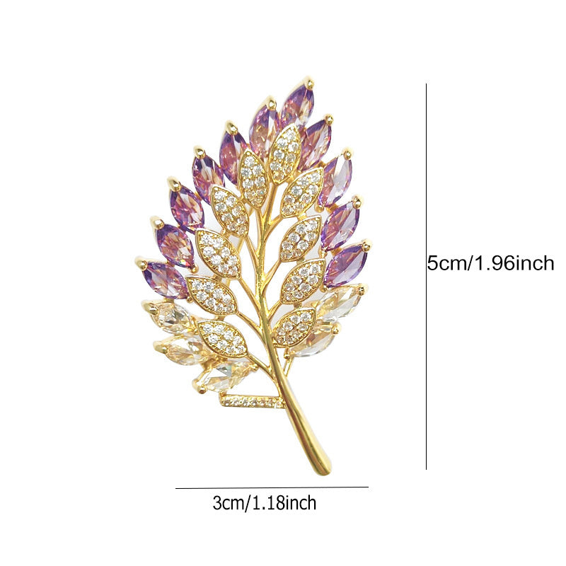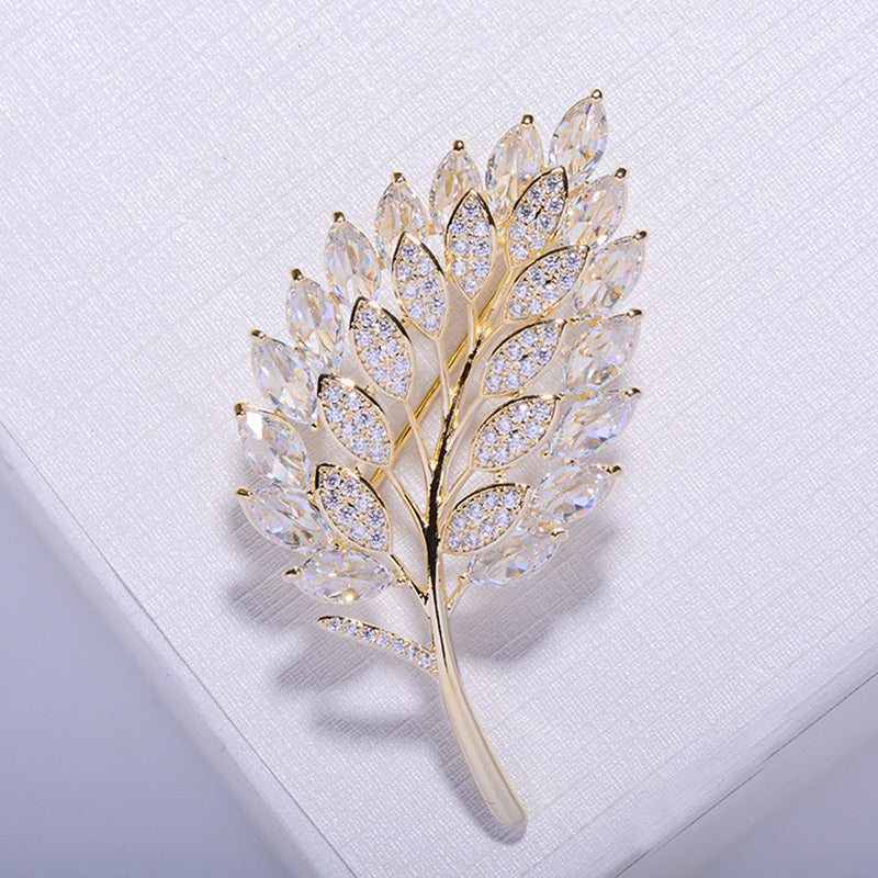 Elegant enamel brooch adorned with crystal rhinestones in a leaf design, perfect for weddings or everyday wear.