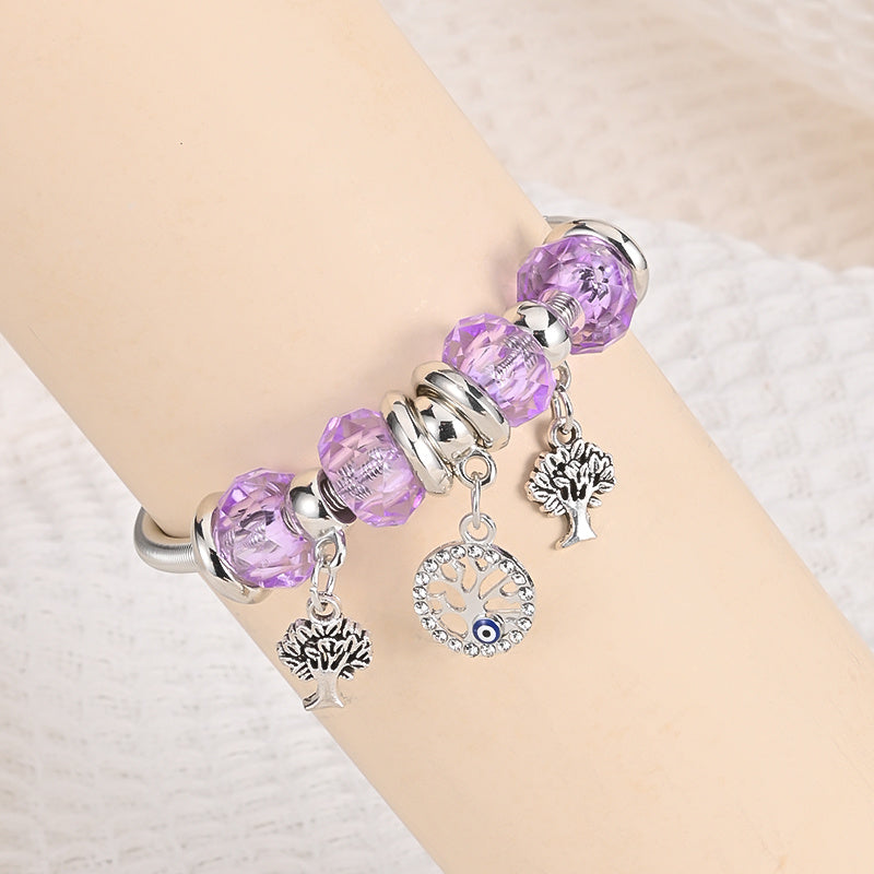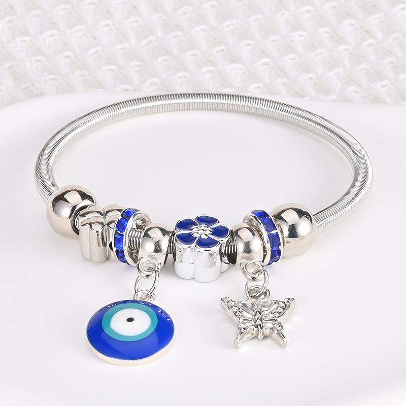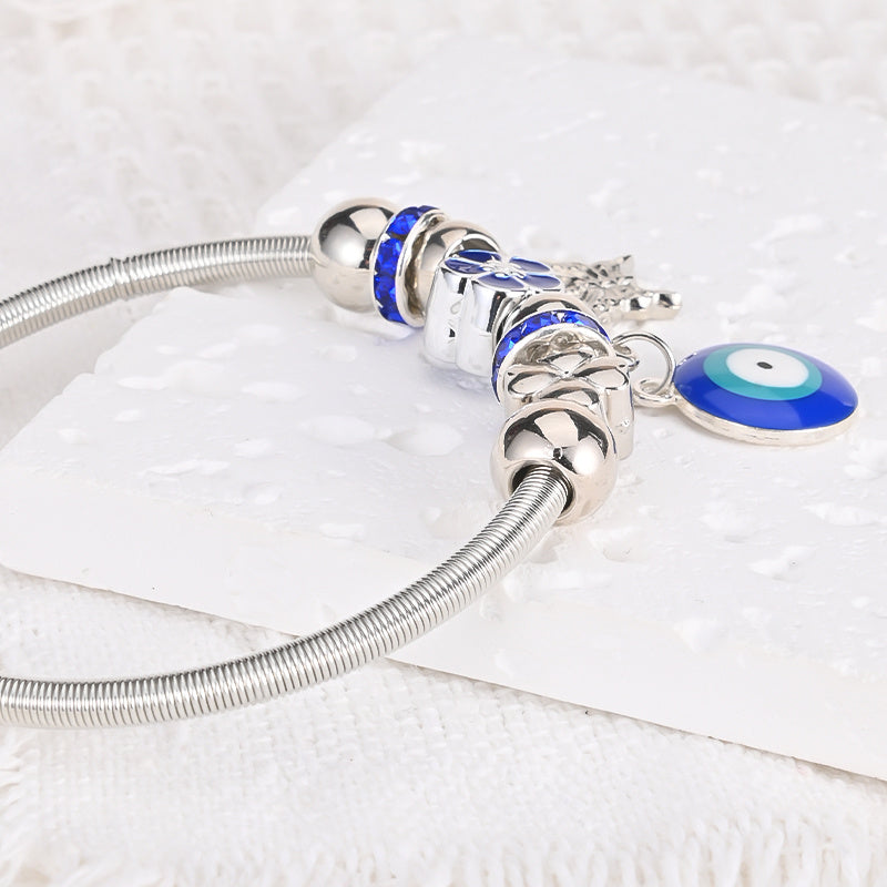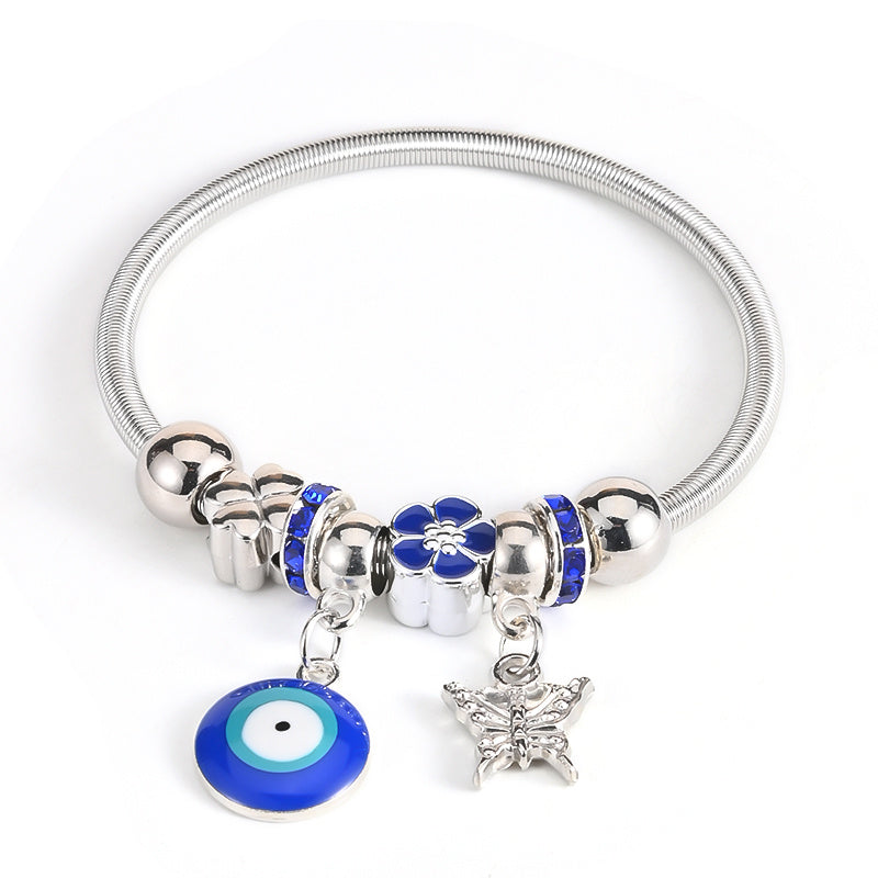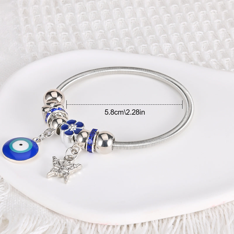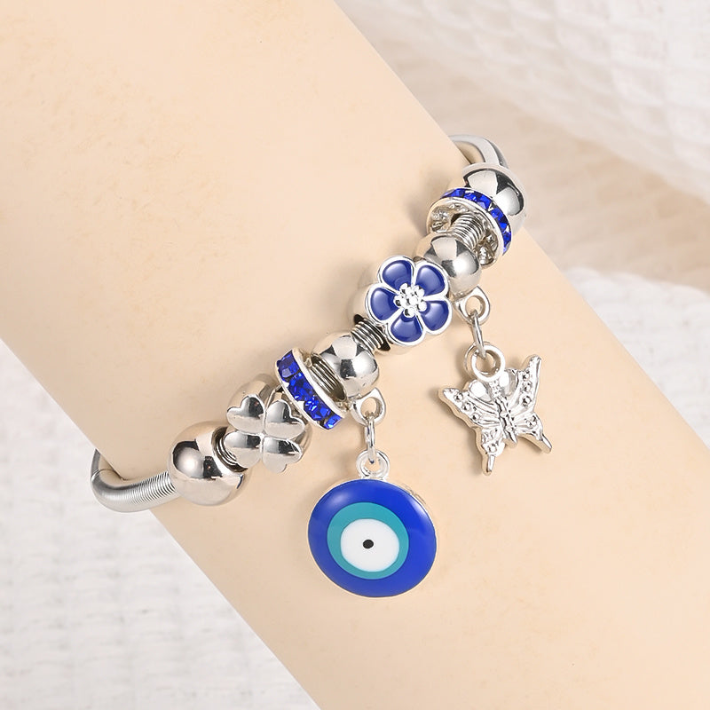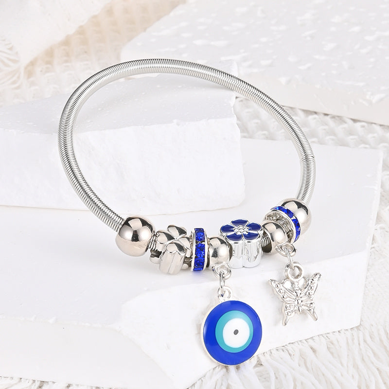 This bracelet bangle features an Evil Eye pendant design, crafted in a silvery finish. It adds a chic and protective charm to your outfit.