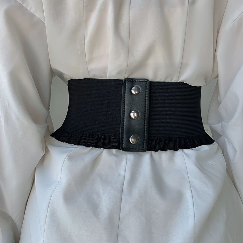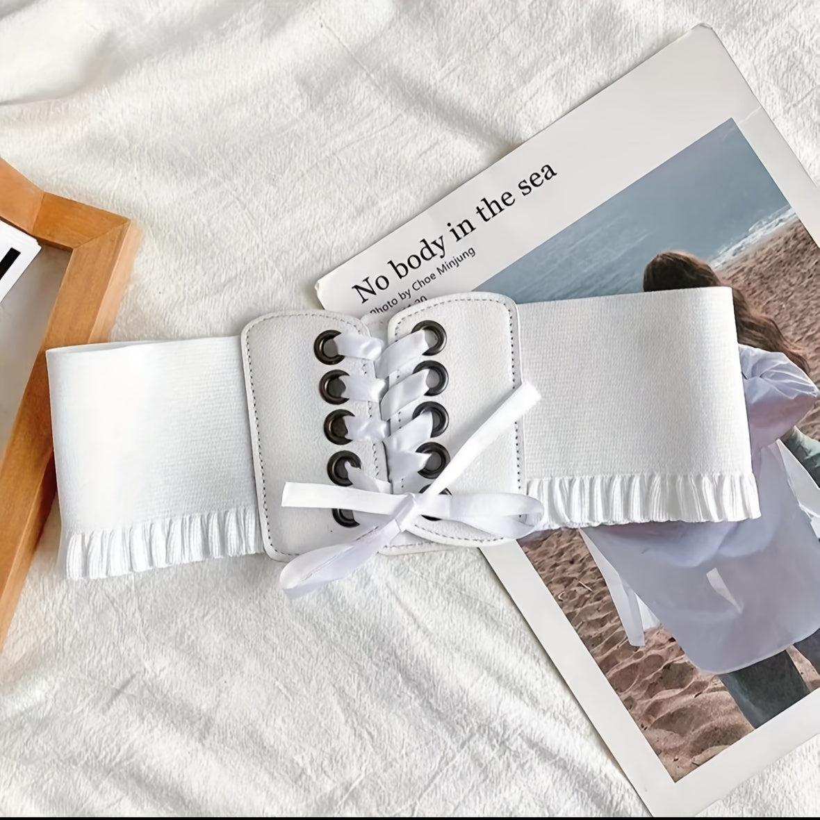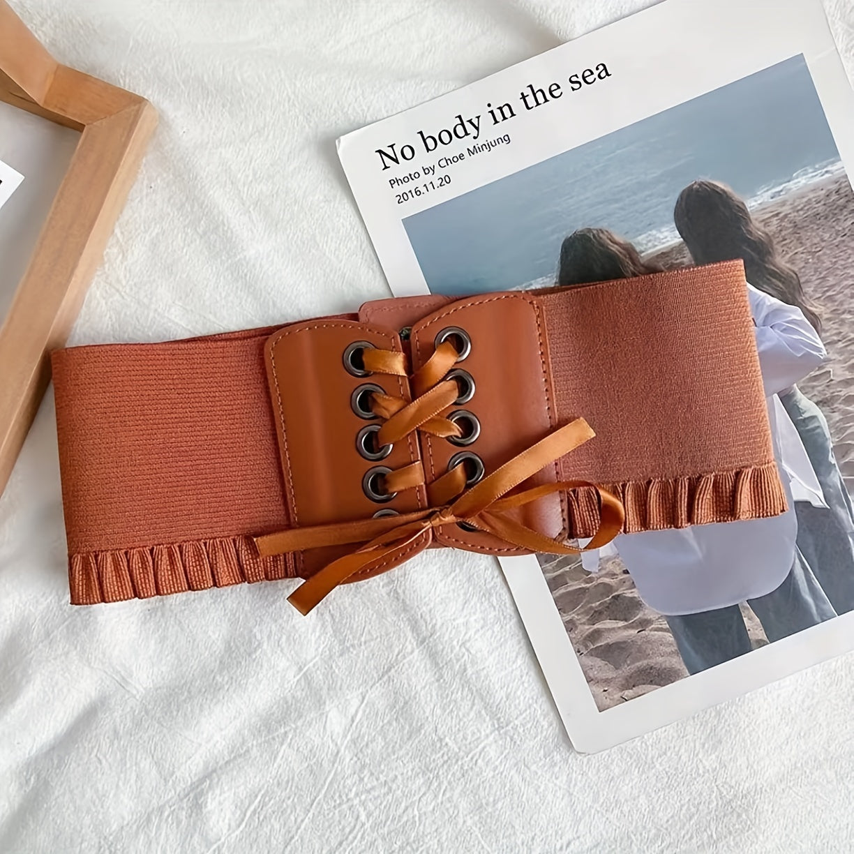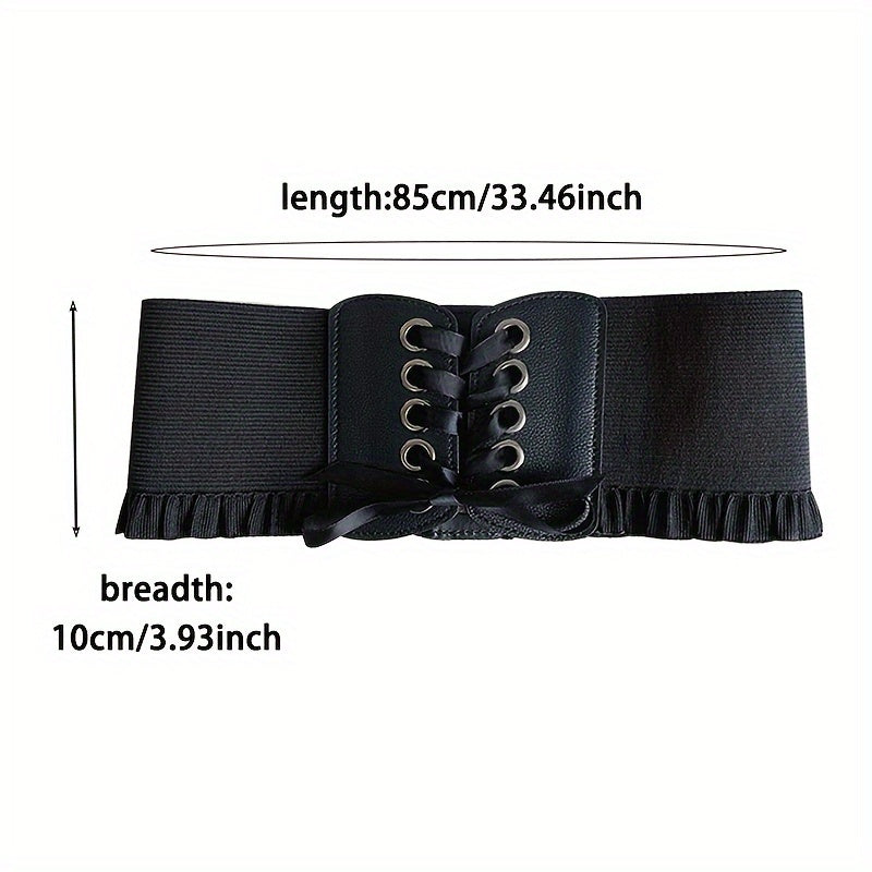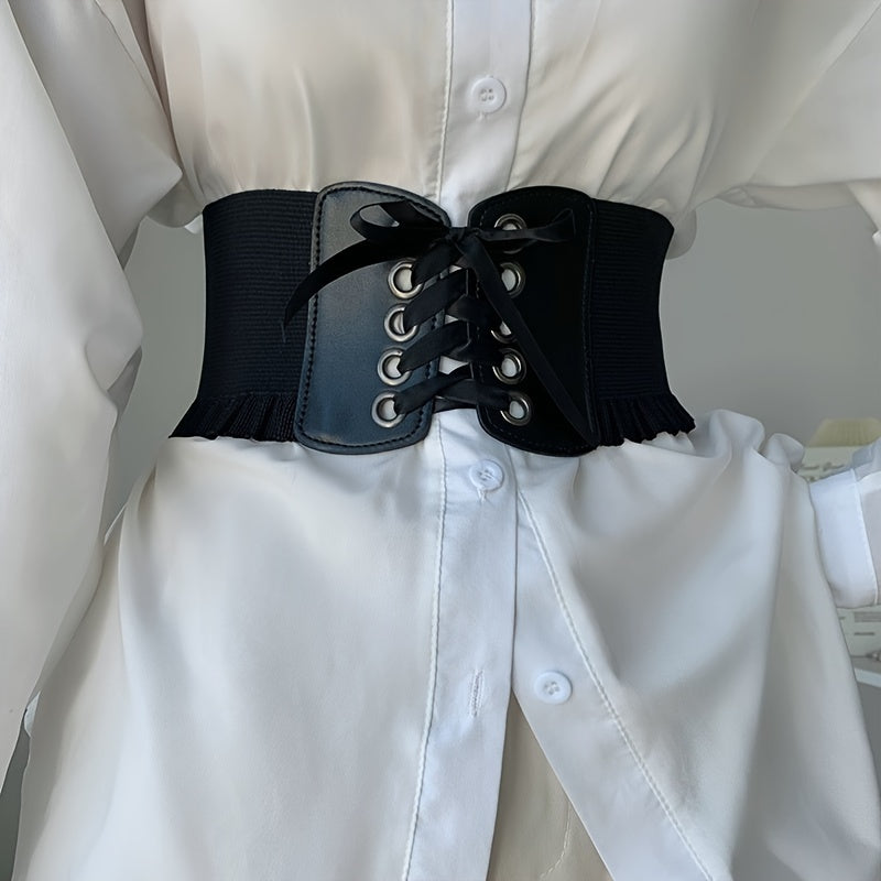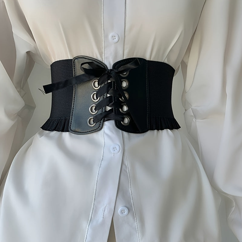 Add a touch of vintage charm to your outfit with this faux leather corset waist belt. It features an adjustable lace-up design, tassel detail, and elastic band for a comfortable fit. Perfect for dresses, suits, or casual wear.