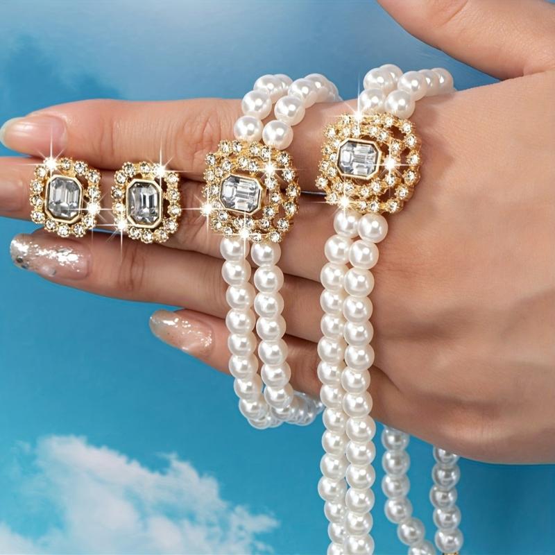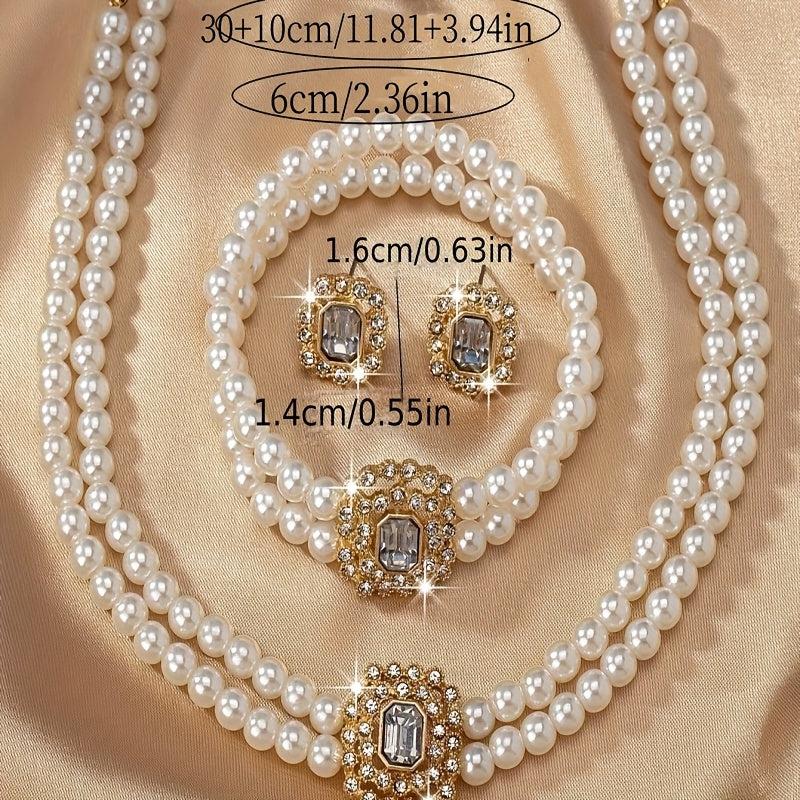 Elevate your style with this chic set featuring double row faux pearl geometric square earrings, bracelet, and necklace. A perfect gift for friends or yourself!
