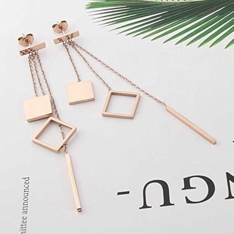 Make a statement with these stunning stainless steel rose plated earrings featuring a geometric square design and elegant tassel drops. The push back findings ensure secure and comfortable wear. Perfect for adding a touch of glamour to any outfit.
