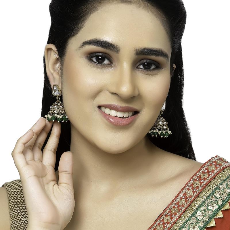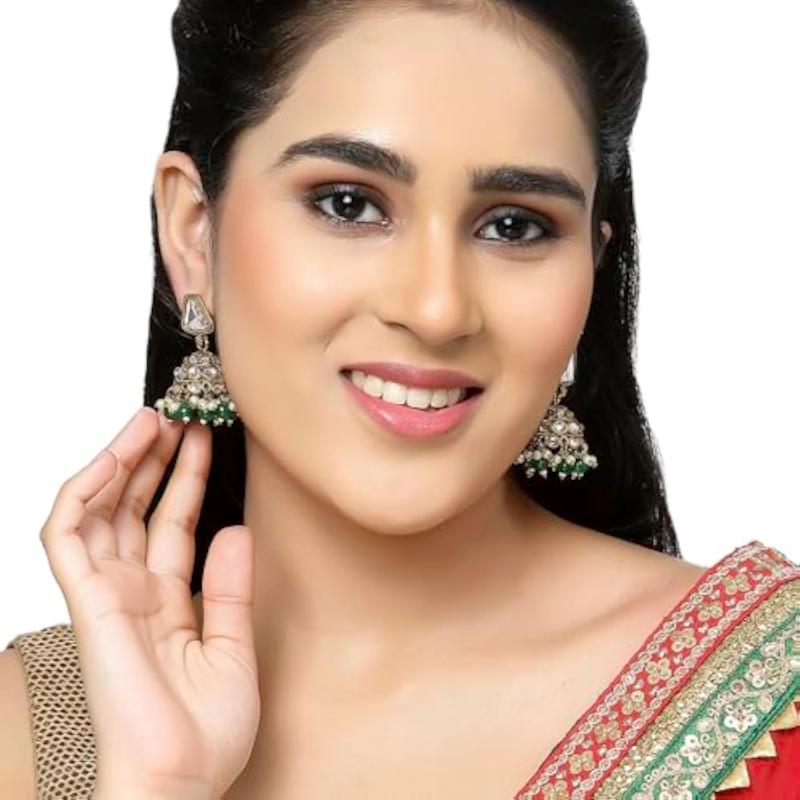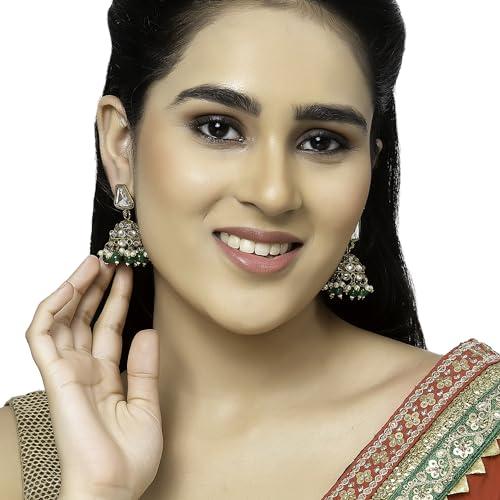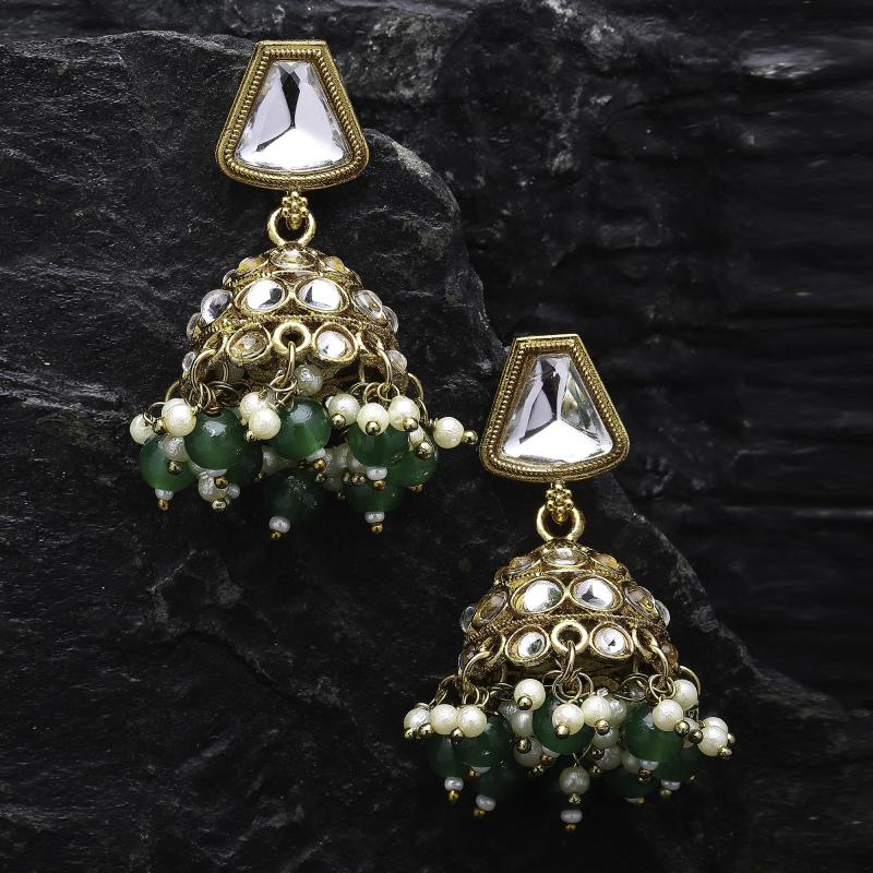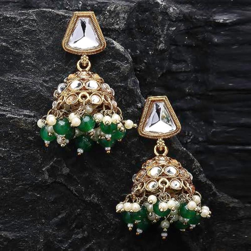 Elegant dome-shaped mirror jhumka earrings with kundan and pearls detailing for a traditional look.