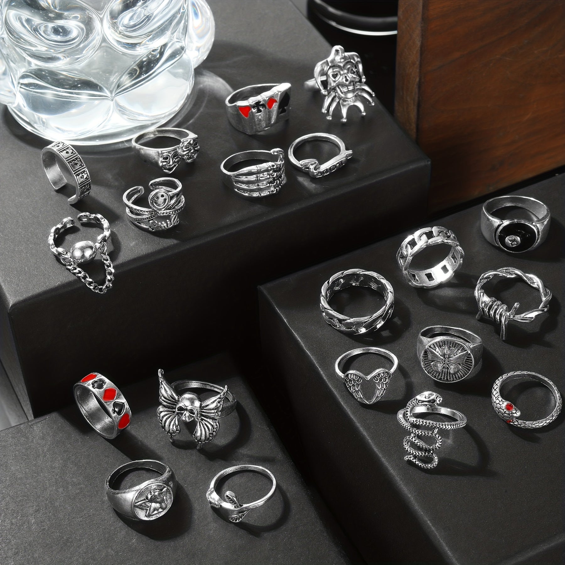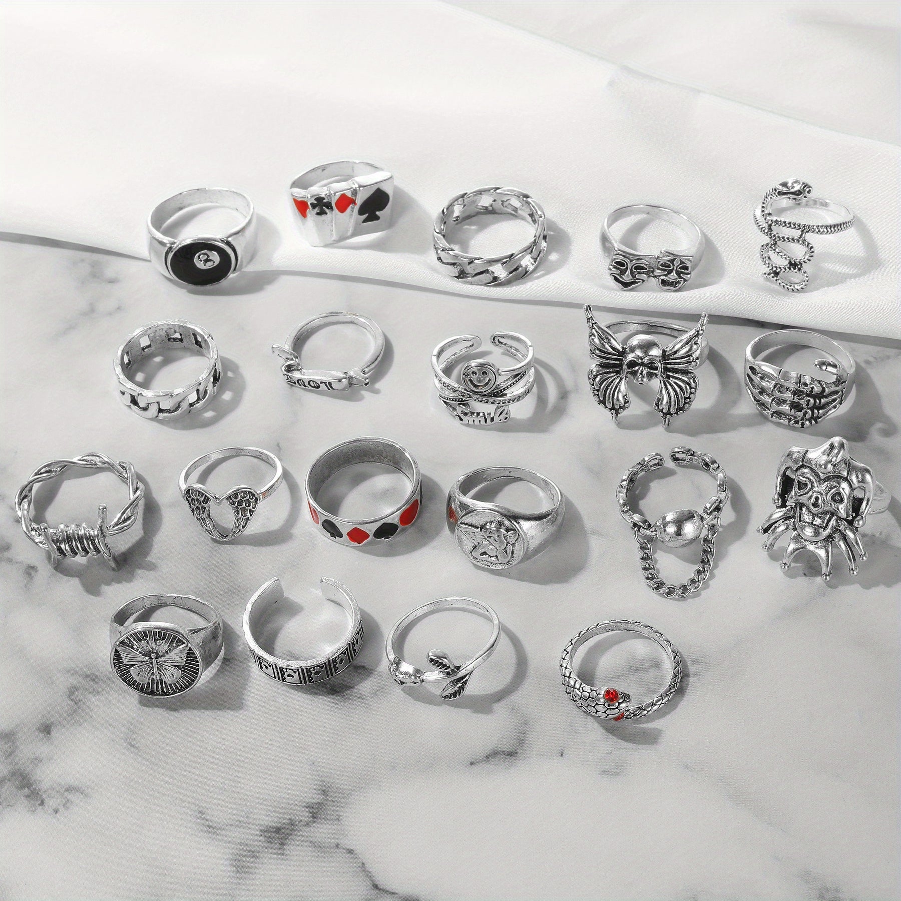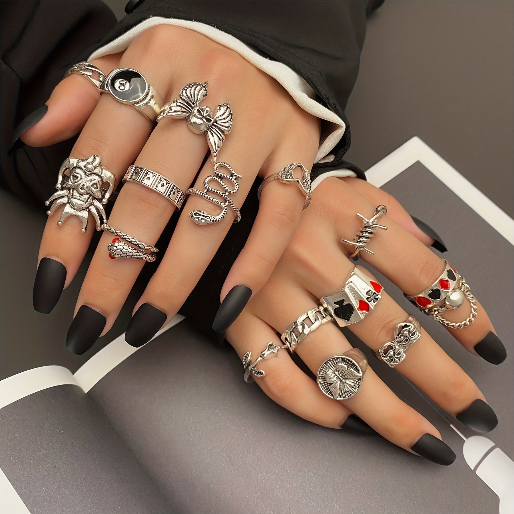 Enhance your daily outfits with these 2pcs Gothic style stacking rings featuring snake and skull patterns. Perfect for Halloween and for adding a unique touch to your look.