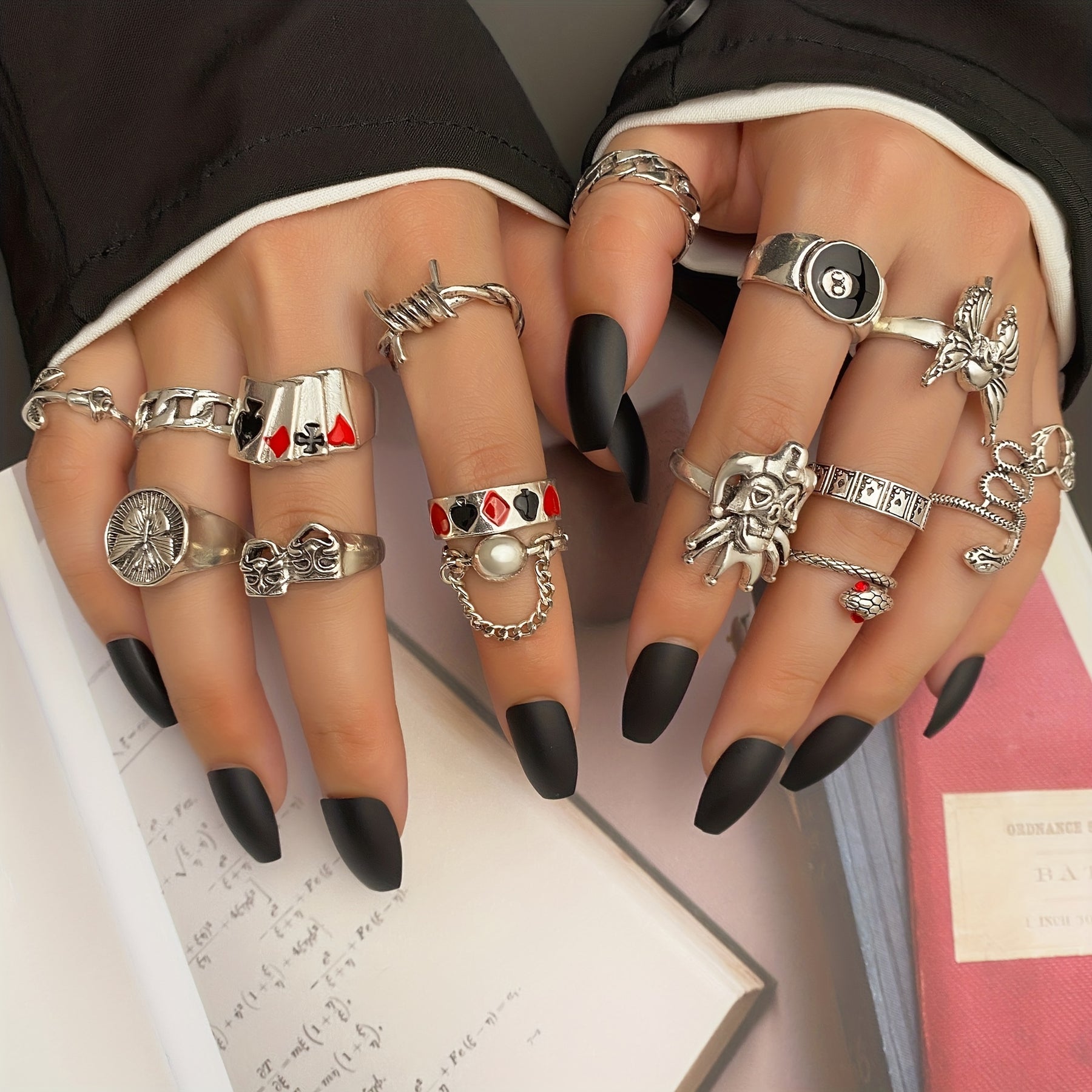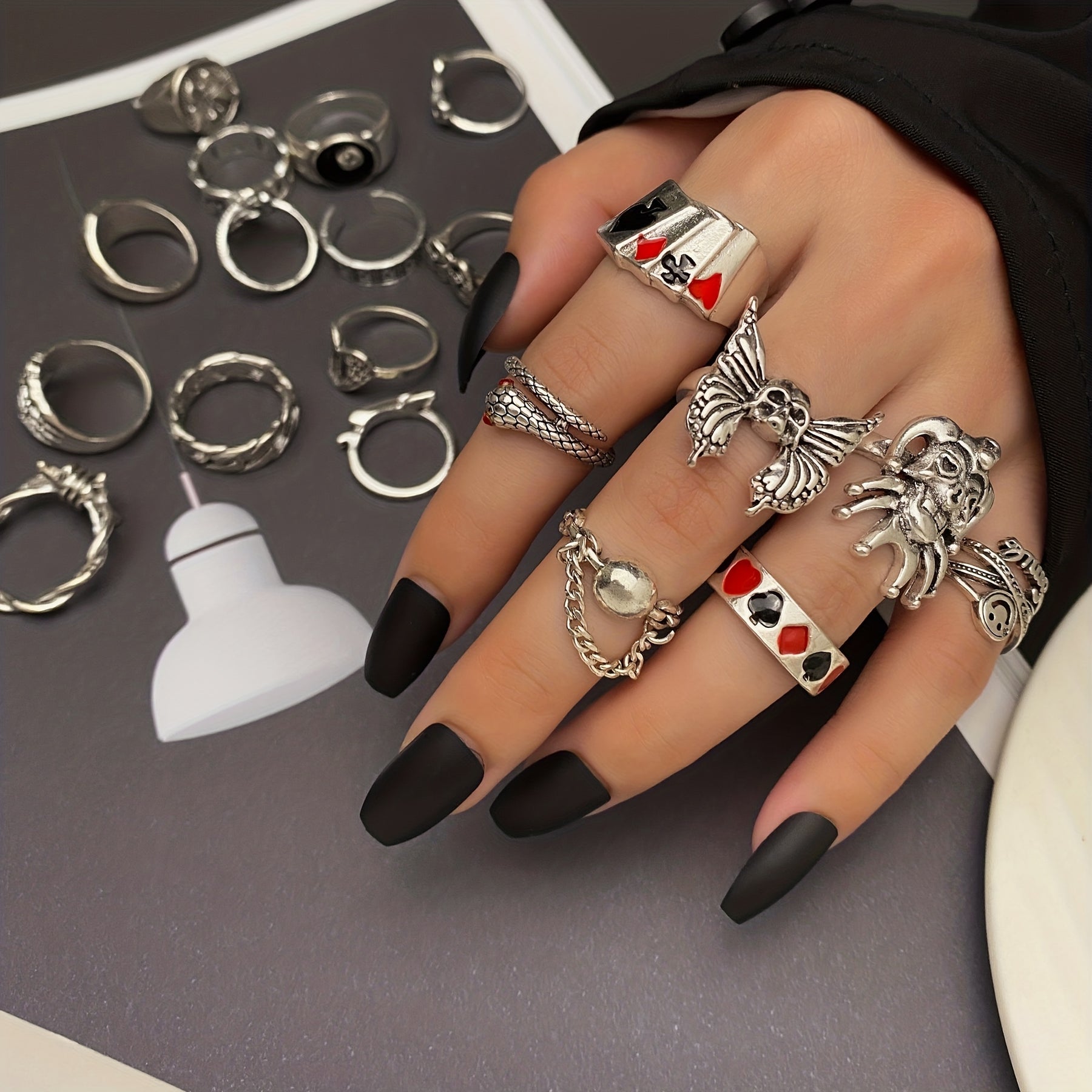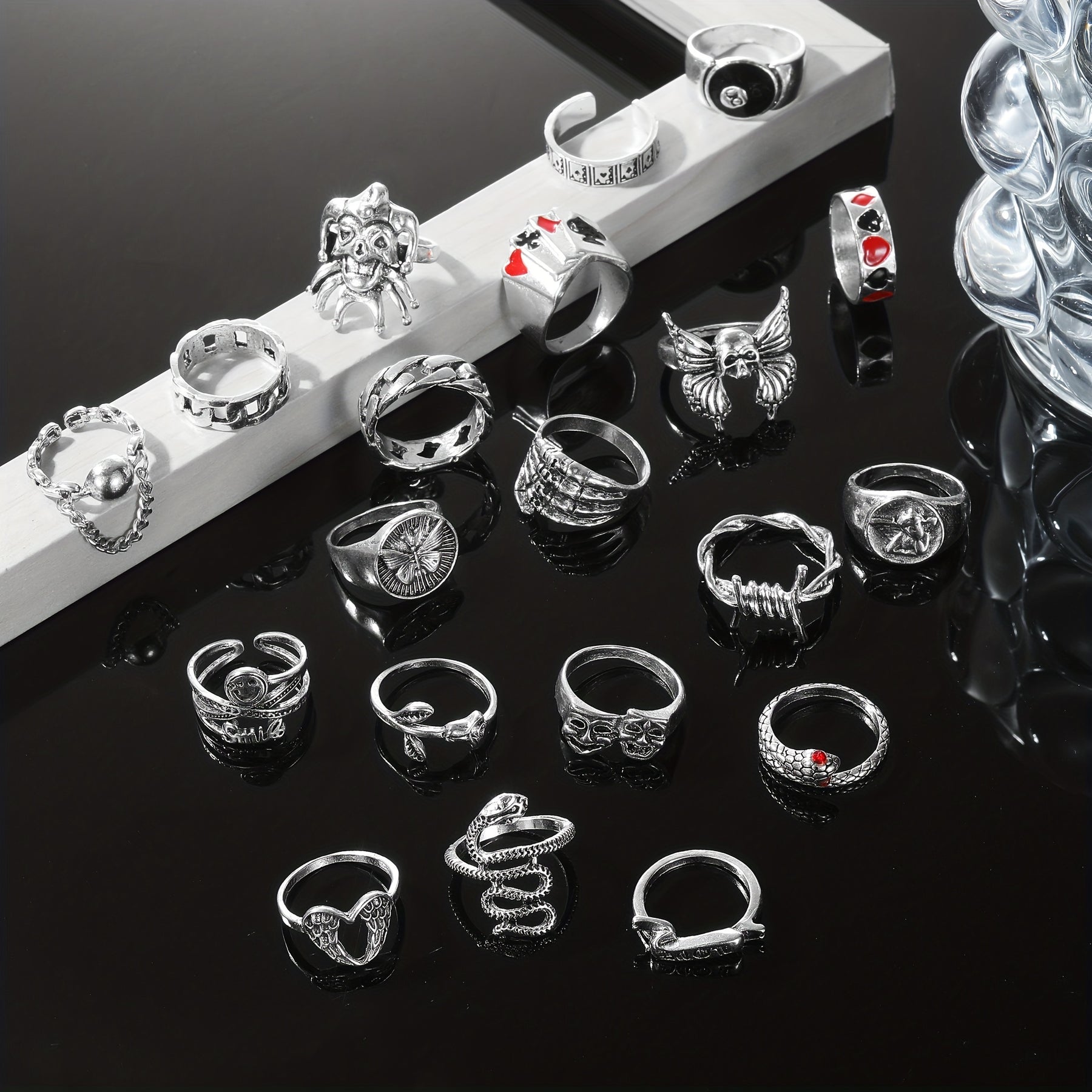 Enhance your daily outfits with these 2pcs Gothic style stacking rings featuring snake and skull patterns. Perfect for Halloween and for adding a unique touch to your look.
