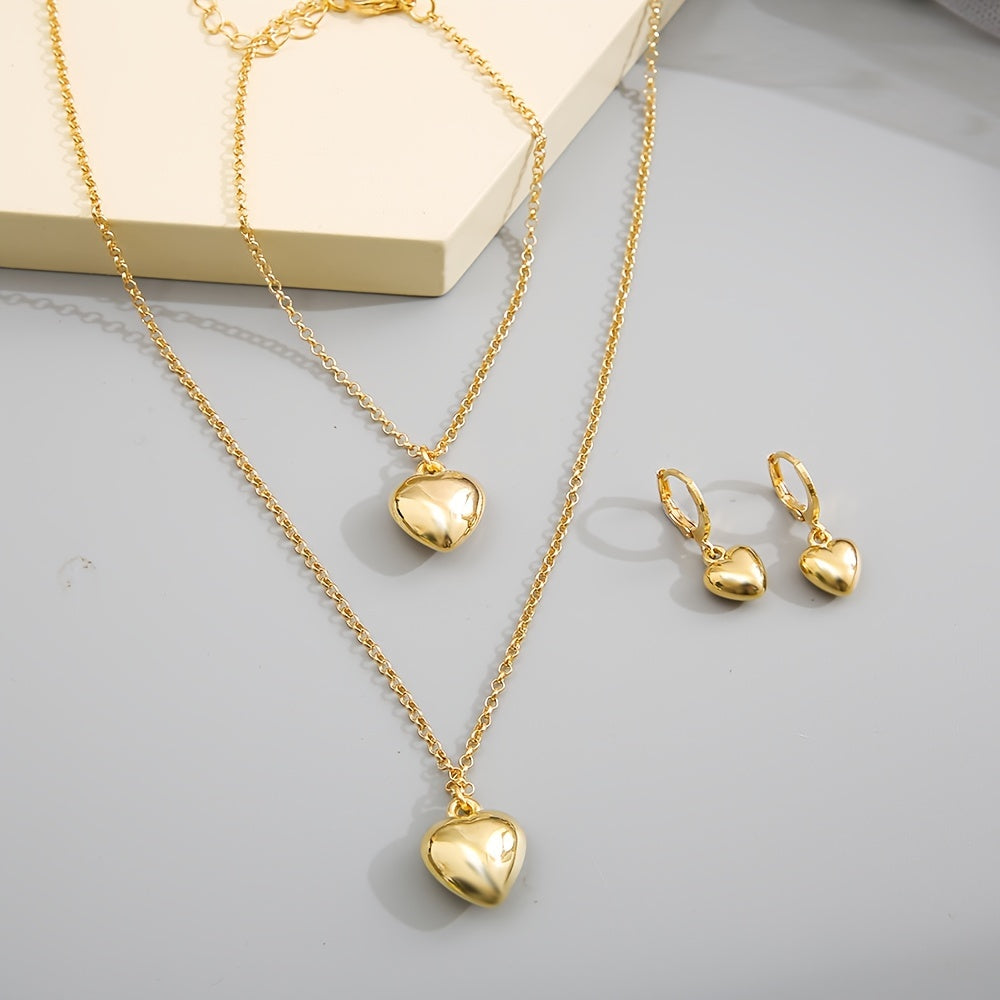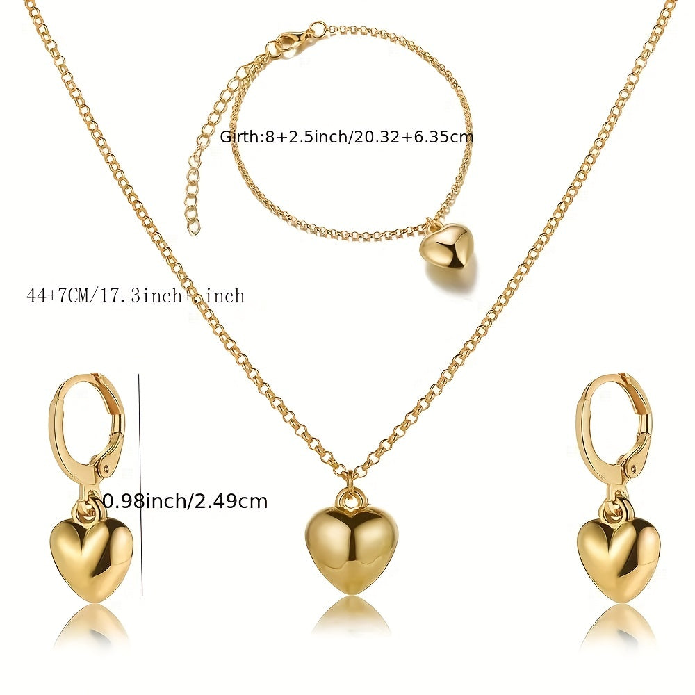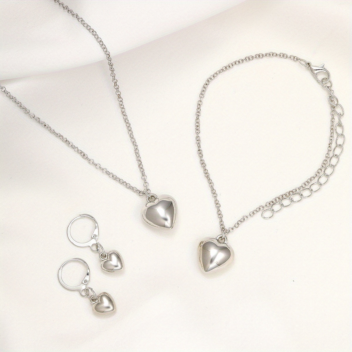 Complete your look with this stunning heart jewelry set featuring a heart-shaped pendant necklace, bracelet, and huggie earrings. The dainty hollow chain is adjustable to fit girls and women.