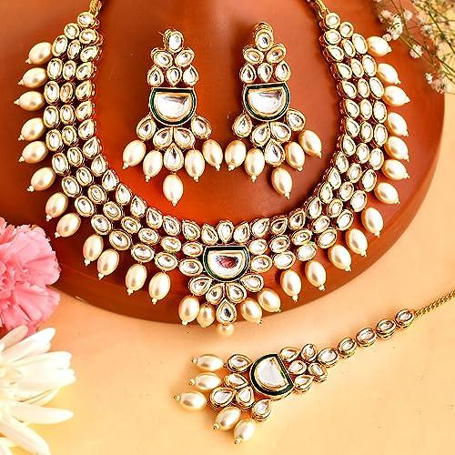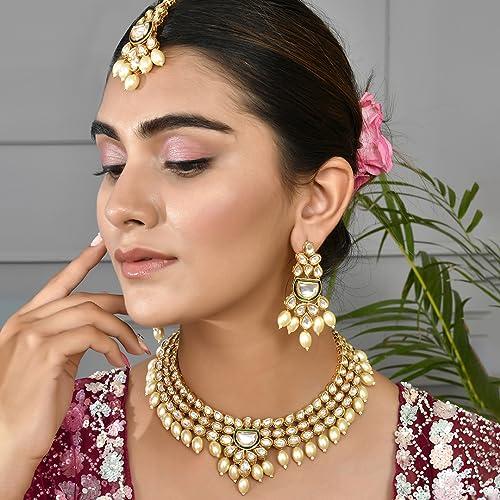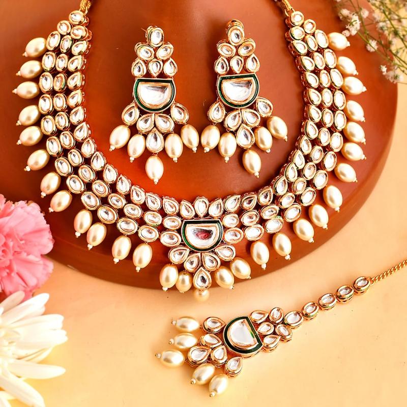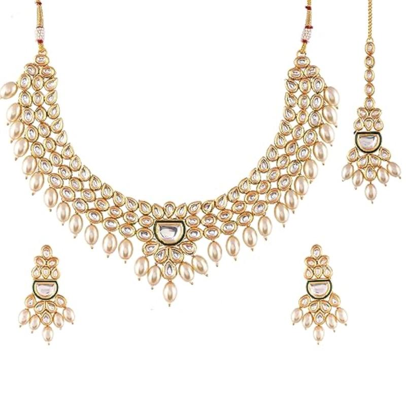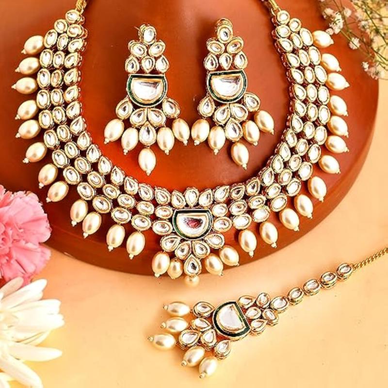 This opulent Maang Tika set features faux Kundan and pearl beads for an elegant look.