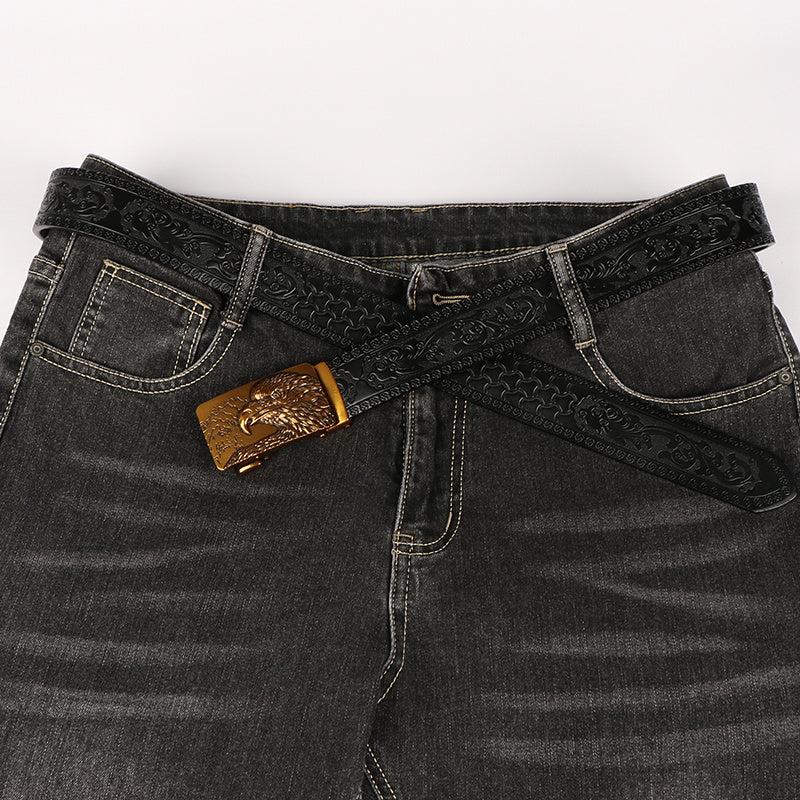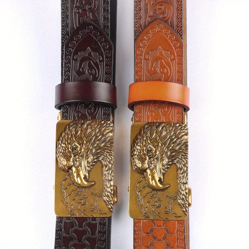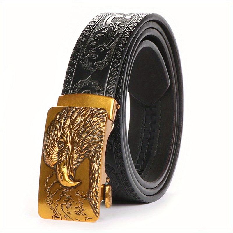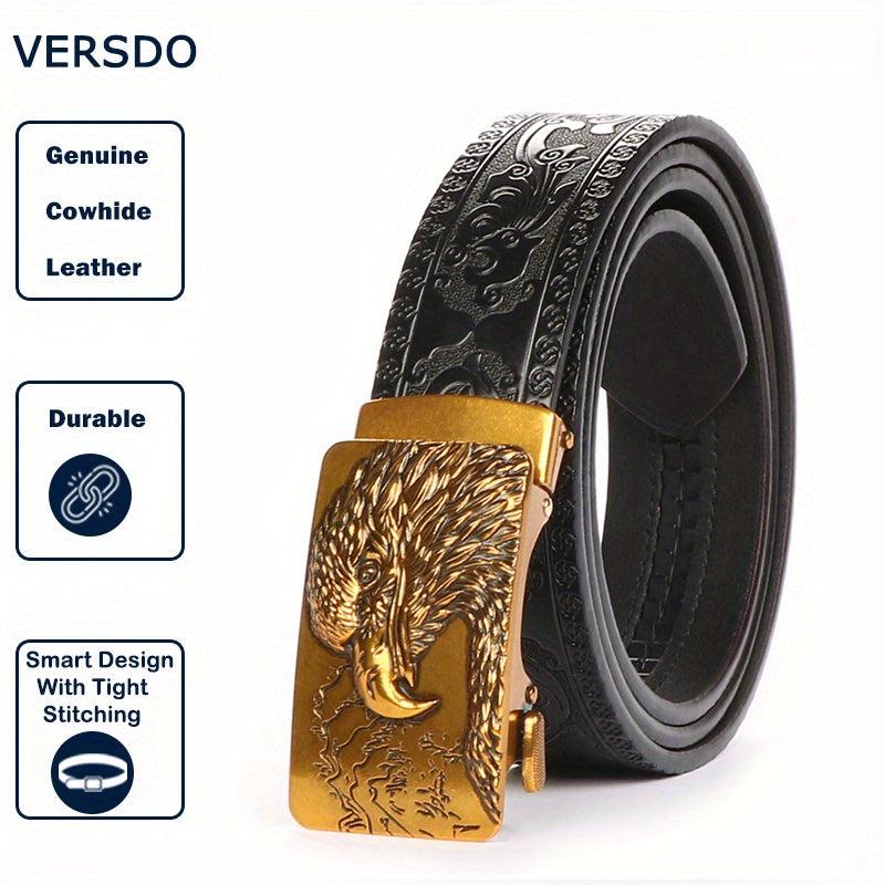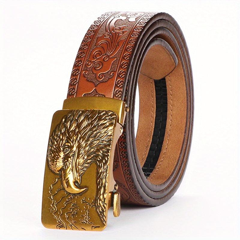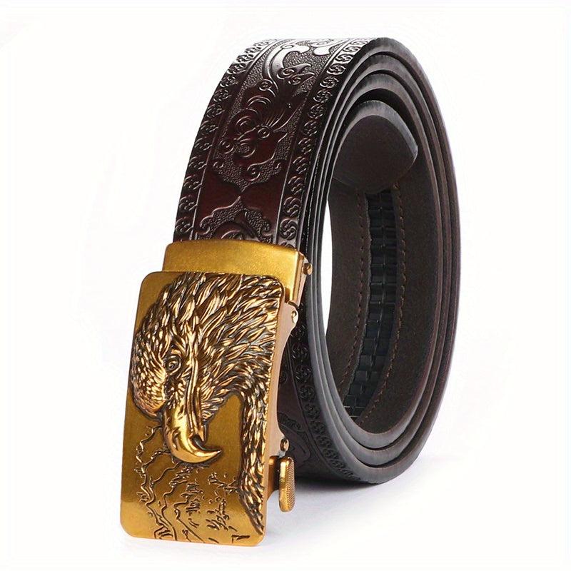 This leather ratchet belt for men features an automatic buckle and is designed for durability, making it perfect for casual and business wear.