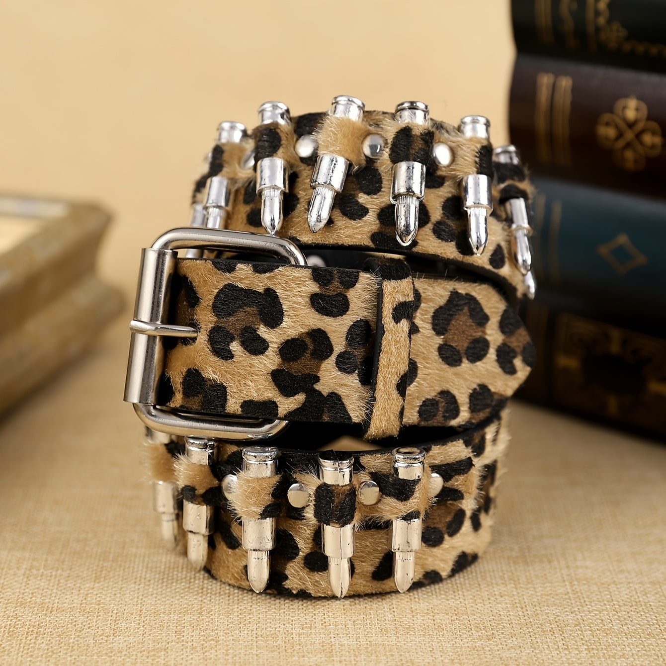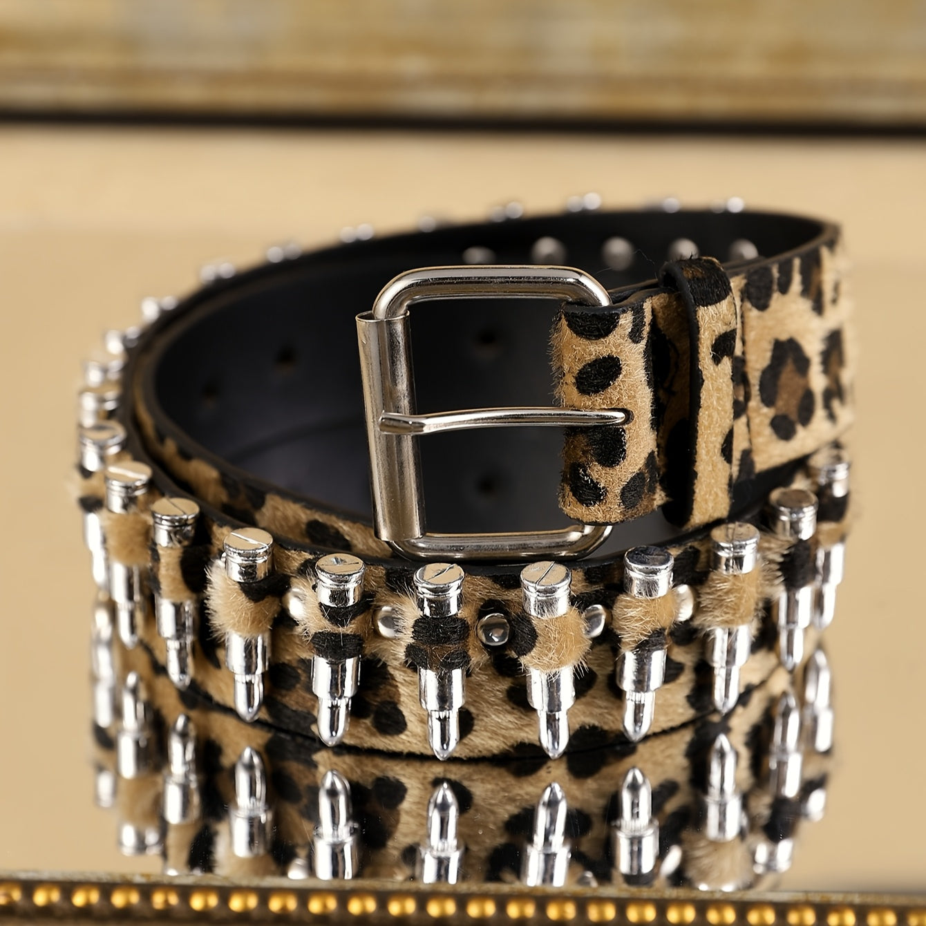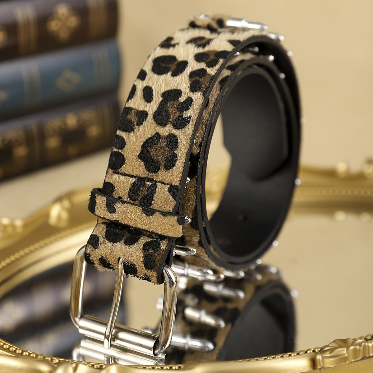 This women's belt features a trendy leopard print design with bullet accents, made of durable metal and PU. Perfect for daily wear.