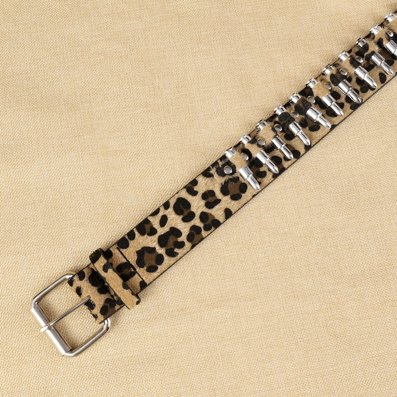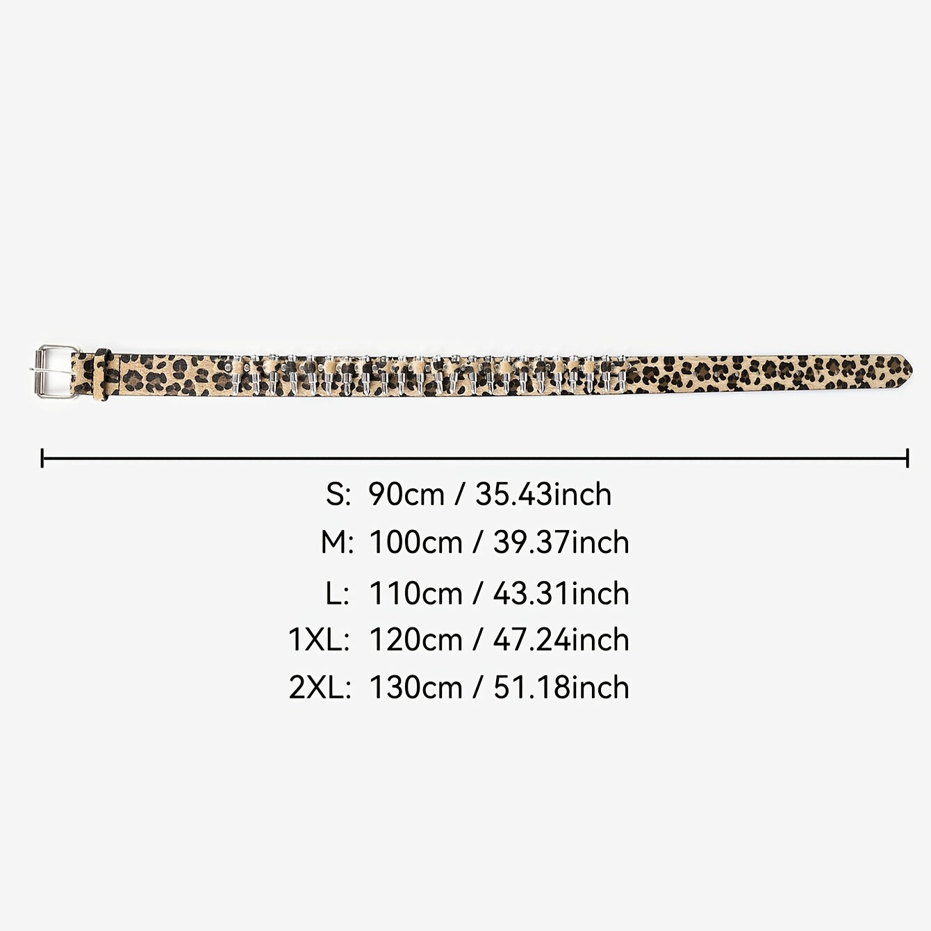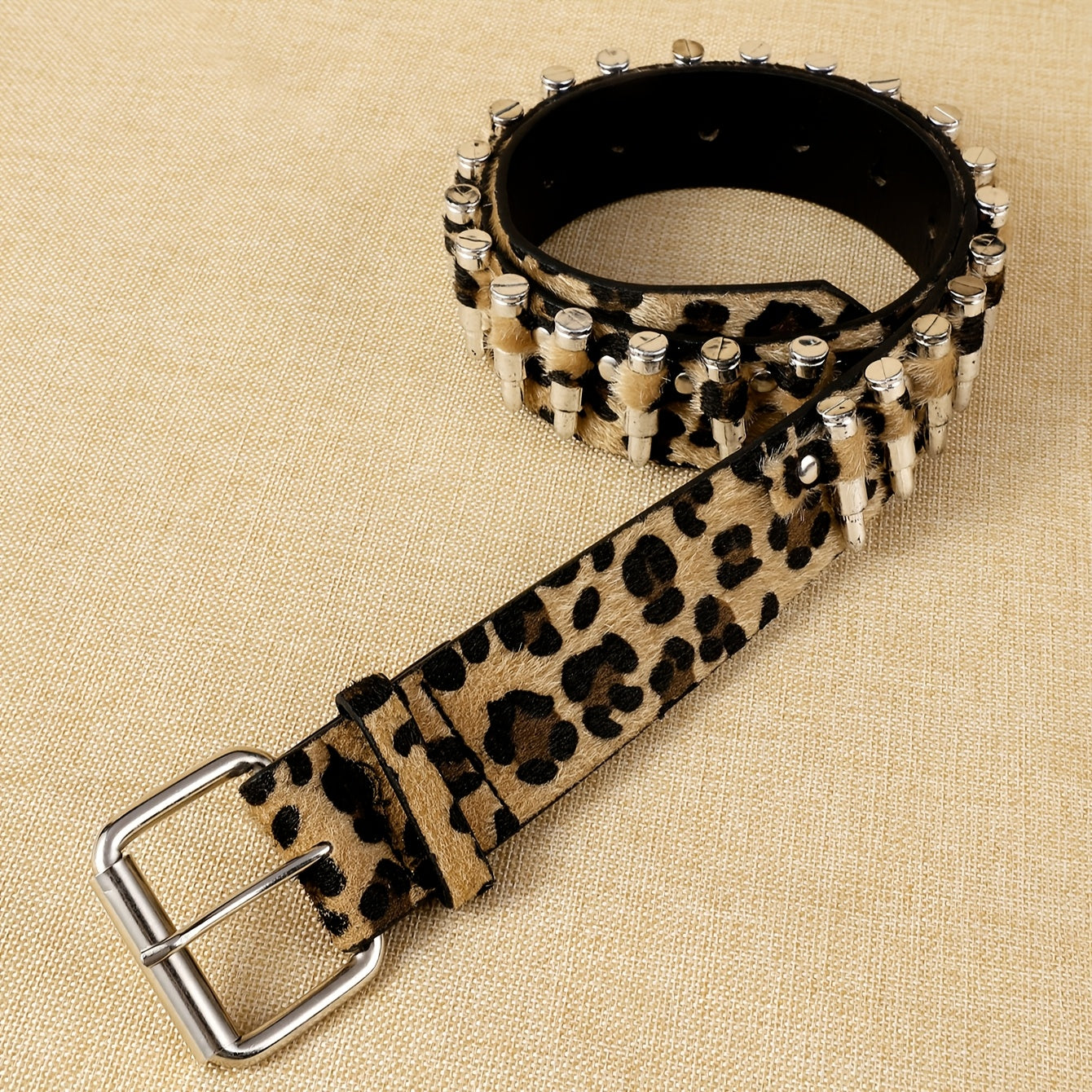 This women's belt features a trendy leopard print design with bullet accents, made of durable metal and PU. Perfect for daily wear.