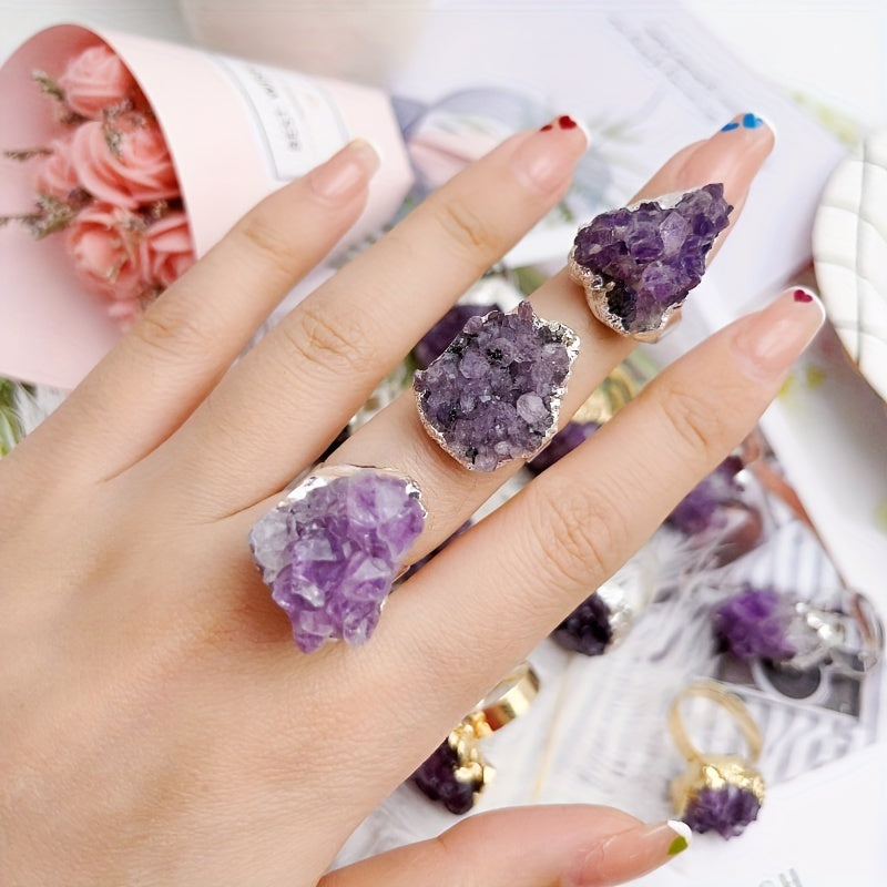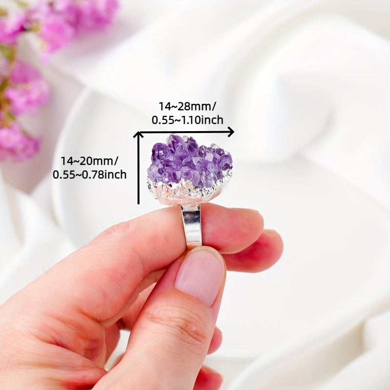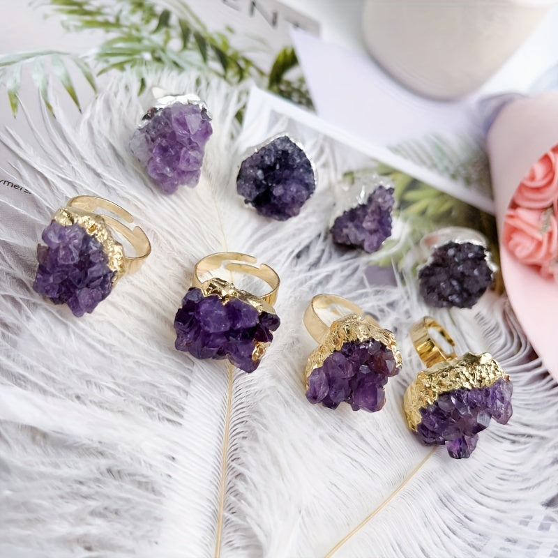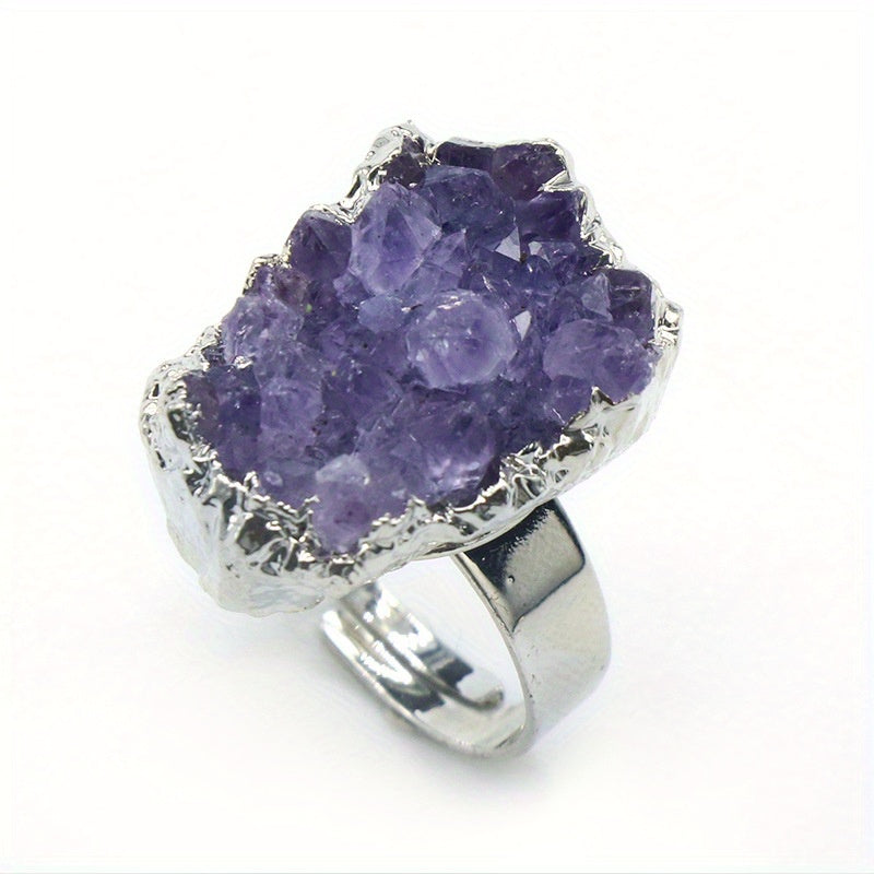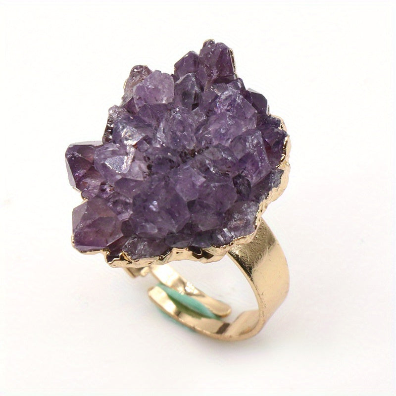 This raw amethyst cluster ring is a powerful healing crystal that enhances spiritual energy and aligns chakras. The adjustable ring is available in golden or silvery finish options for men.