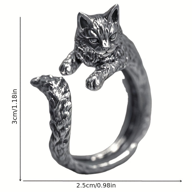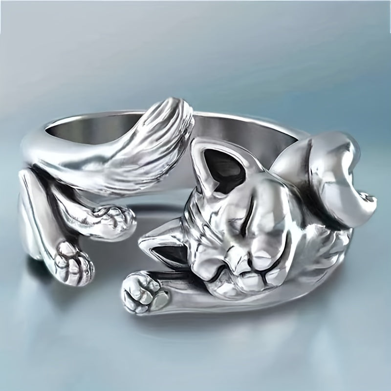 Add a touch of whimsy to your look with this distressed ring featuring a playful kitten design. The adjustable band ensures a comfortable fit for all sizes.