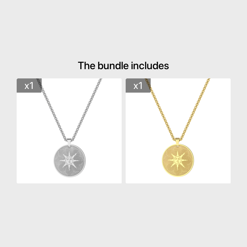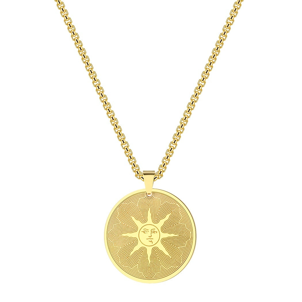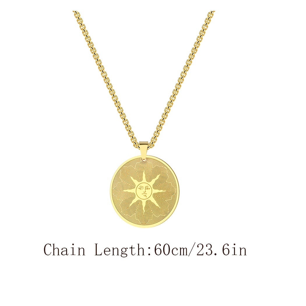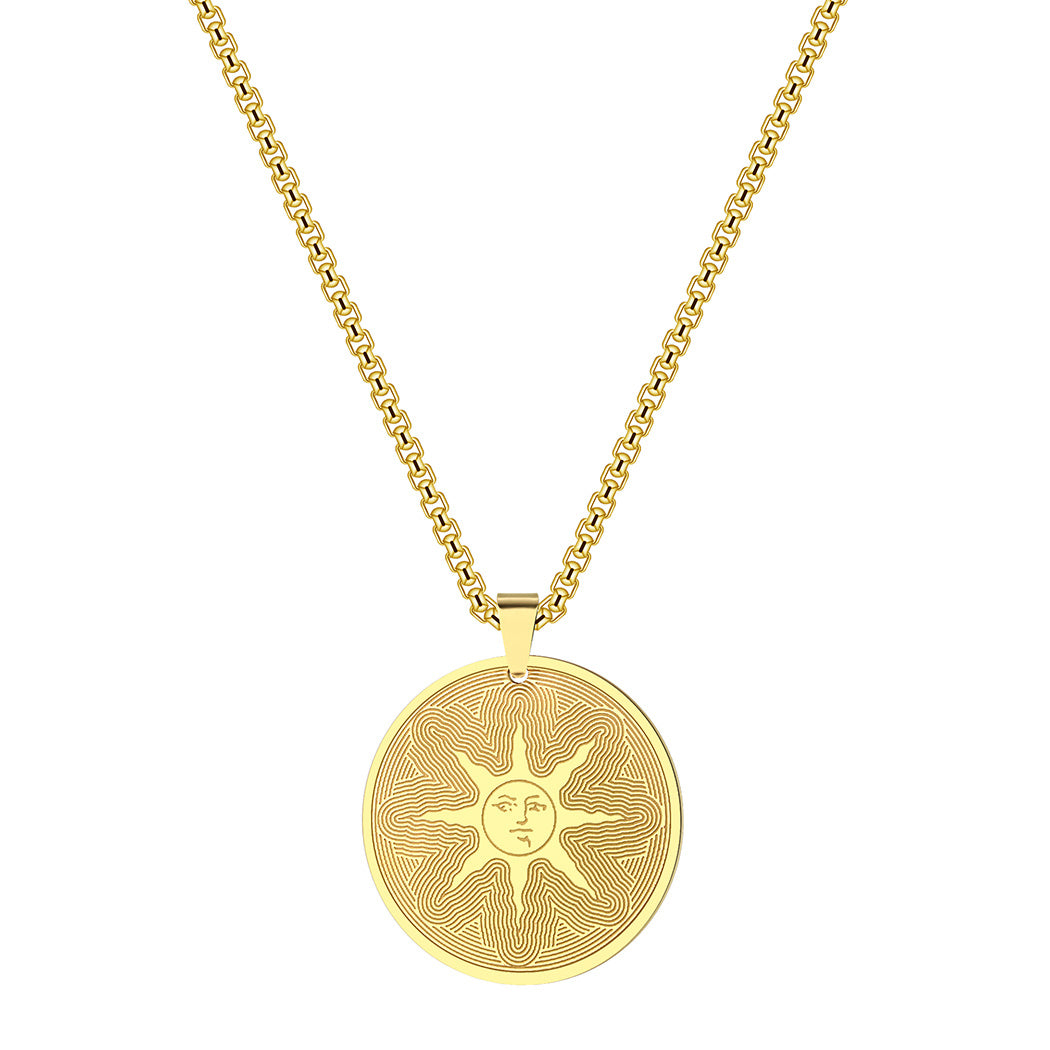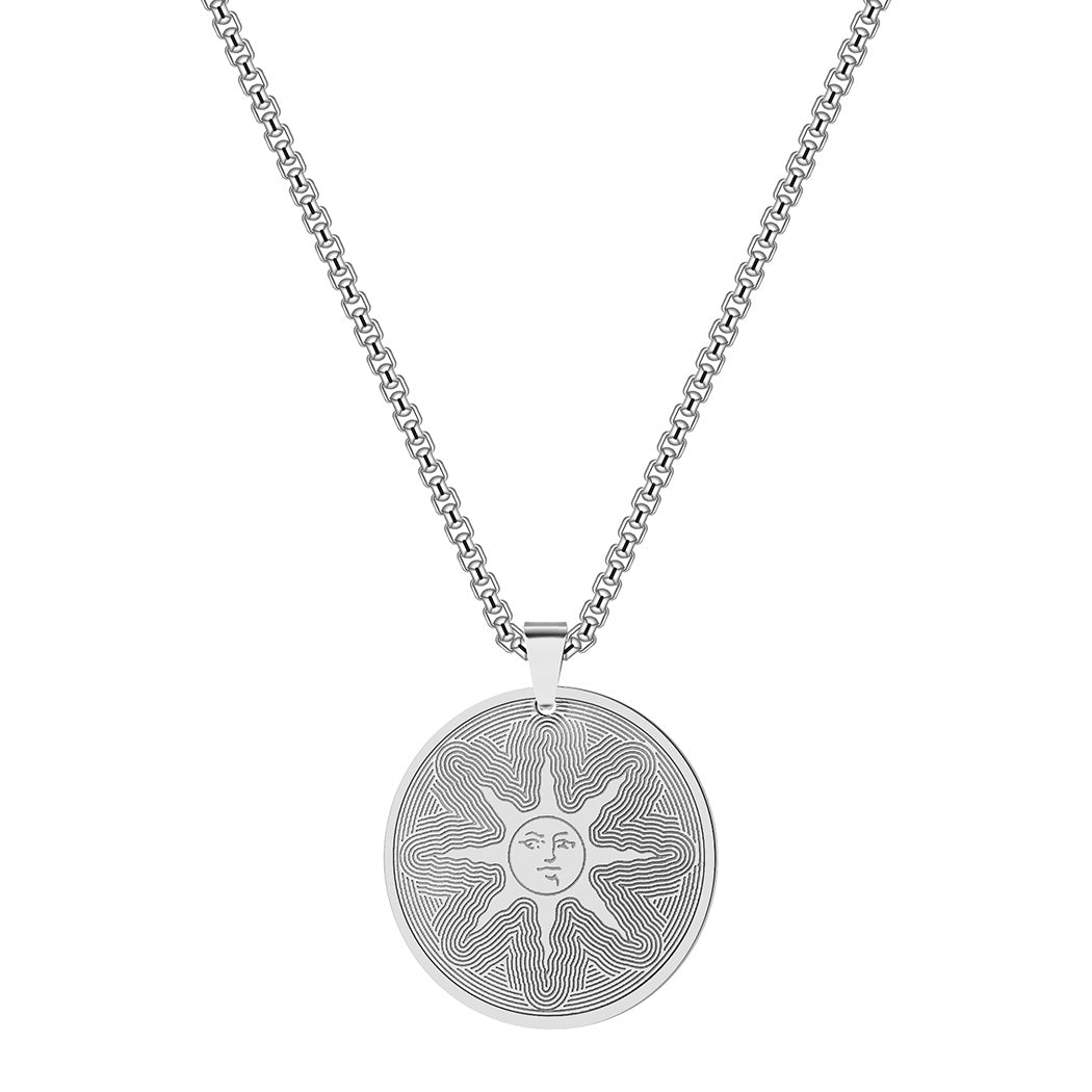 This unique necklace features an embossed coin pendant with a dark souls warrior and solar system design. It is a stylish and meaningful accessory for men.