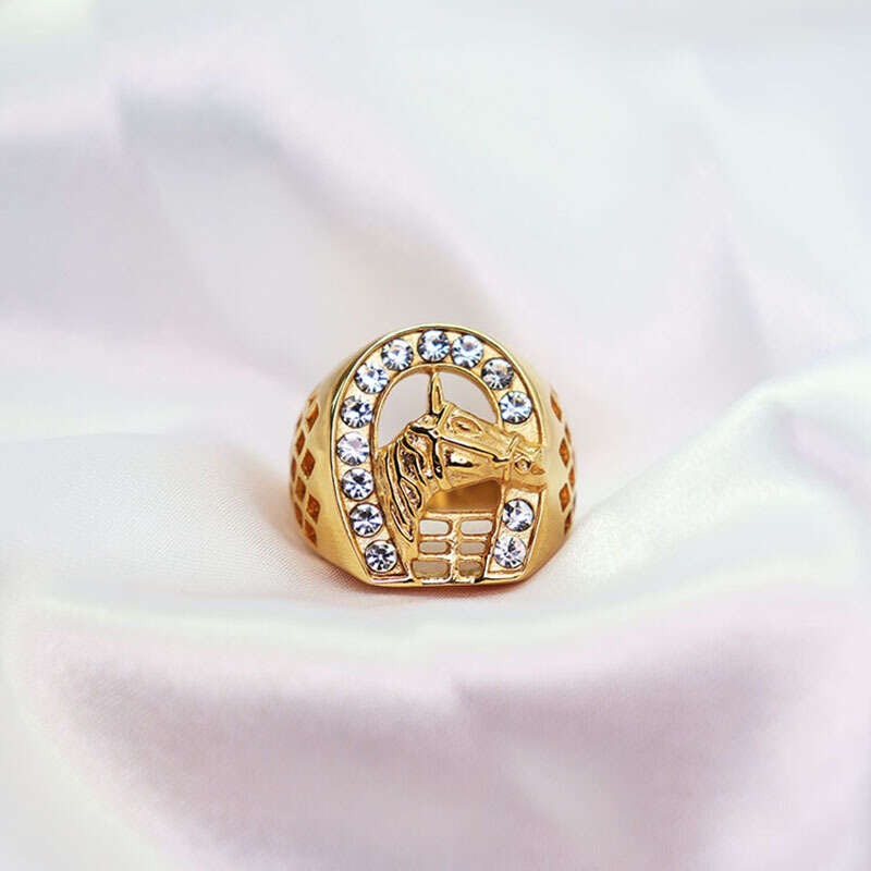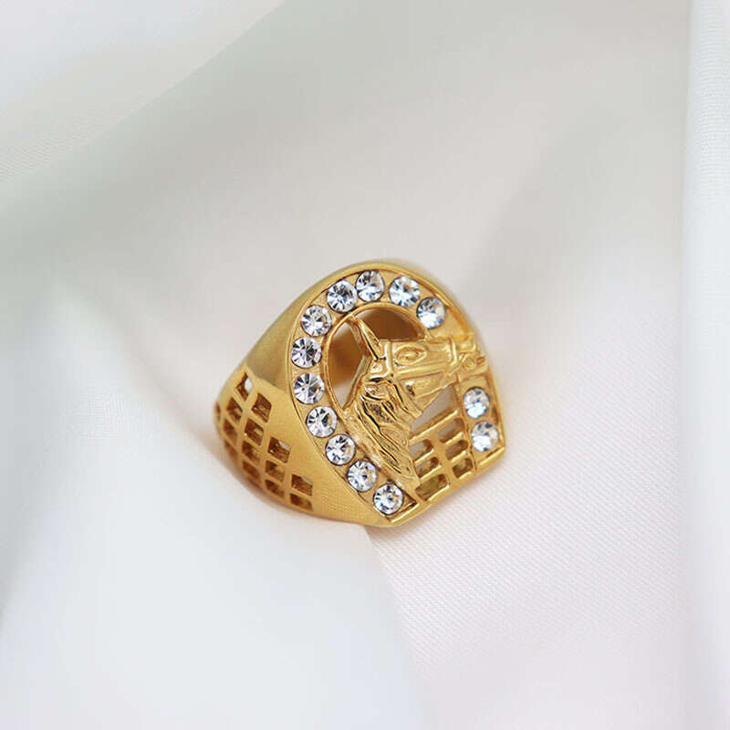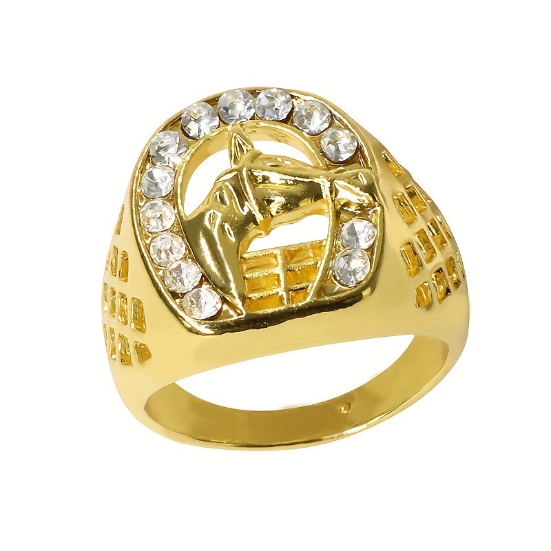 Add a touch of style to your outfit with this hip hop inspired horse head ring featuring a golden plated design and artificial diamond accents.