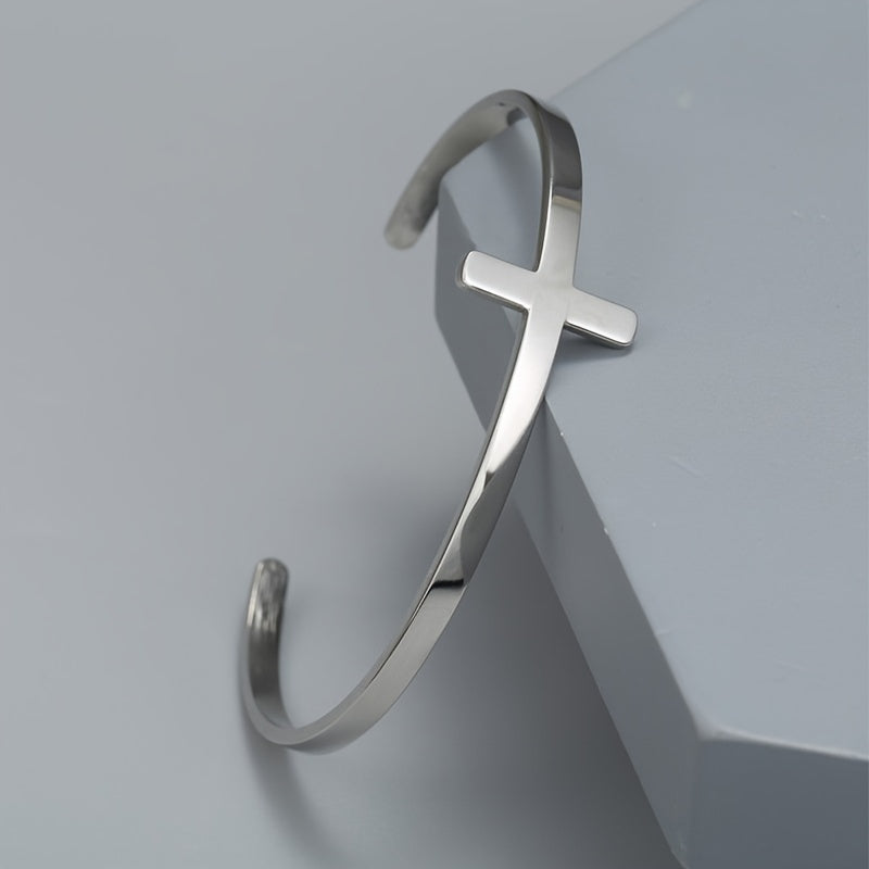 This stainless steel bracelet features a hollow silver cross design, making it a stylish accessory for men.