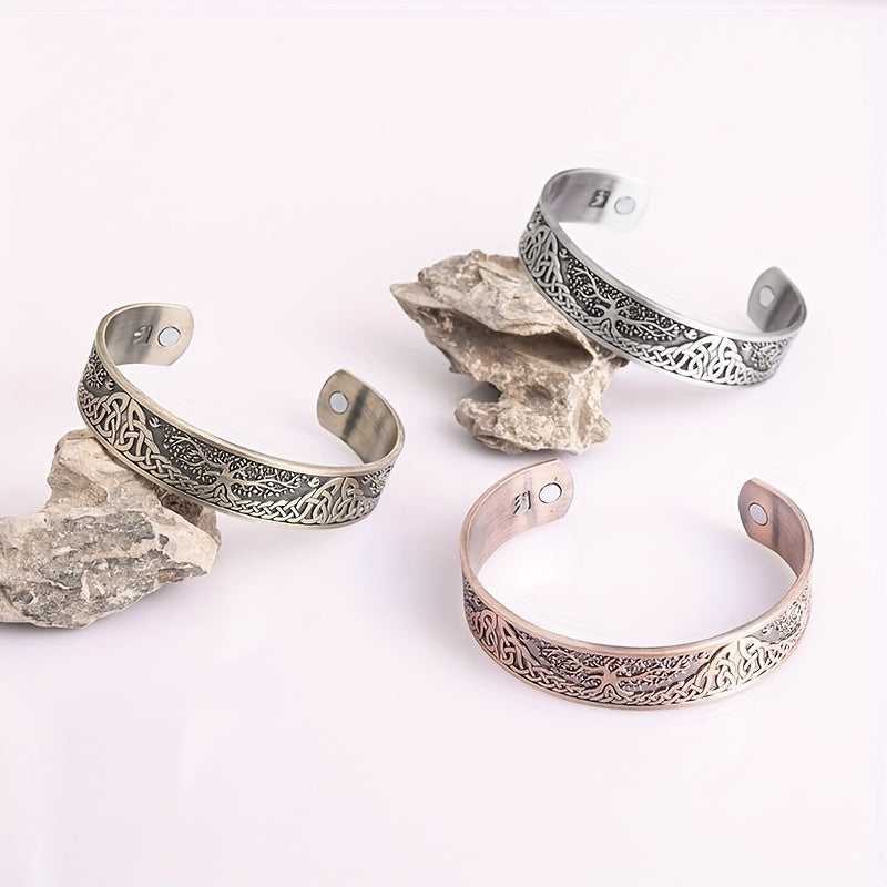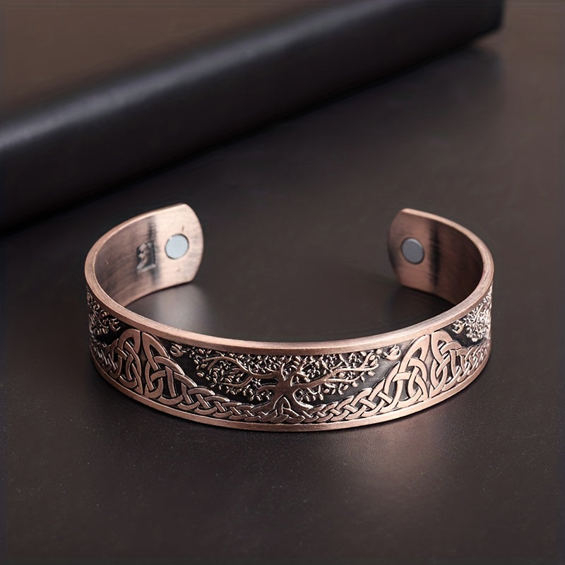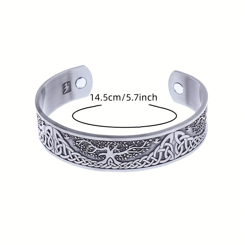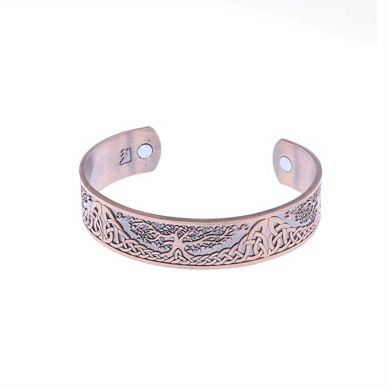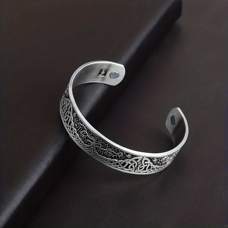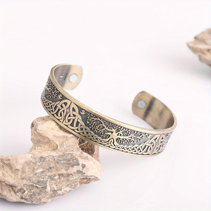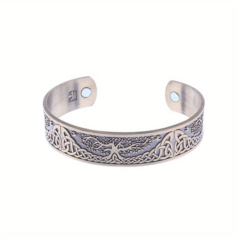 Embrace a touch of ancient inspiration with this vintage Viking cuff bracelet featuring intricate carved Celtic knot design of the World Tree. Perfect for casual everyday wear.