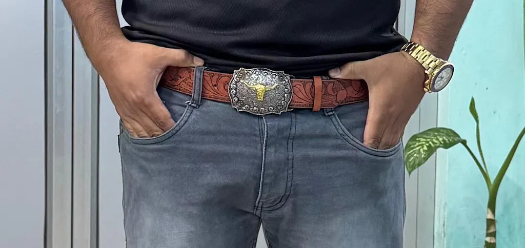 This men's wide western cowboy belt features a distinctive cow head pattern belt buckle, perfect for pairing with cowboy jeans.