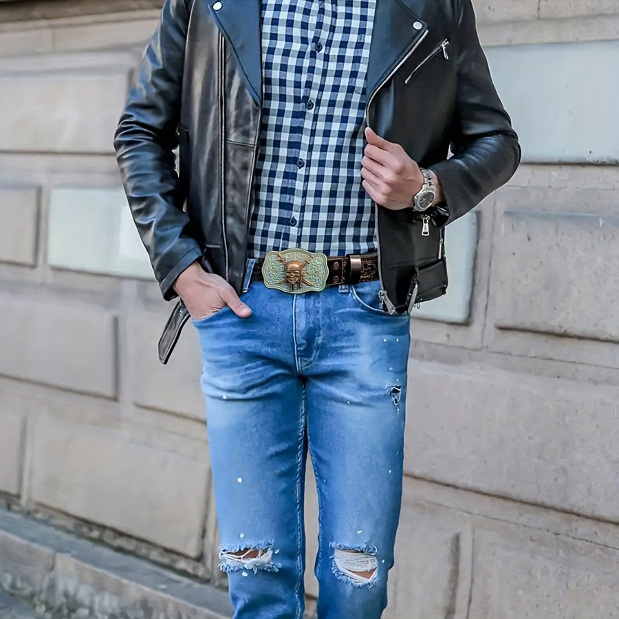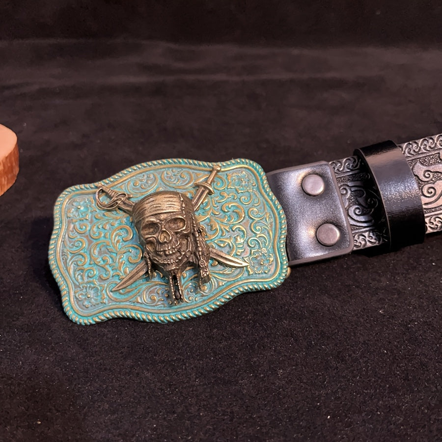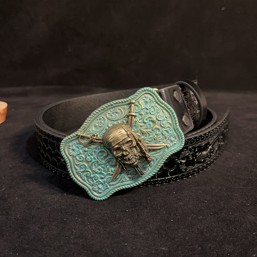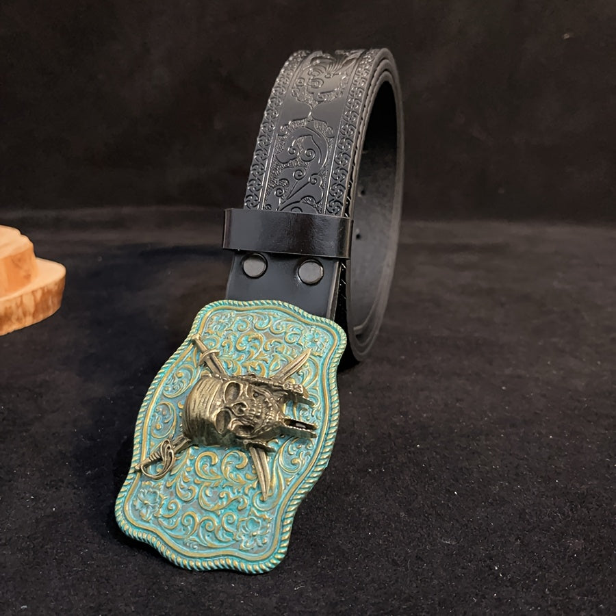 Men's Y2K Western Cowboy Belt with Golden Pirate Skull & Floral Buckle