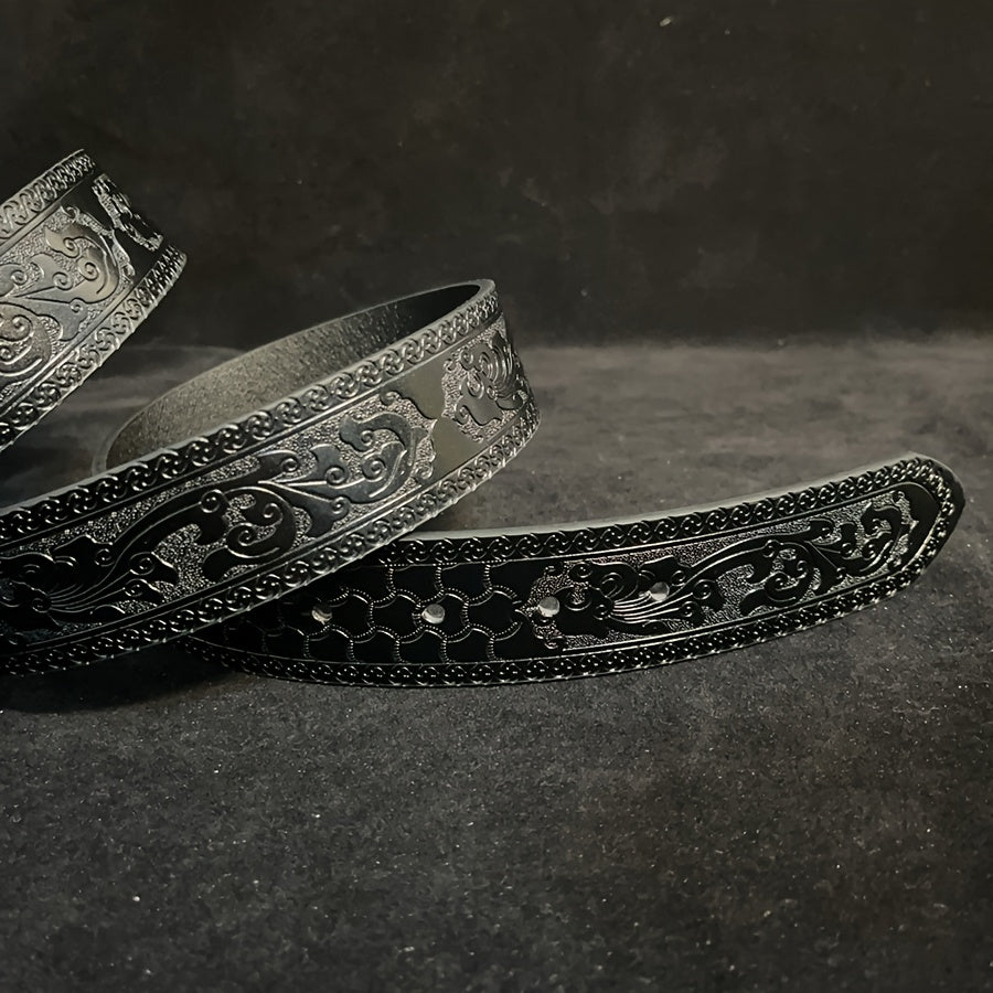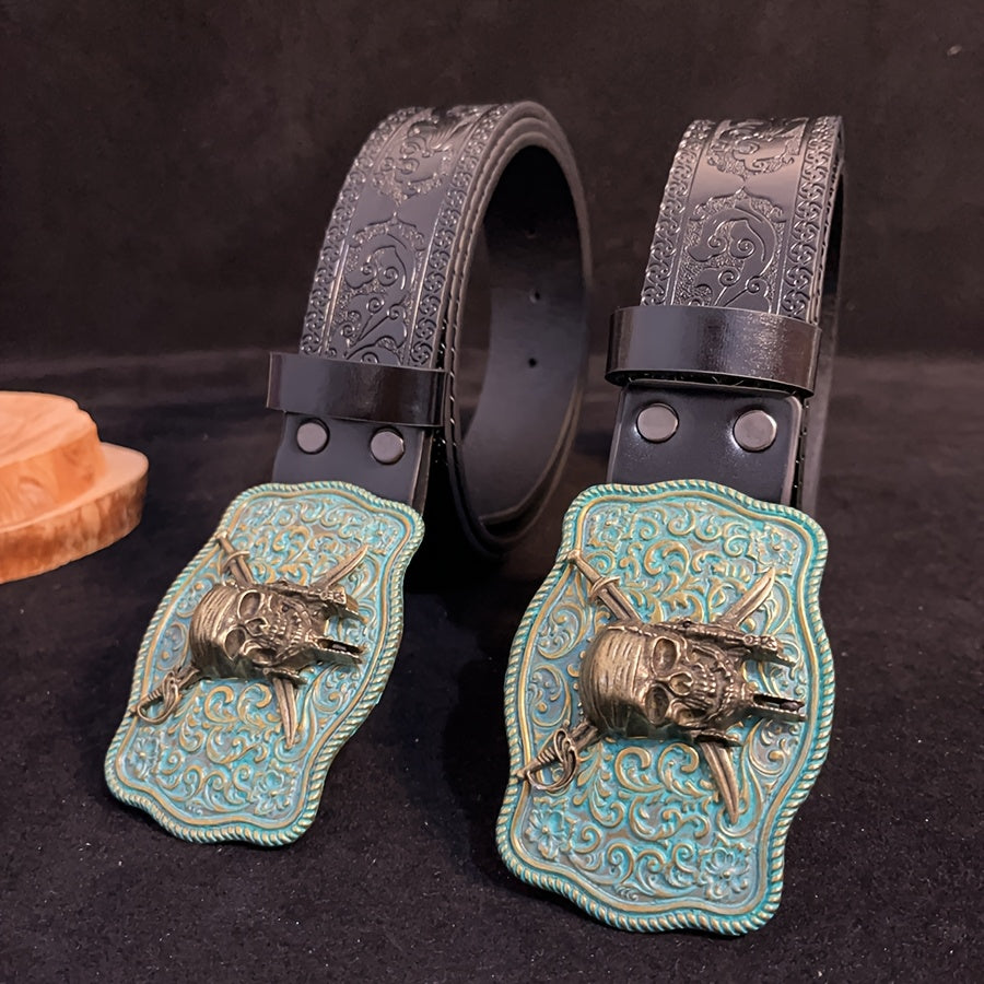 Add a touch of rugged style to your outfit with this Y2K Western cowboy belt. The faux leather design features a golden pirate skull & floral engraved alloy buckle, making it perfect for jeans and casual wear.