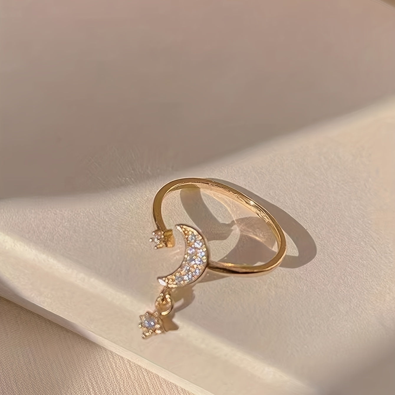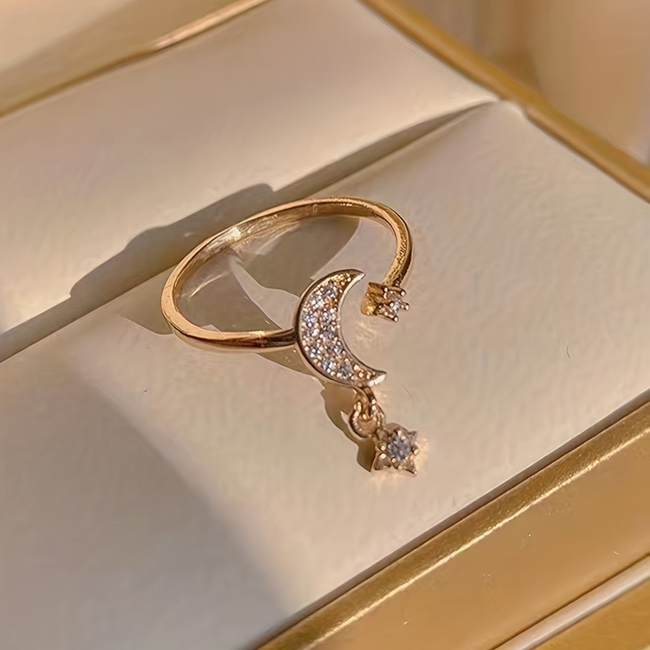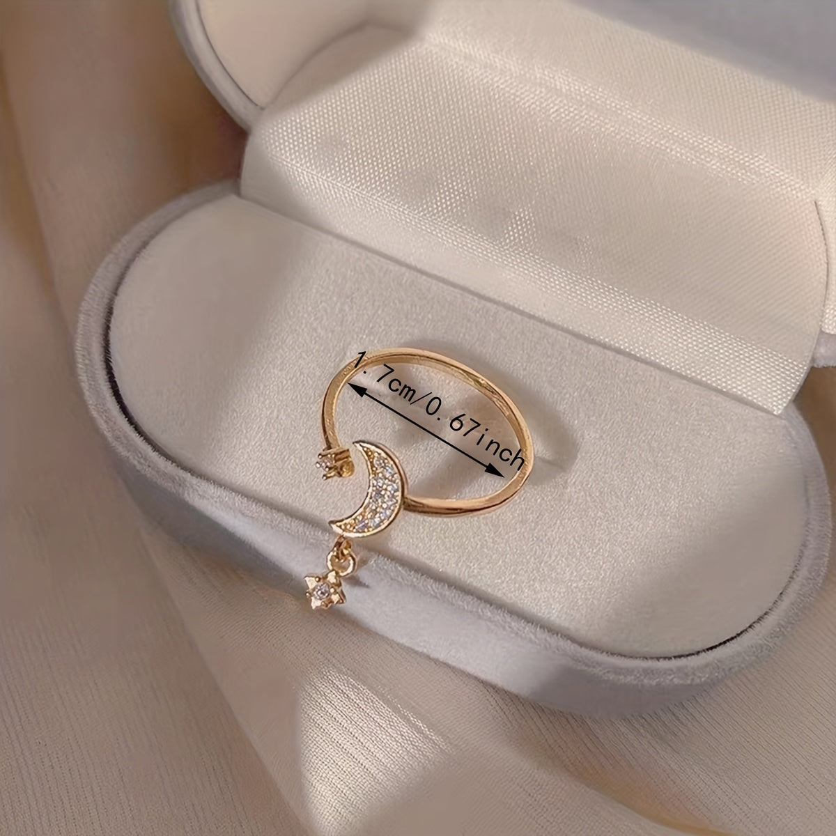 Add a touch of sparkle to your daily outfits or party looks with this dazzling moon and star ring. The shining zircons make this accessory stand out.
