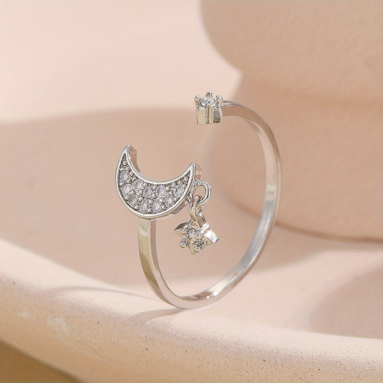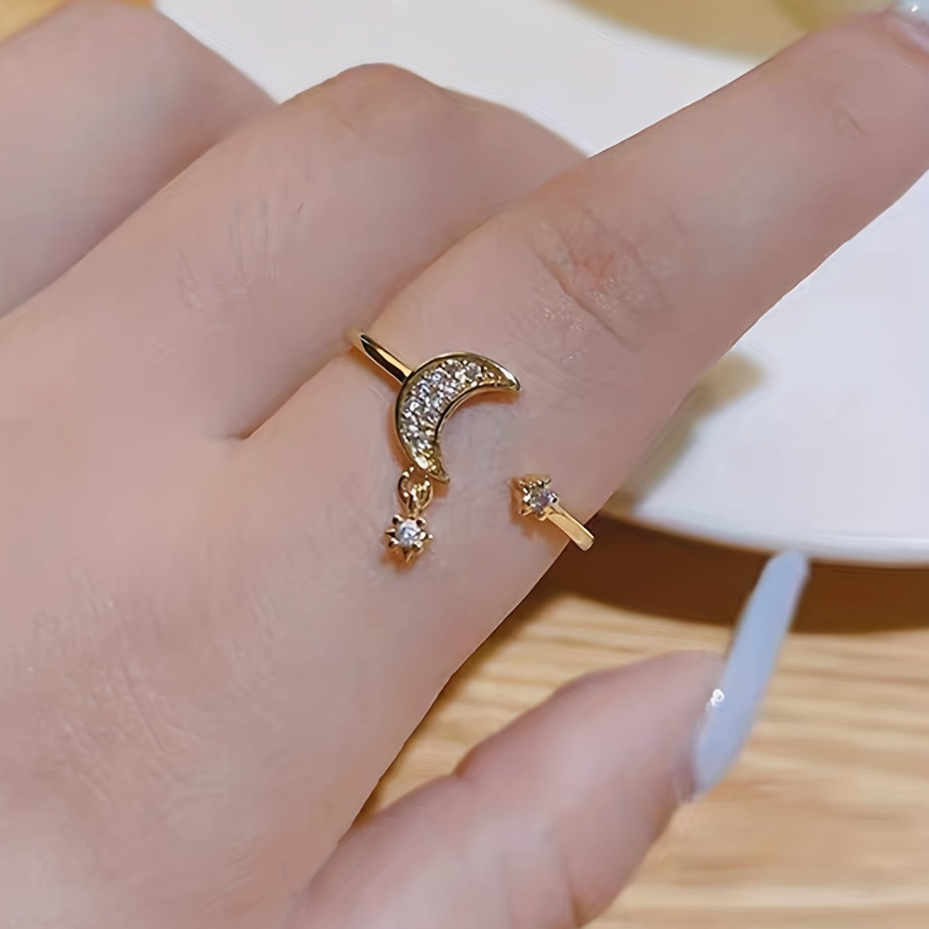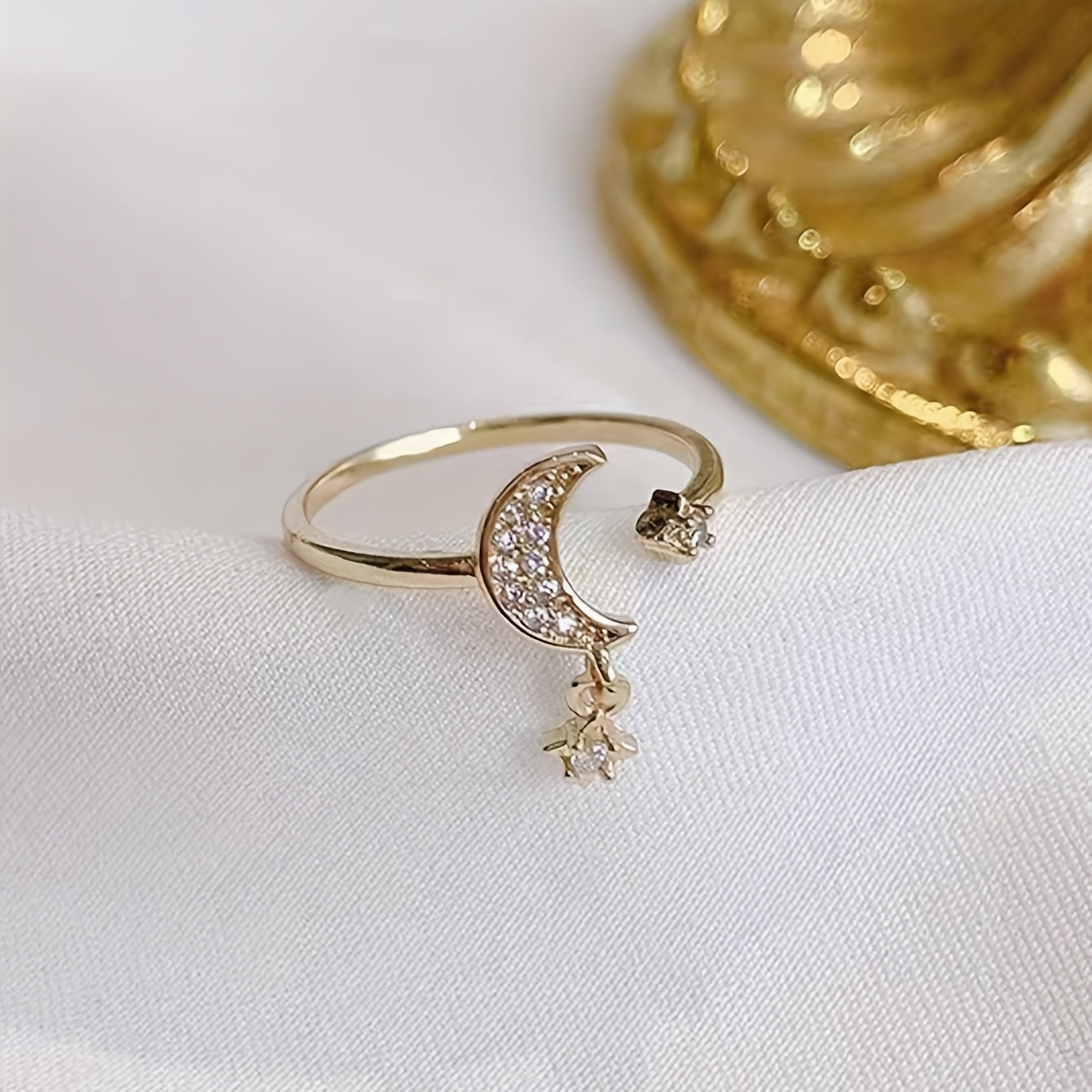 Add a touch of sparkle to your daily outfits or party looks with this dazzling moon and star ring. The shining zircons make this accessory stand out.