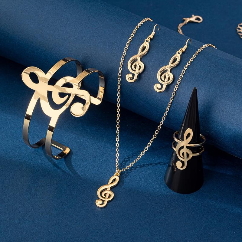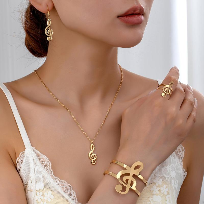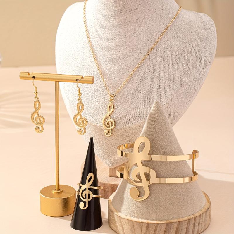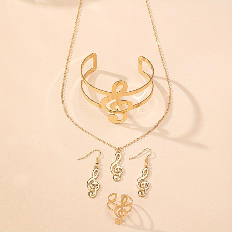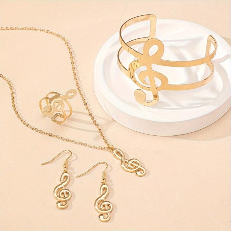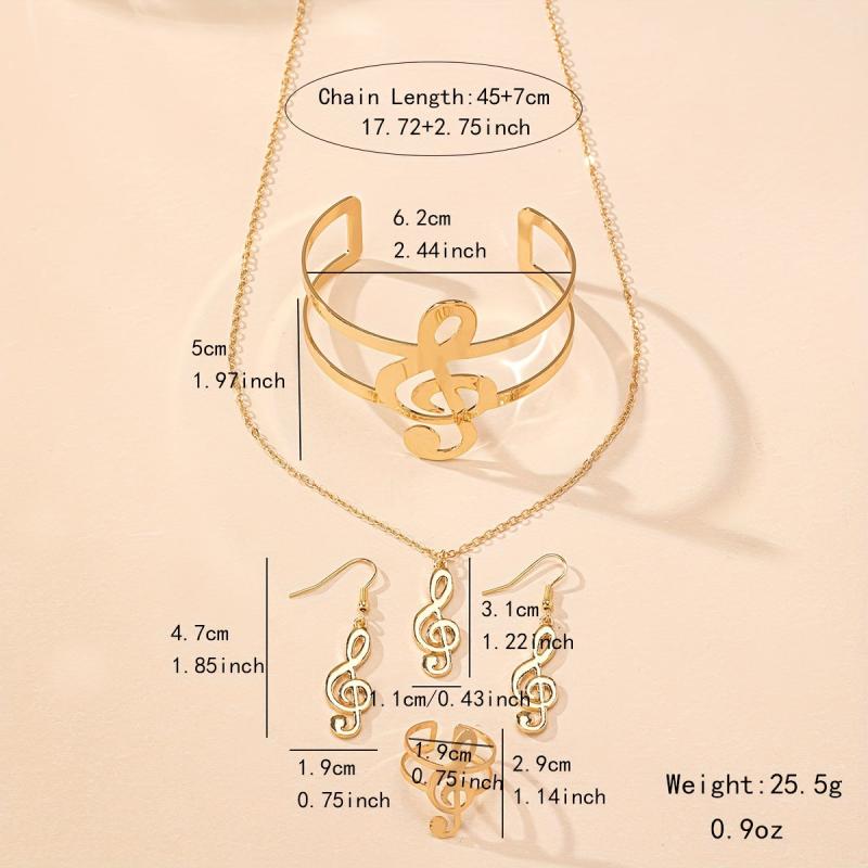 Complete your look with this music note jewelry set, featuring a necklace, dangling earrings, a statement bracelet, and a ring. Perfect for everyday wear and music festivals.