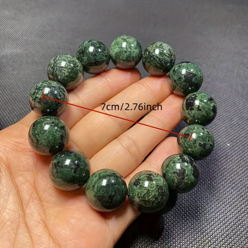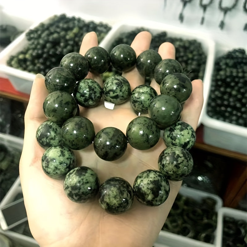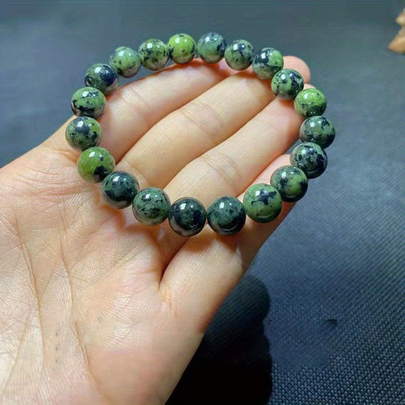 This men's bracelet features natural olive green jade stones combined with meteorite and graphite beads. The unique blend of stones creates a stylish and masculine accessory.