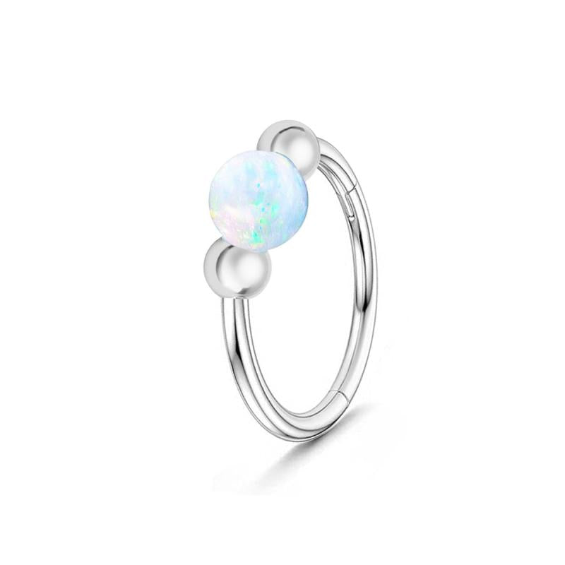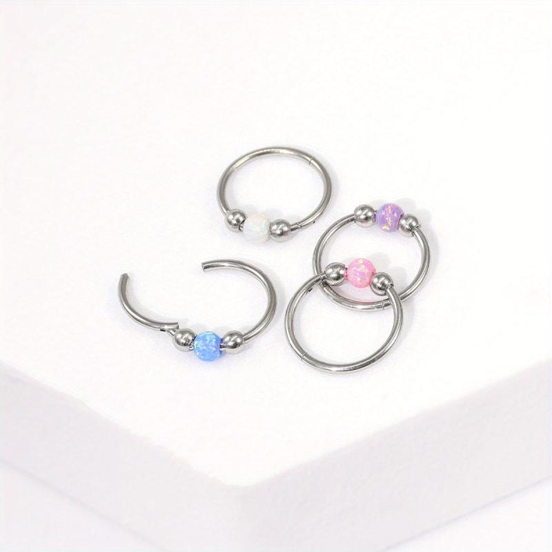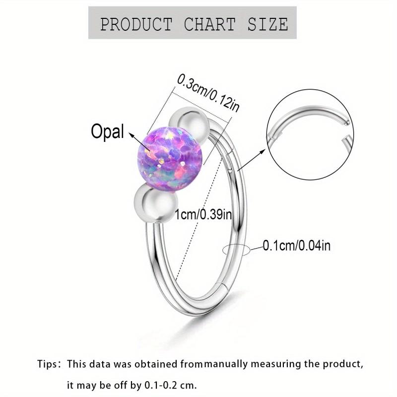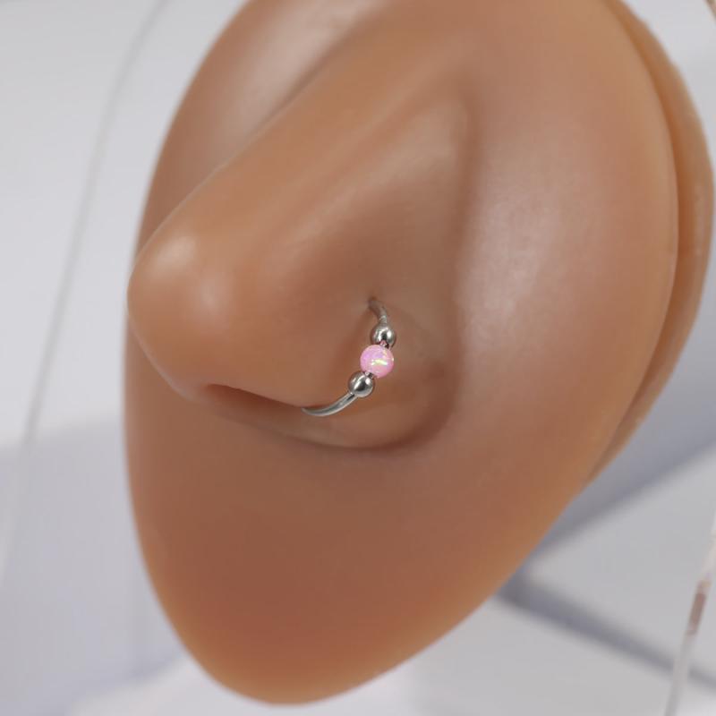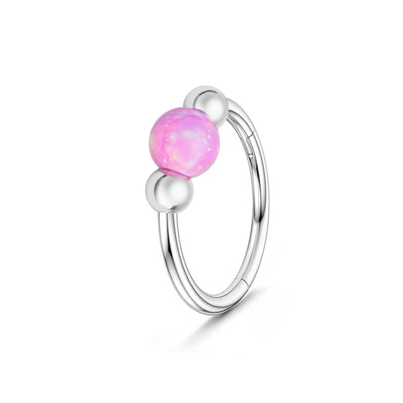This set includes a nose ring, septum ring, and earrings with colorful pink and purple artificial opal balls. Perfect for conch piercing. The set also features a spiral nose ring hoop chain.