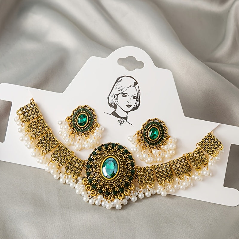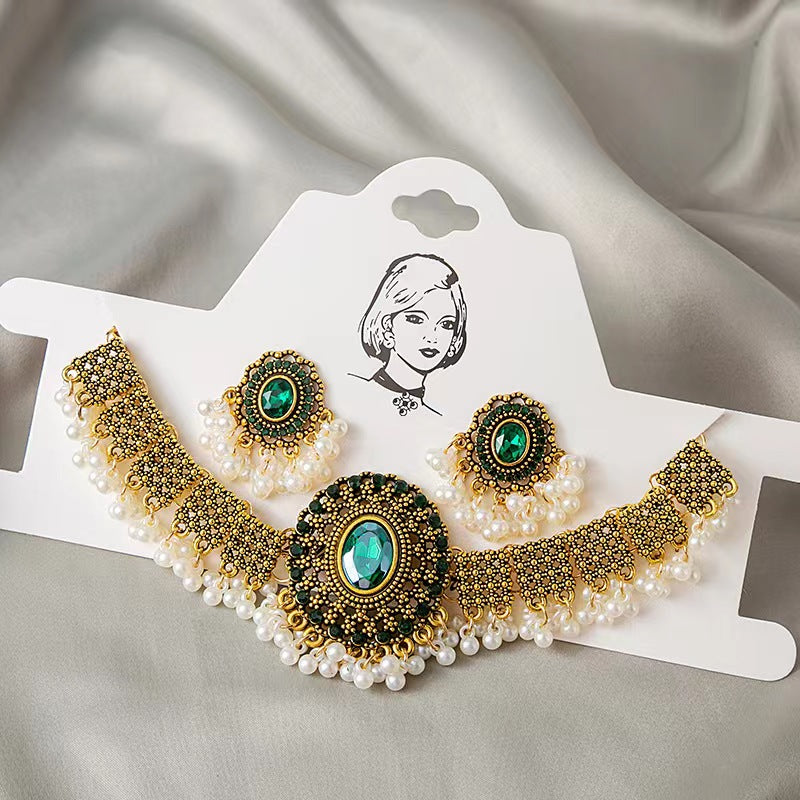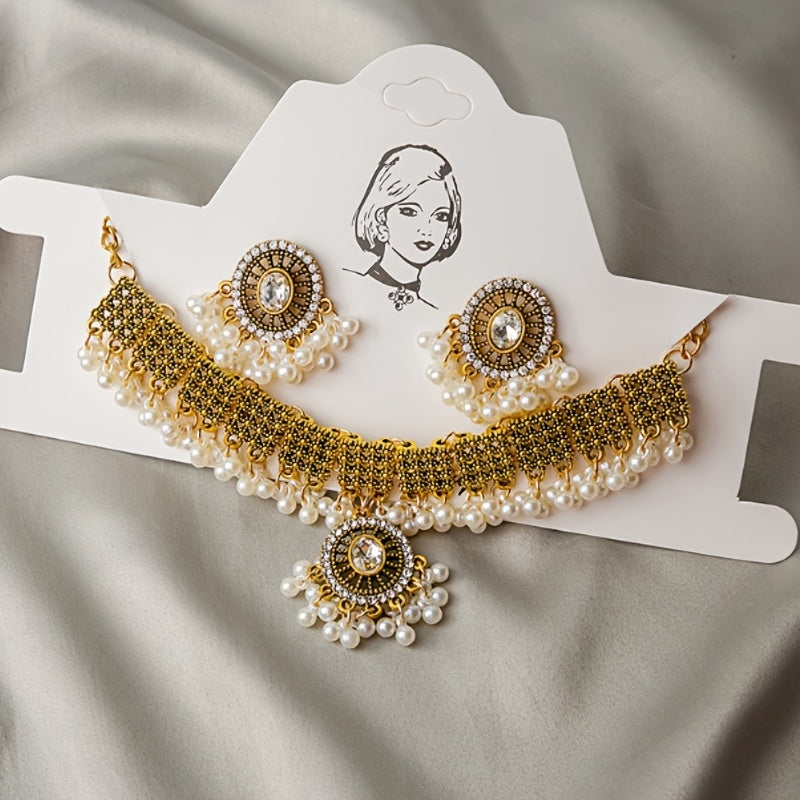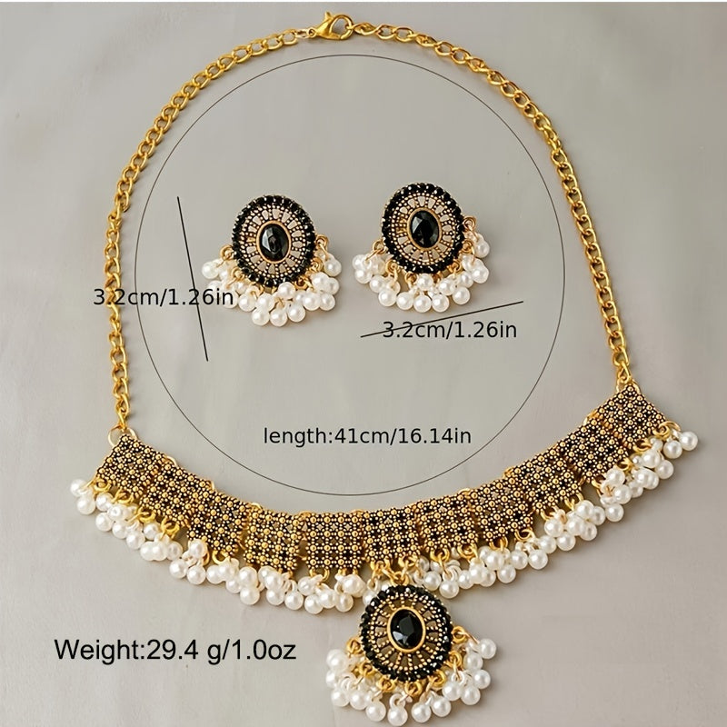 Enhance your look with this elegant pearls jewelry set. The set includes a pendant necklace and stud earrings made from copper, featuring beautiful pearls.