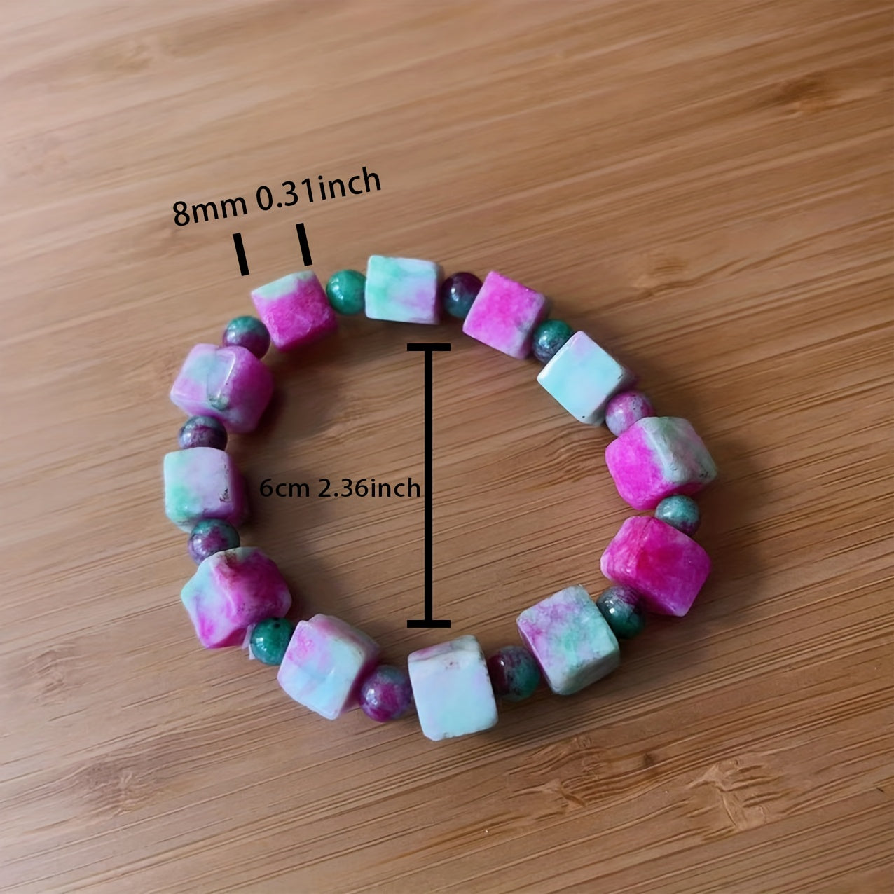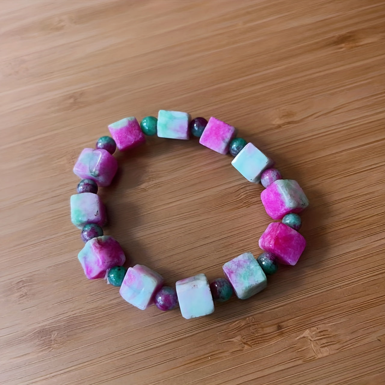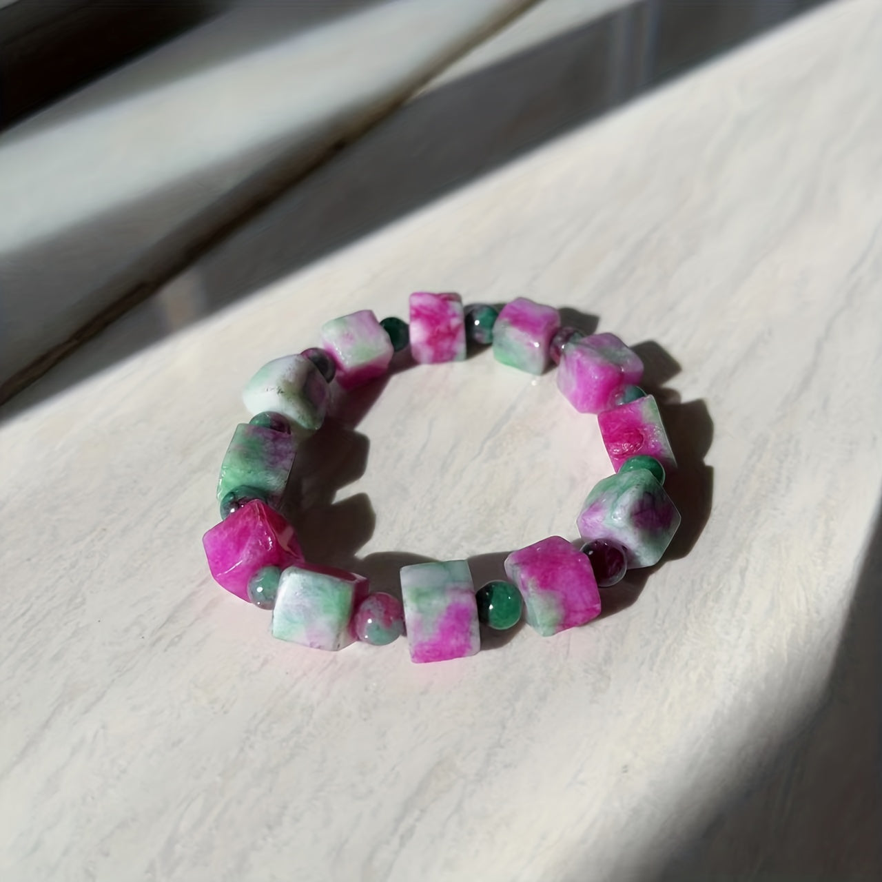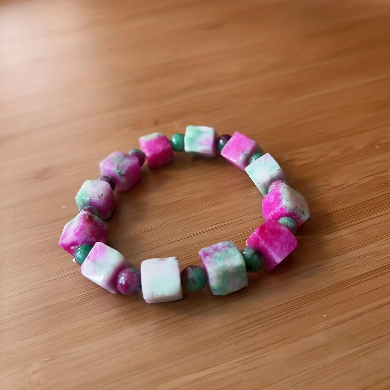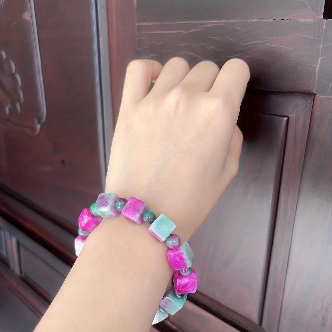 This beautiful bracelet features pink peach blossom jade stones in a stereo square design. It is perfect for women looking for a unique and stylish piece of jewelry.