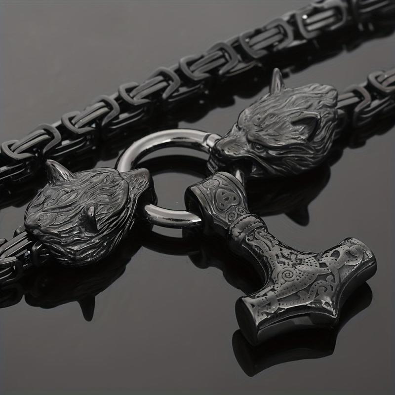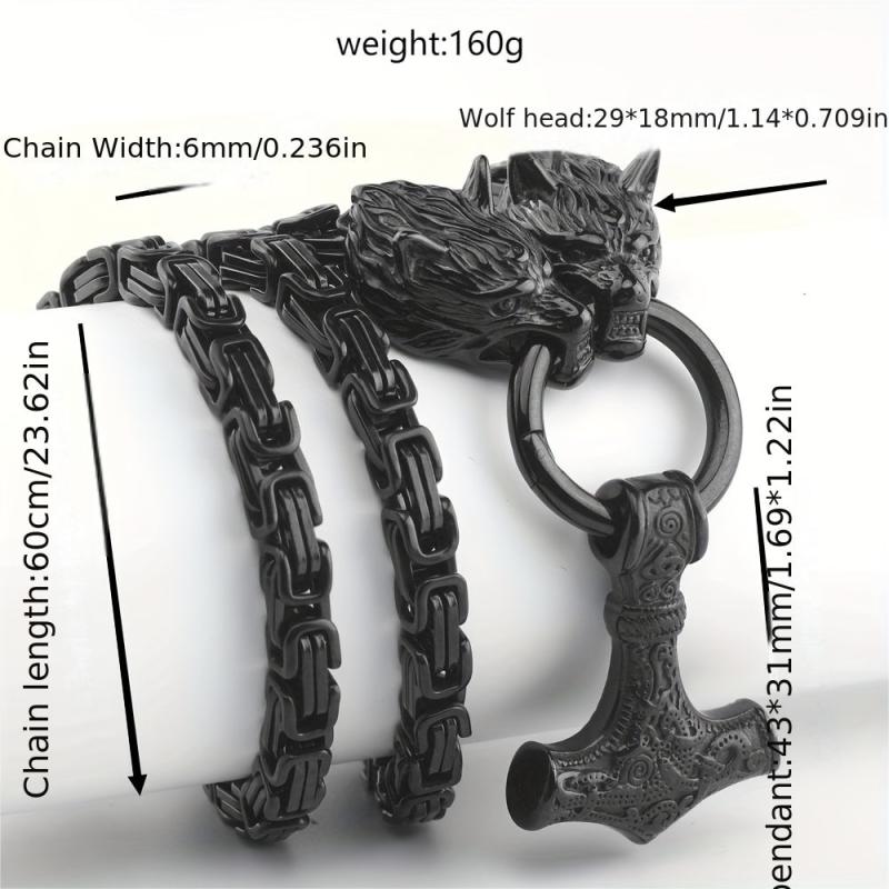 Add a touch of rebellious style to your outfit with this stainless steel hammer pendant necklace featuring a Viking-inspired wolf head totem. Perfect for those who embrace punk rock fashion.