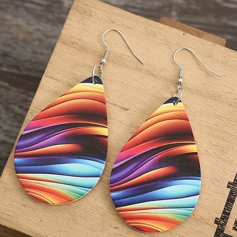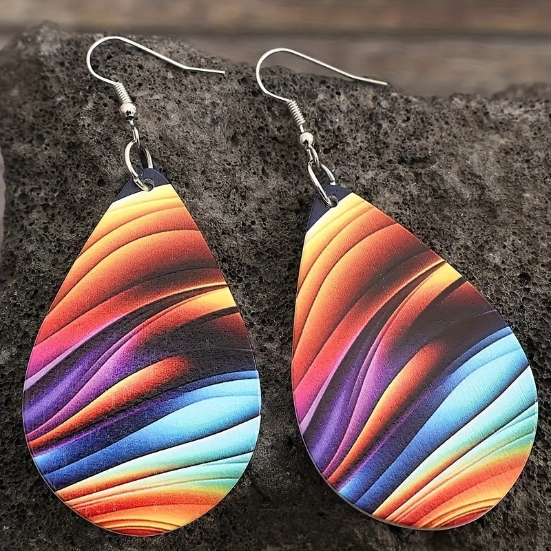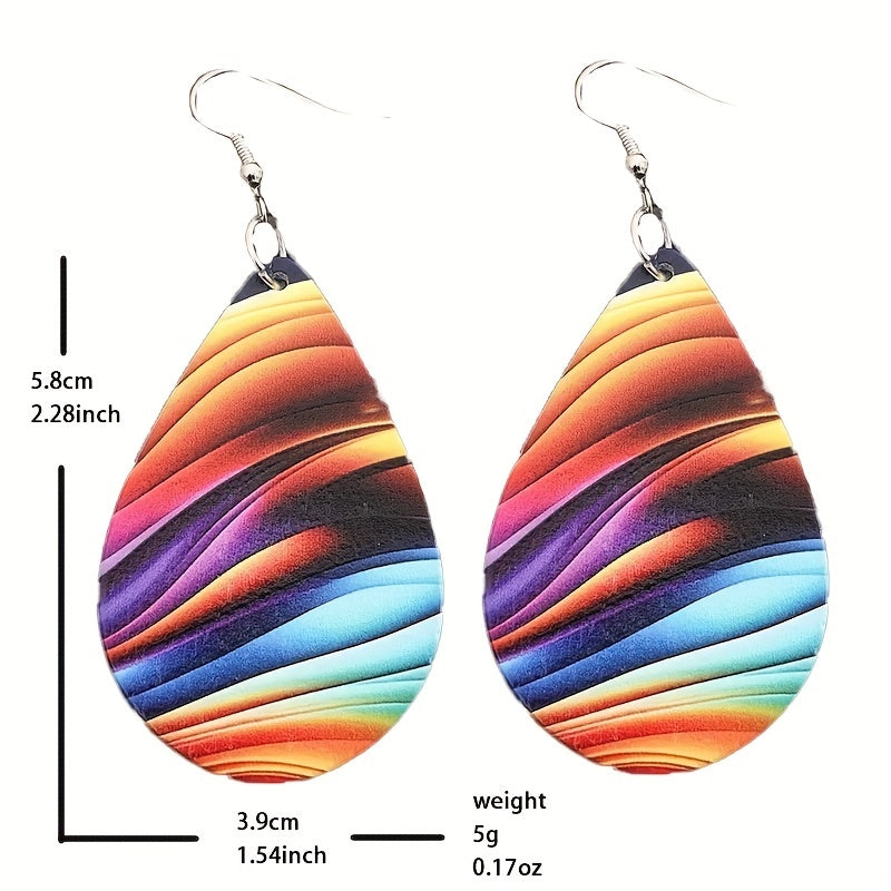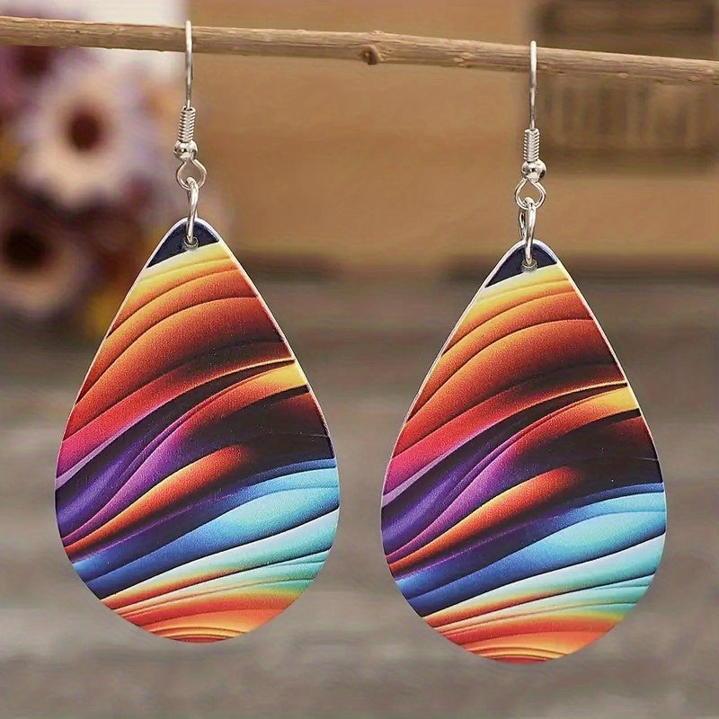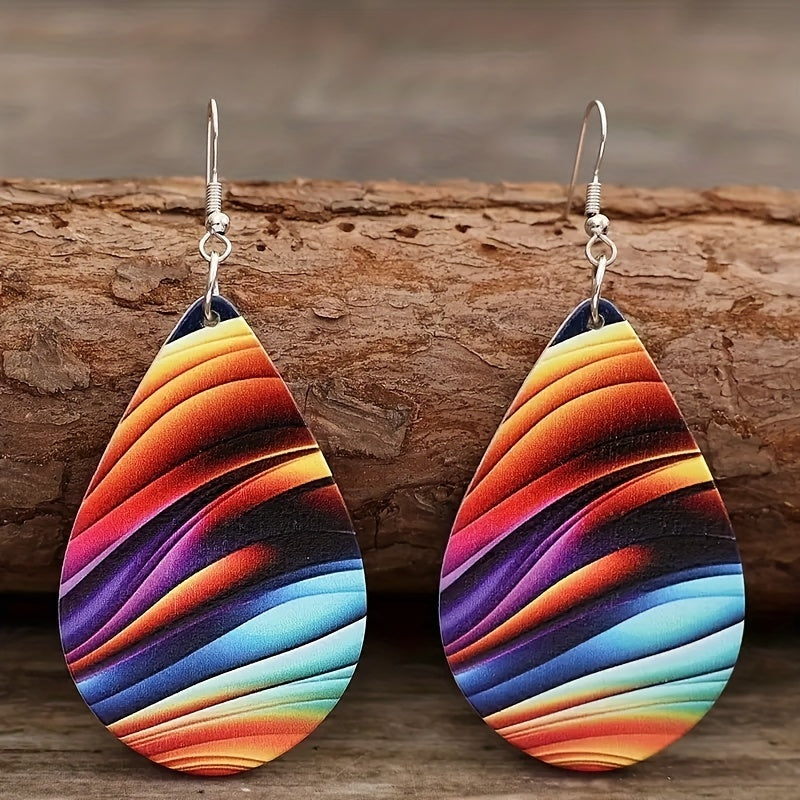 Add a pop of color to your look with these rainbow water drop earrings. Made with wooden material, these earrings are perfect for a stylish and casual outfit.