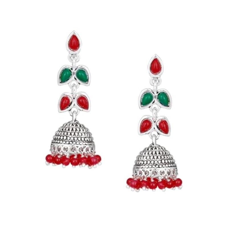These stunning jhumka earrings feature a red and green metal design with brass oxidised silver and floral enamel detailing. They are adorned with a red colour pearl drop for added elegance.