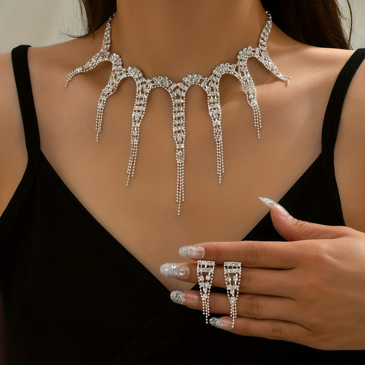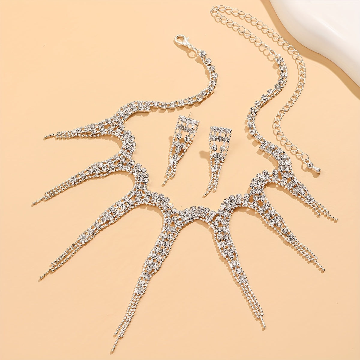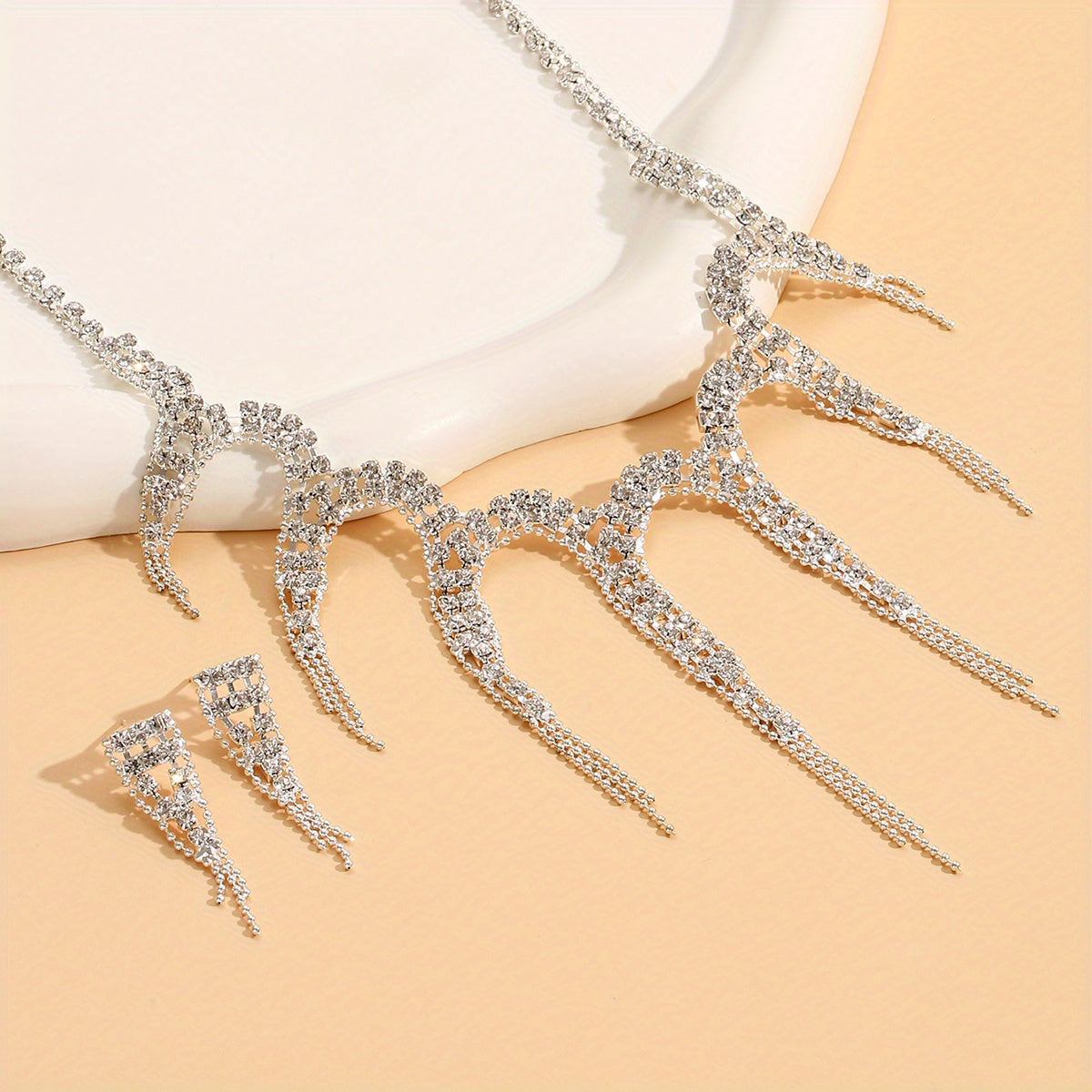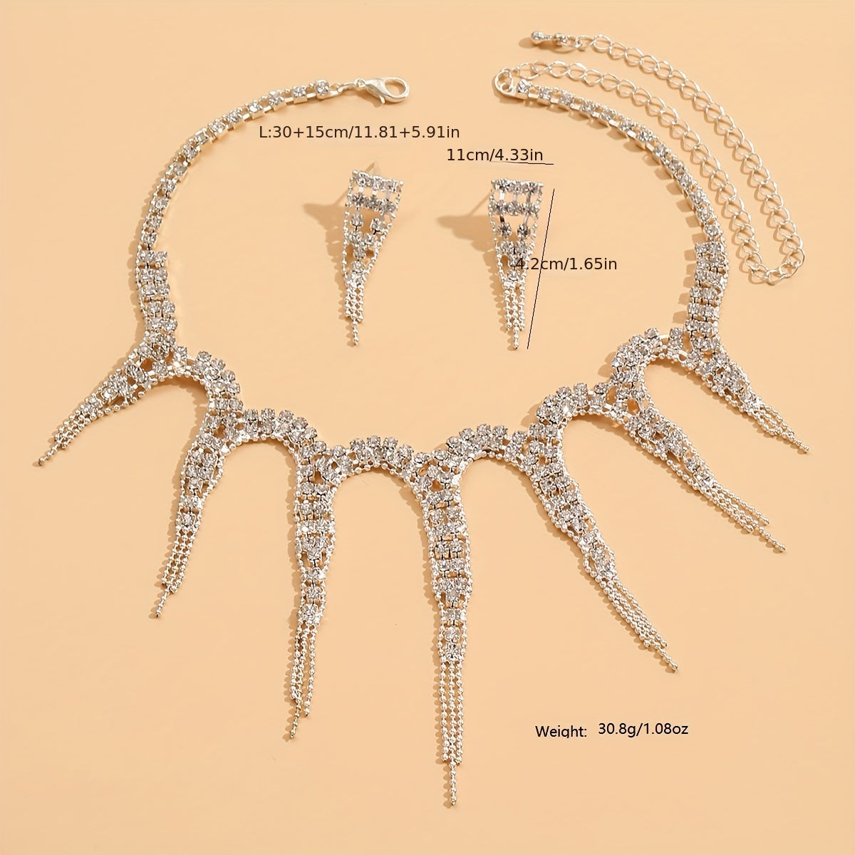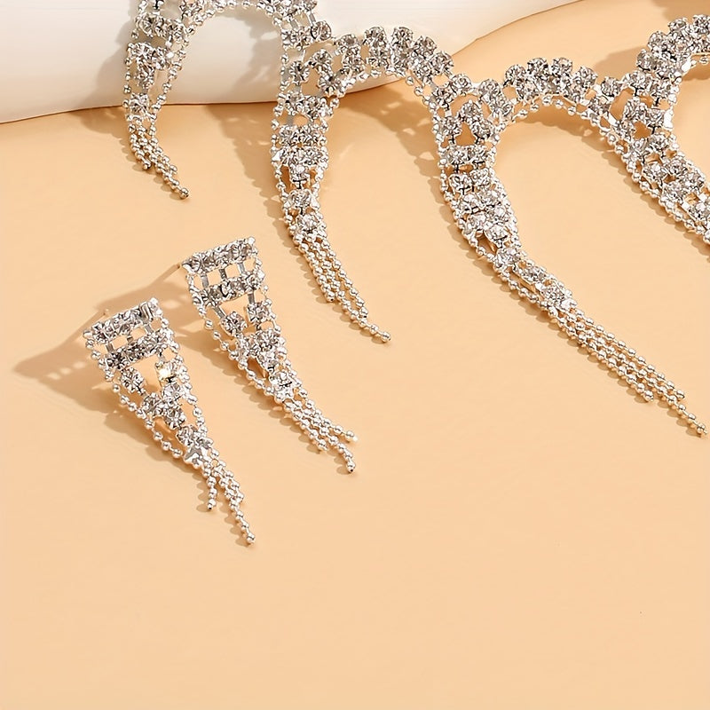 Complete your evening party look with this elegant inlaid rhinestones jewelry set. Includes a pendant necklace and dangle earrings that add a touch of sparkle to your outfit.