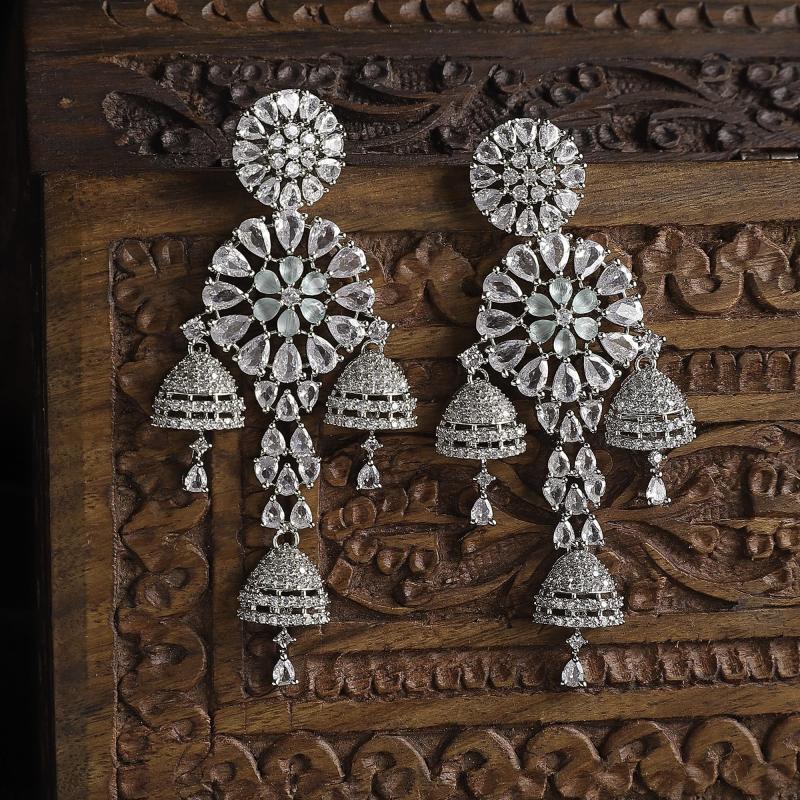 Elegant handcrafted drop earrings featuring circular design with American diamond studs. Rhodium-plated for a brilliant shine.