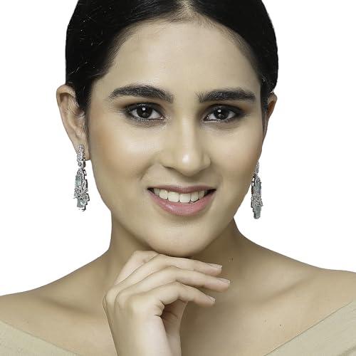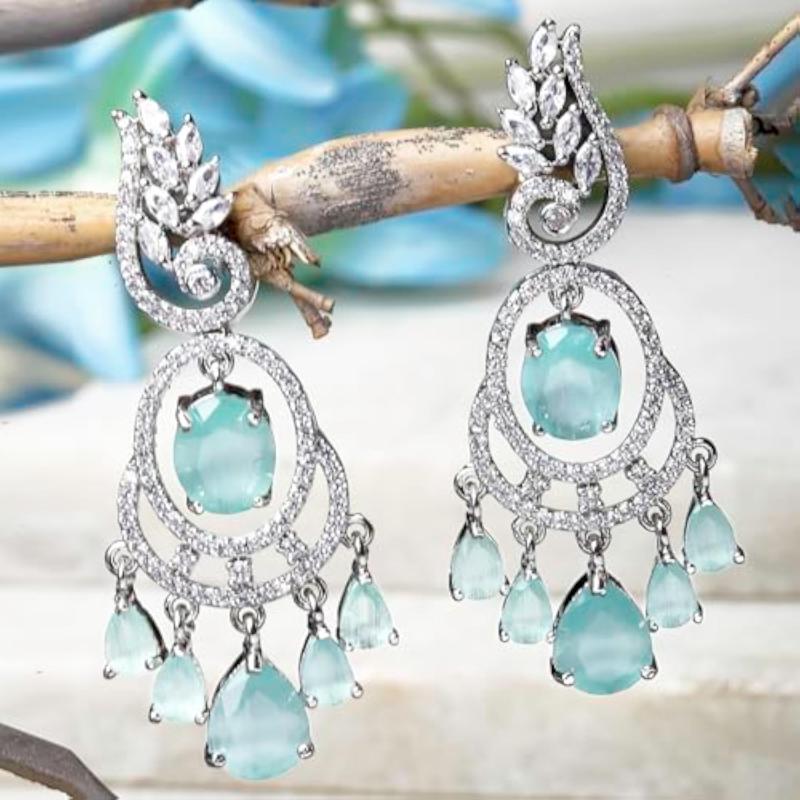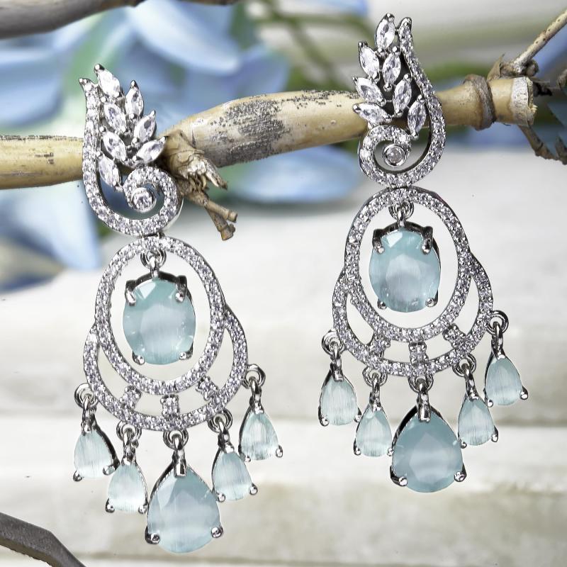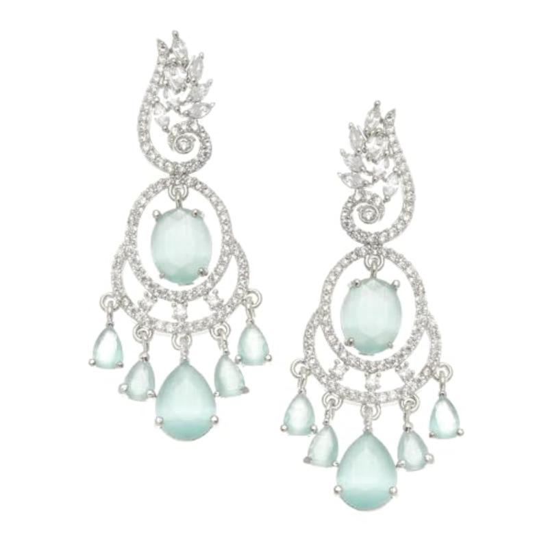Gorgeous rhodium-plated earrings with American diamond studded oval and leaf shapes.